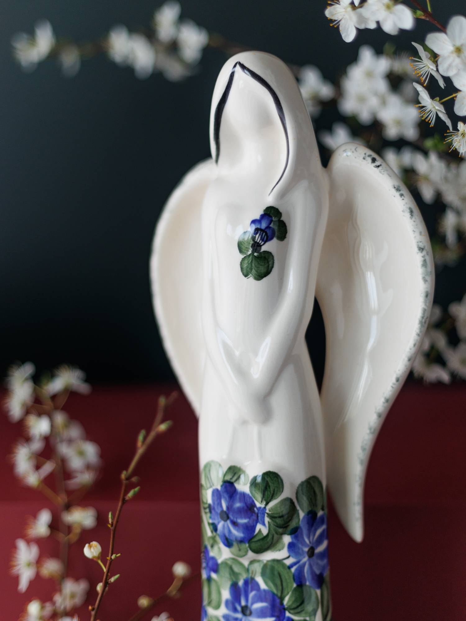 Fajansowy anioł z klasycznym, kobaltowo-zielonym wzorem kwiatowym.