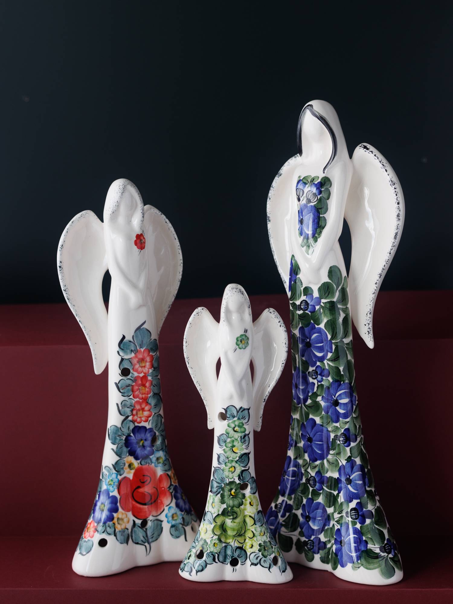 Ceramiczny anioł średniej wielkości, ozdobiony ręcznie malowanym, kolorowym wzorem z fajansu Włocławek.