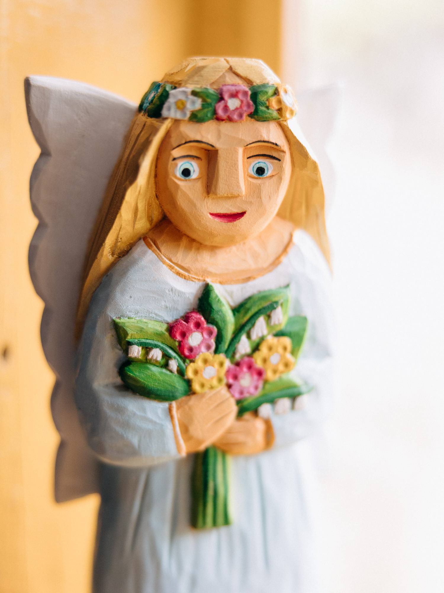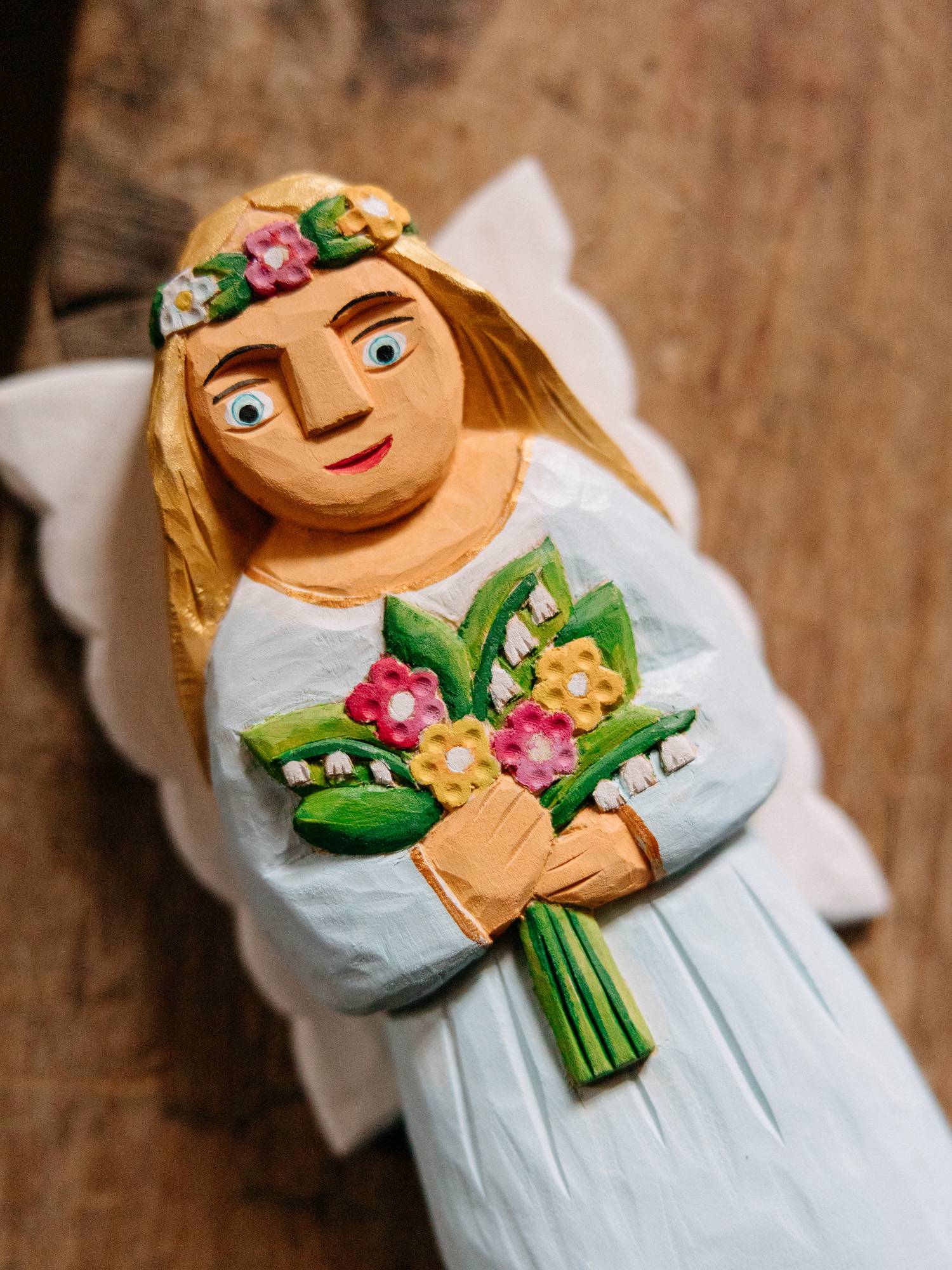 Ręcznie wykonana rzeźba przedstawiająca anioła trzymającego bukiet kwiatków.