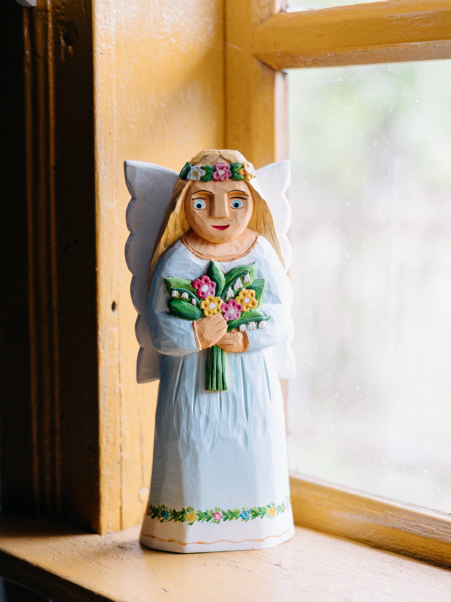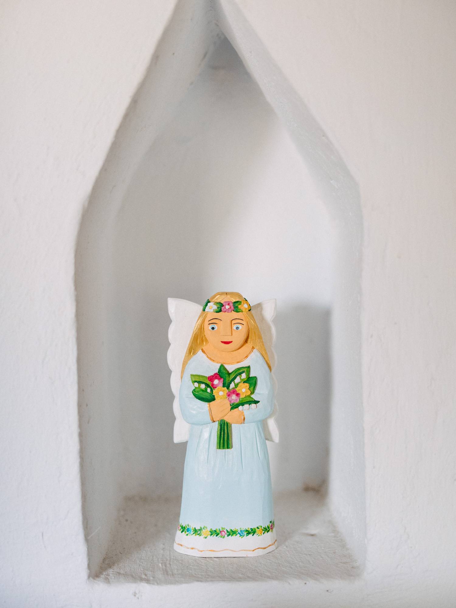 Ręcznie wykonana, 25-centymetrowa rzeźba przedstawiająca postać anioła. Aniołek został uwieczniony z bukietem kwiatów w ręku, ubrany w błękitną sukienkę, zdobioną delikatnymi, kwiatowymi detalami. Całość została wykonana przez rzeźbiarkę z okolic Łowicza.