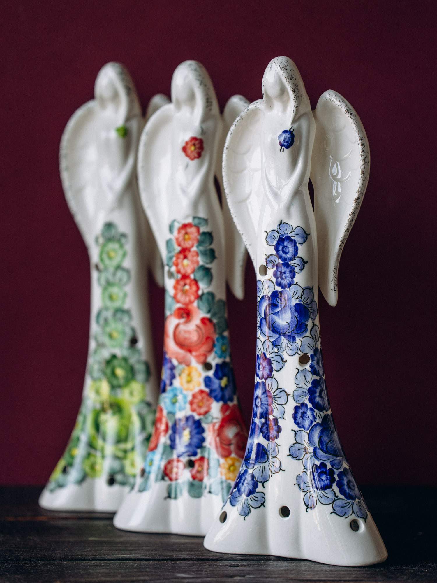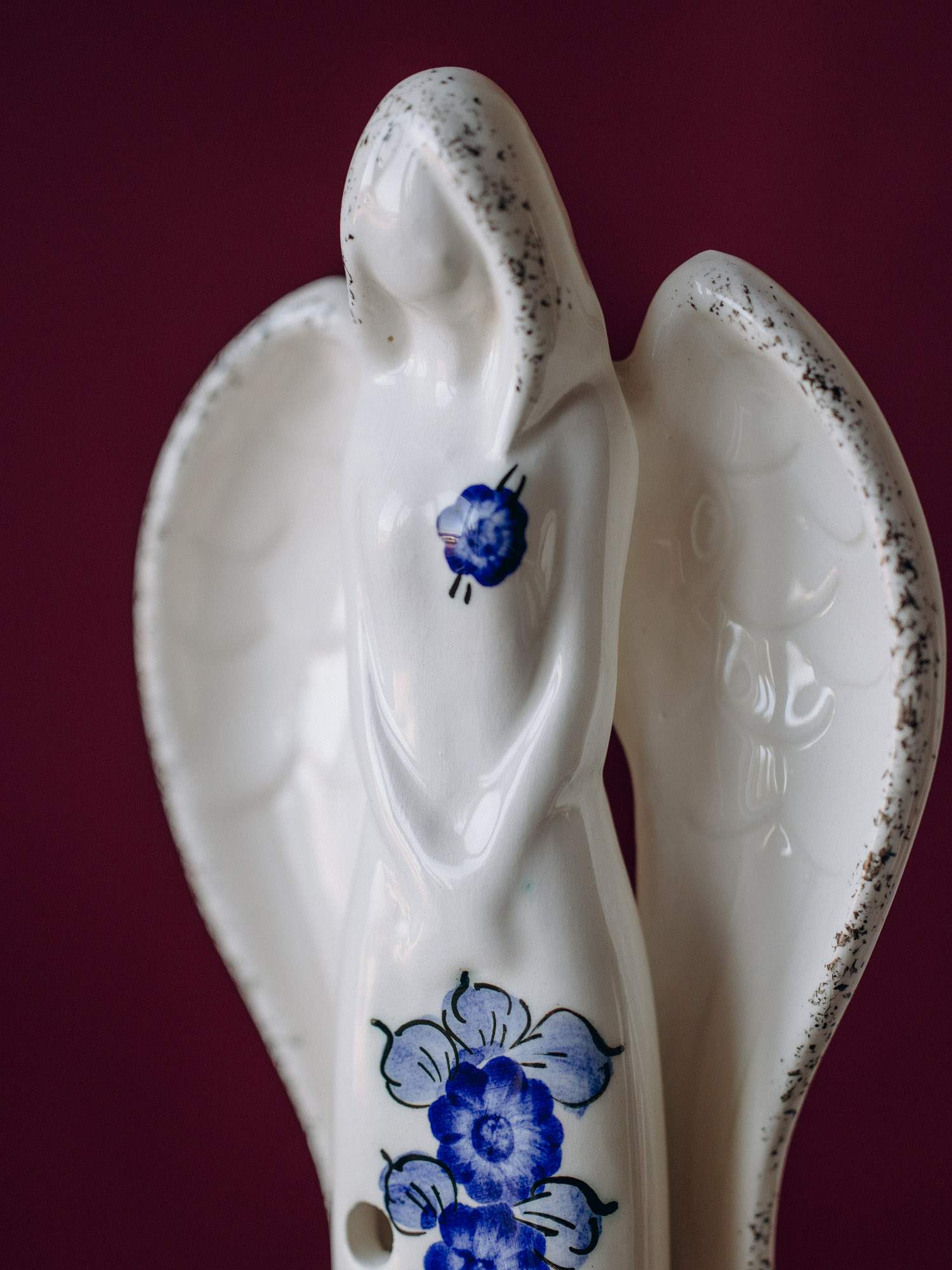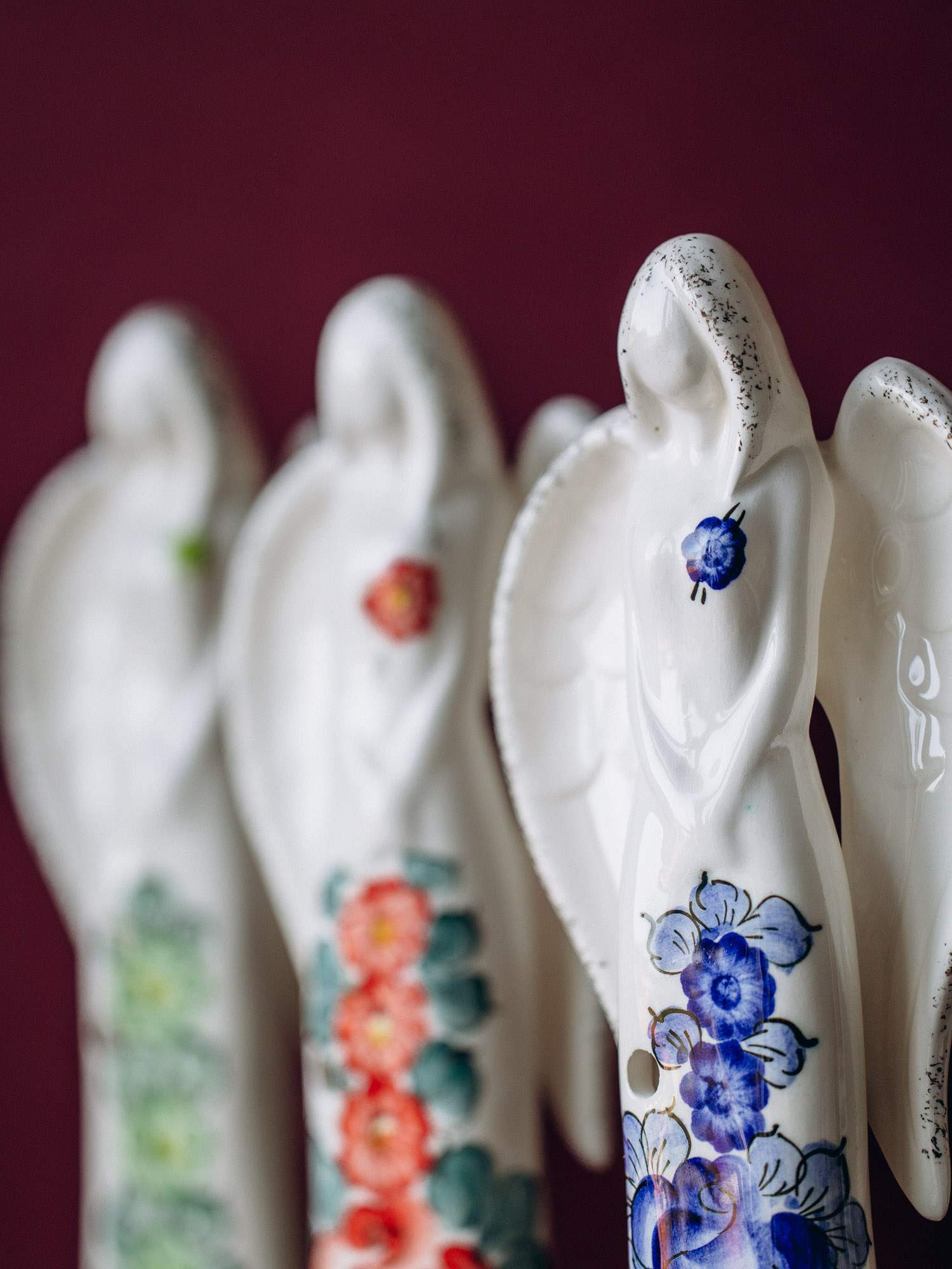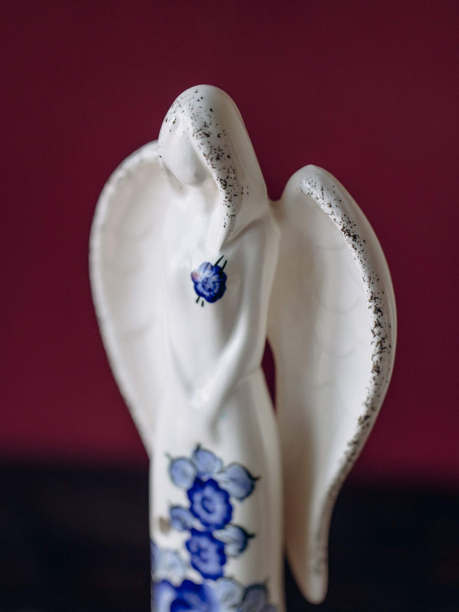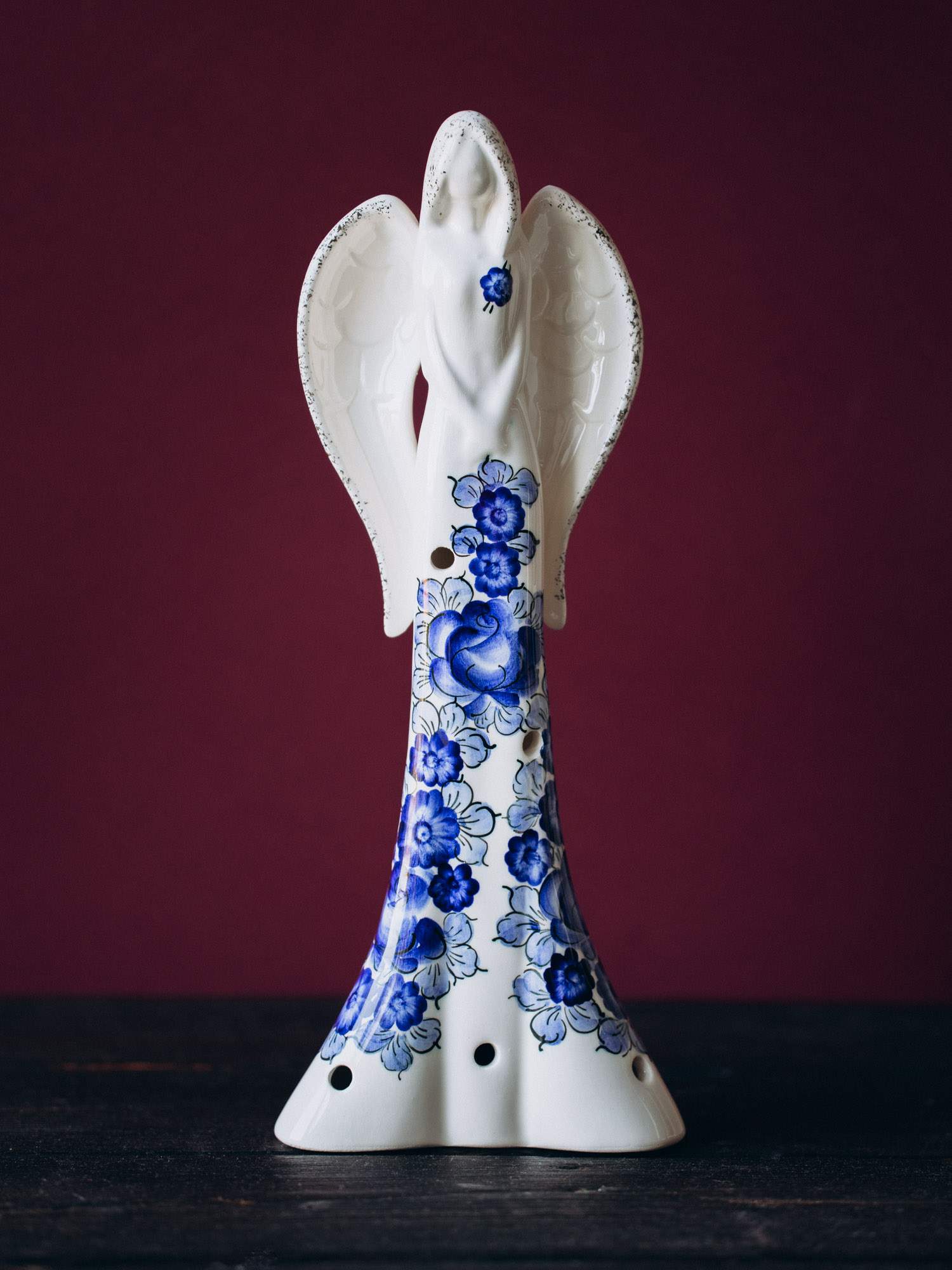 Ceramiczny anioł średniej wielkości, ozdobiony ręcznie malowanym, kobaltowym wzorem z fajansu Włocławek.