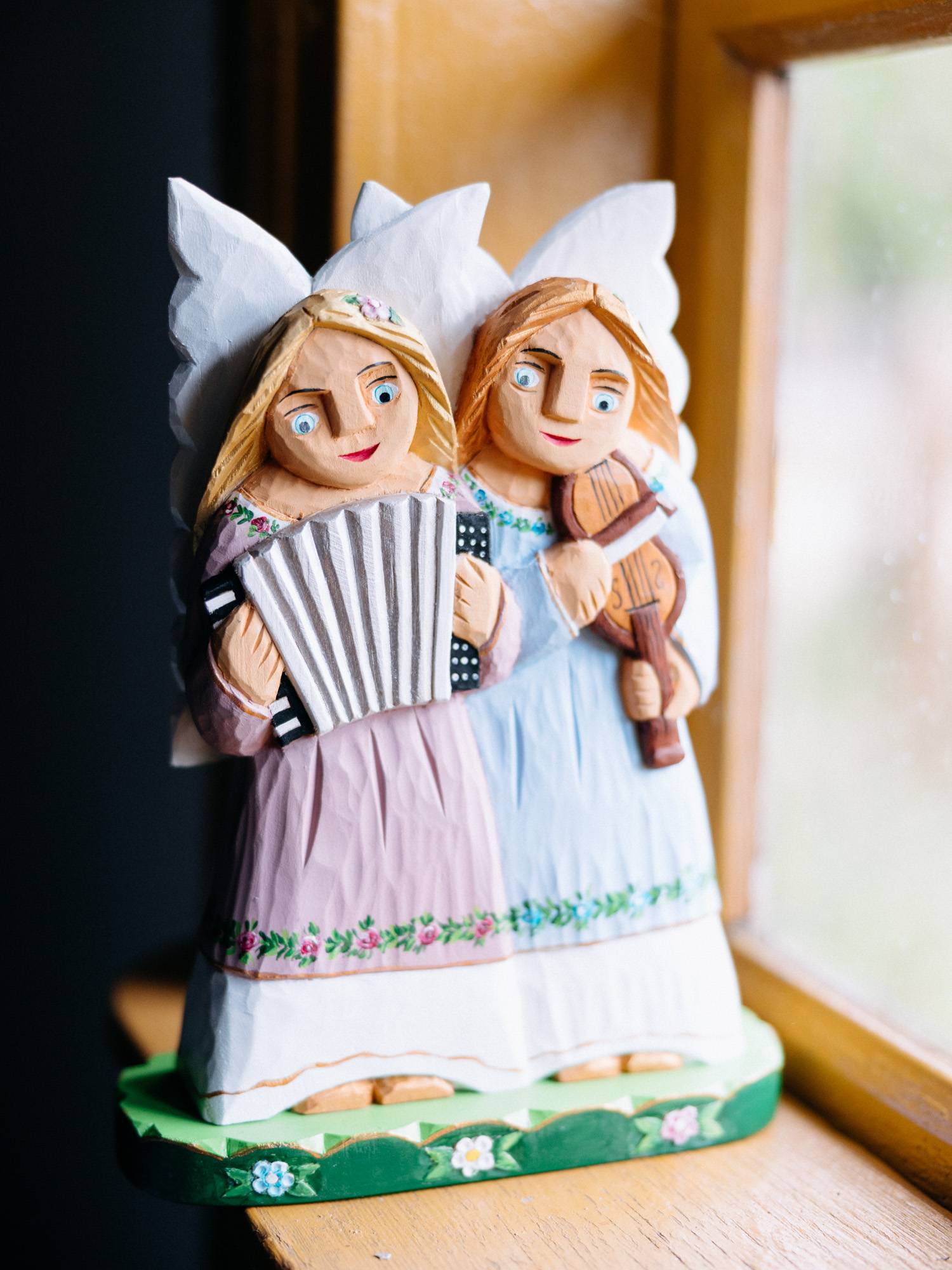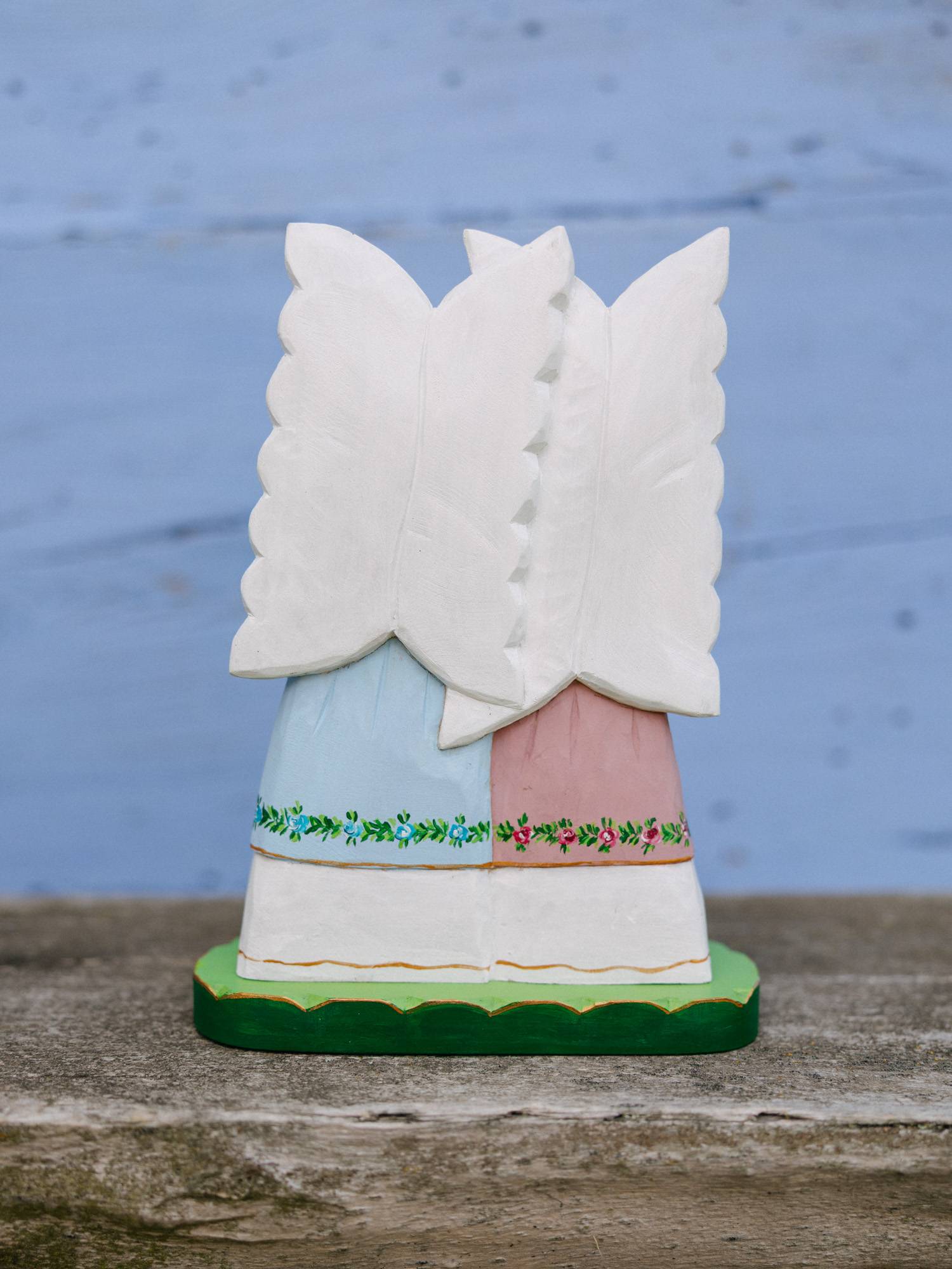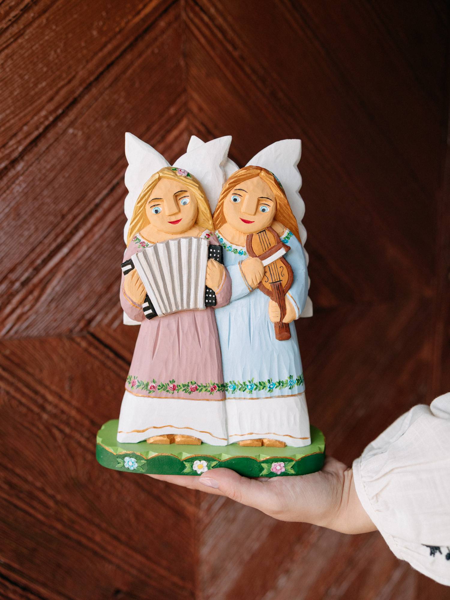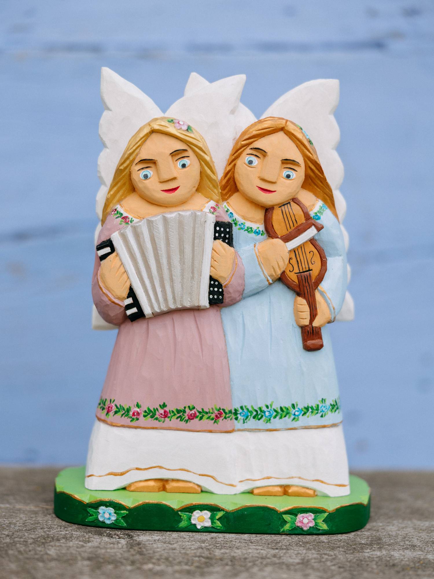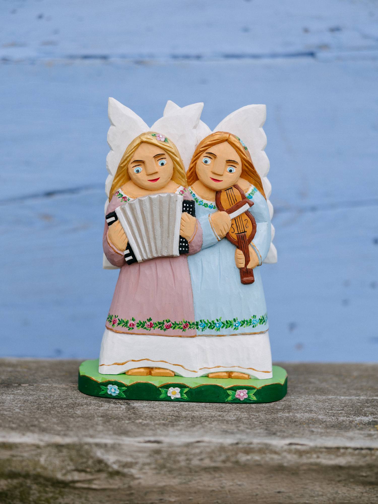 Para aniołów ręcznie rzeźbiona, wykonana z drewna lipowego oraz farb akrylowych. Przedstawia anioły ubrane w różowo-niebieskie sukienki, zdobione kolorowymi kwiatkami. W ręku trzymają instrumenty muzyczne. Całość została wykonana przez rzeźbiarkę z okolic Łowicza.