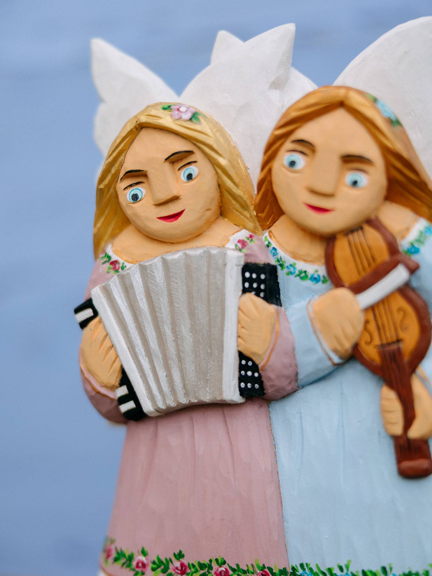 Ręcznie wykonana rzeźba przedstawiająca anioły grające na instrumentach.