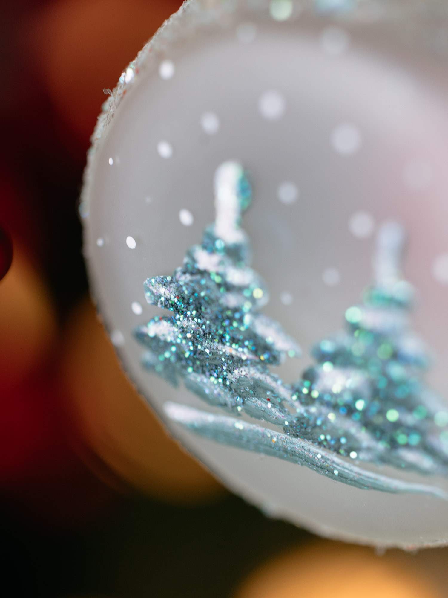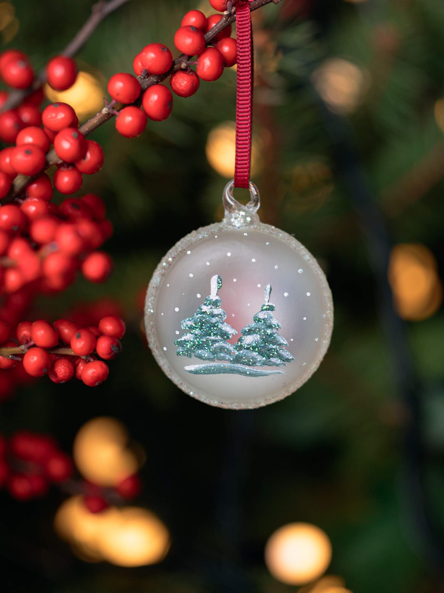 Ozdoba wykonana ze szkła w matowym odcieniu bieli. Na bombce znajduję się zimowa wioska z czerwonym kościółkiem, pokrytna śniegiem i delikatnie oprószona brokatem. Z drugiej strony znajdują się dwie zielone choinki pokryte śniegiem. Bombka została wykonana przez malarkę z okolic Łowicza.