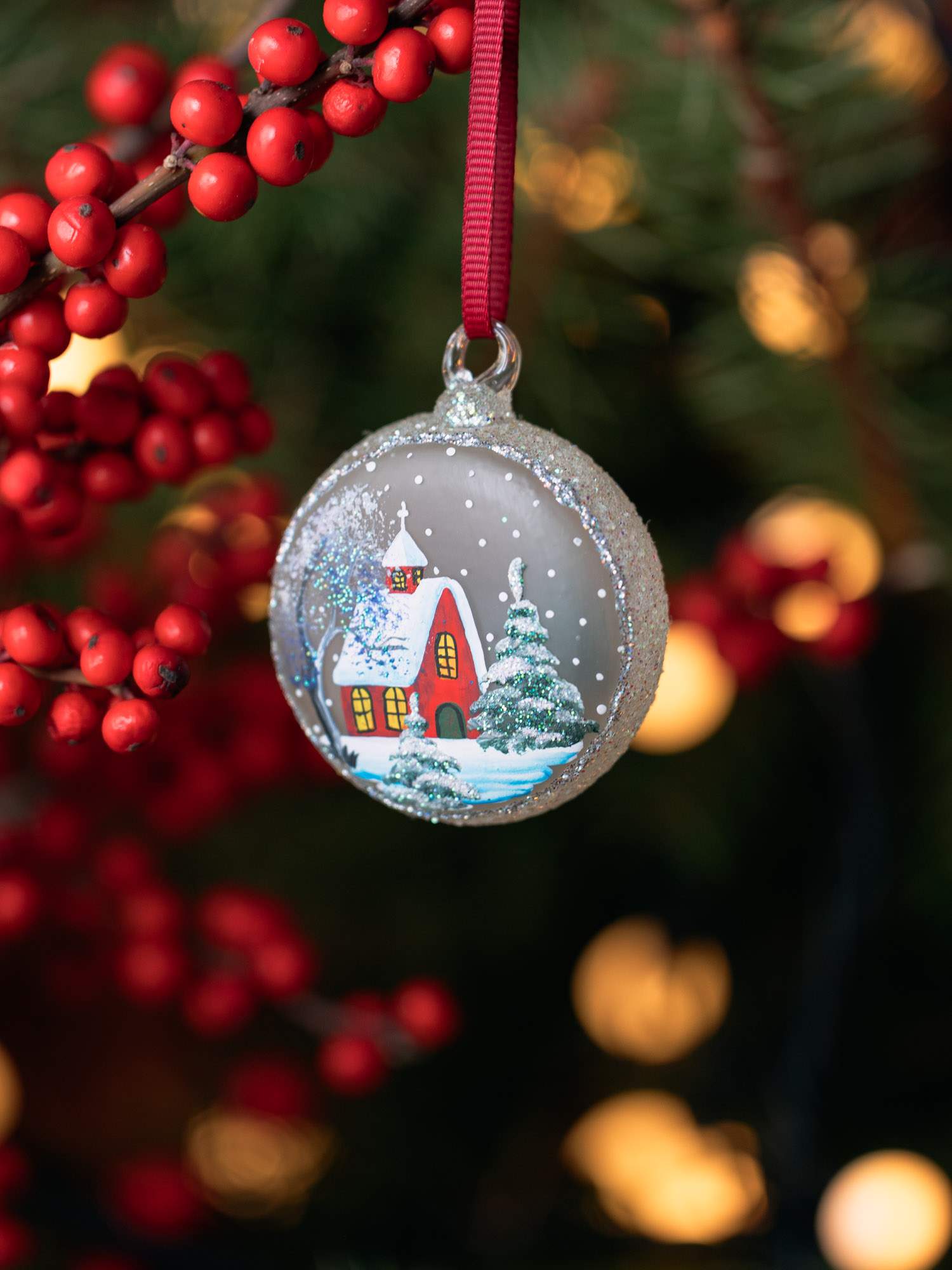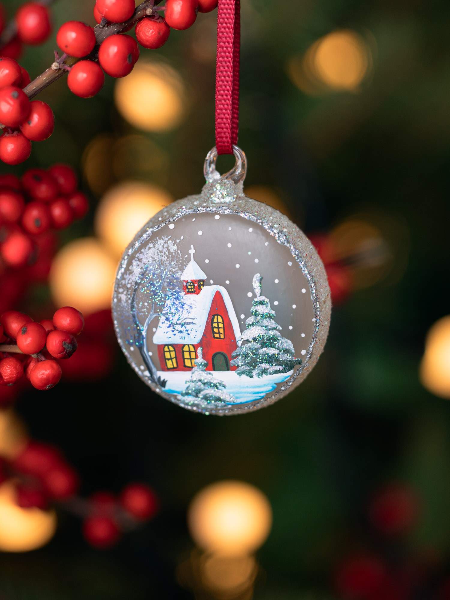Okrągła szklana bombka matowa z ręcznie malowanym motywem kościółka w zimowej scenerii i brokatowym wykończeniem.