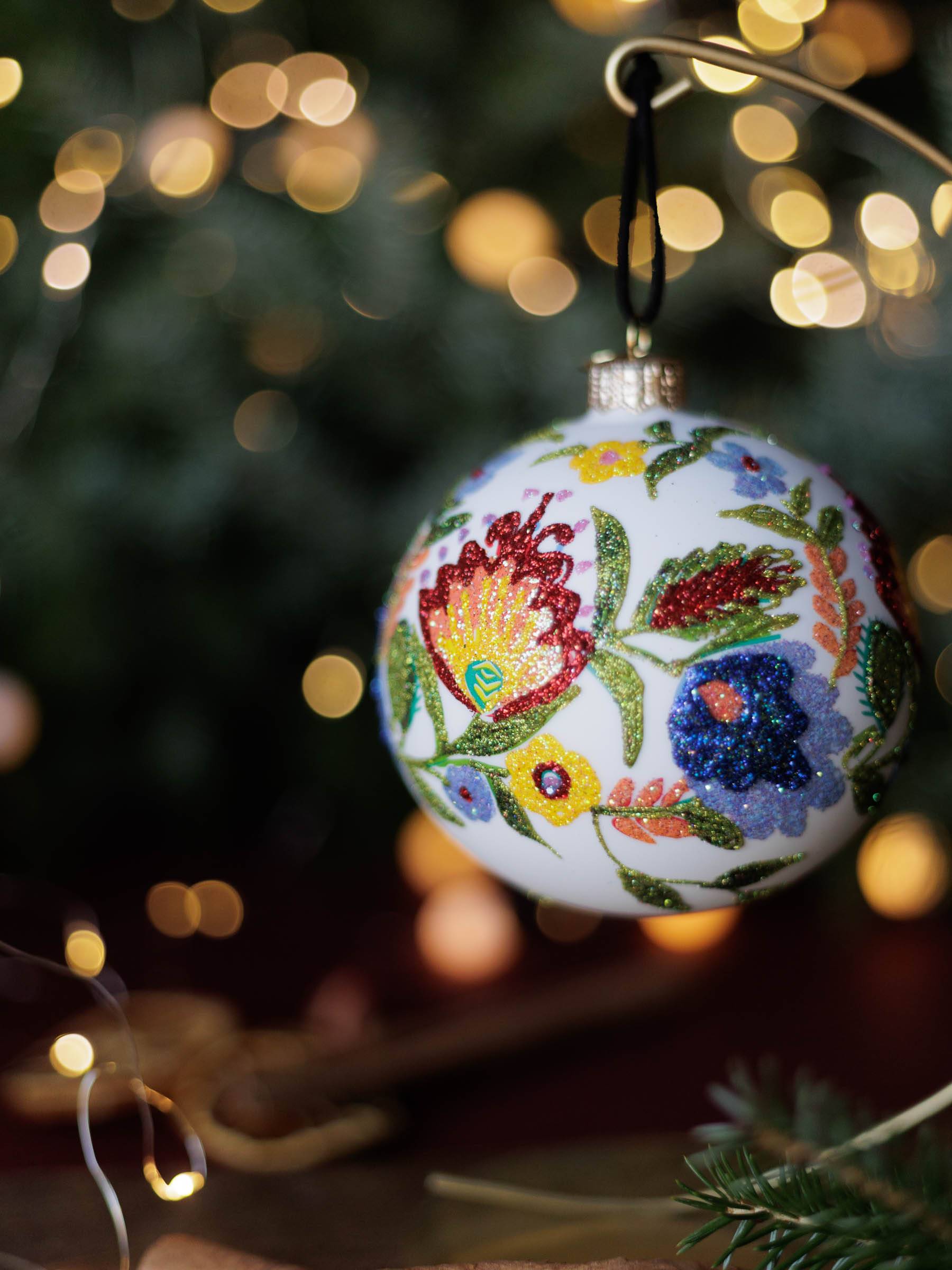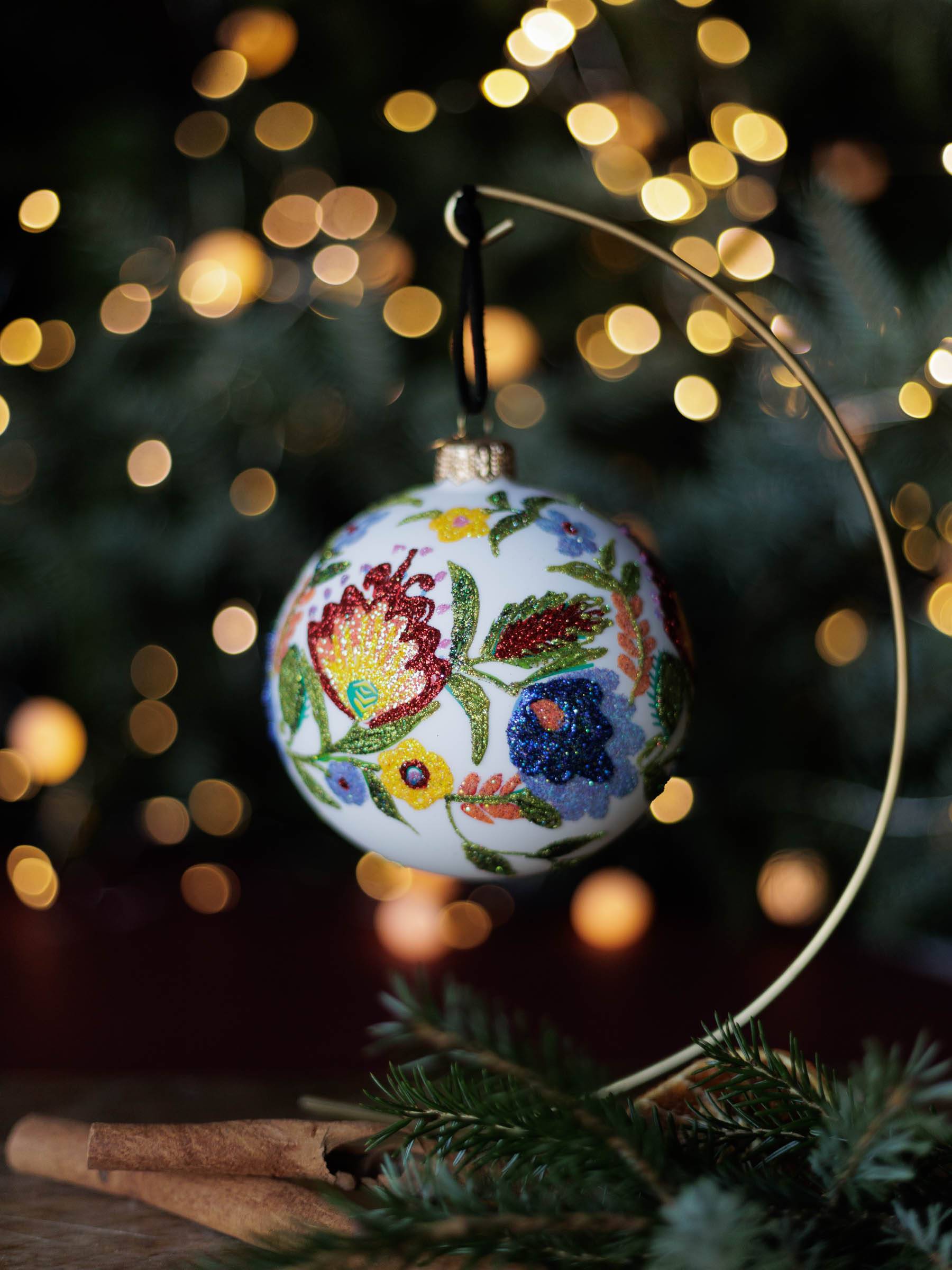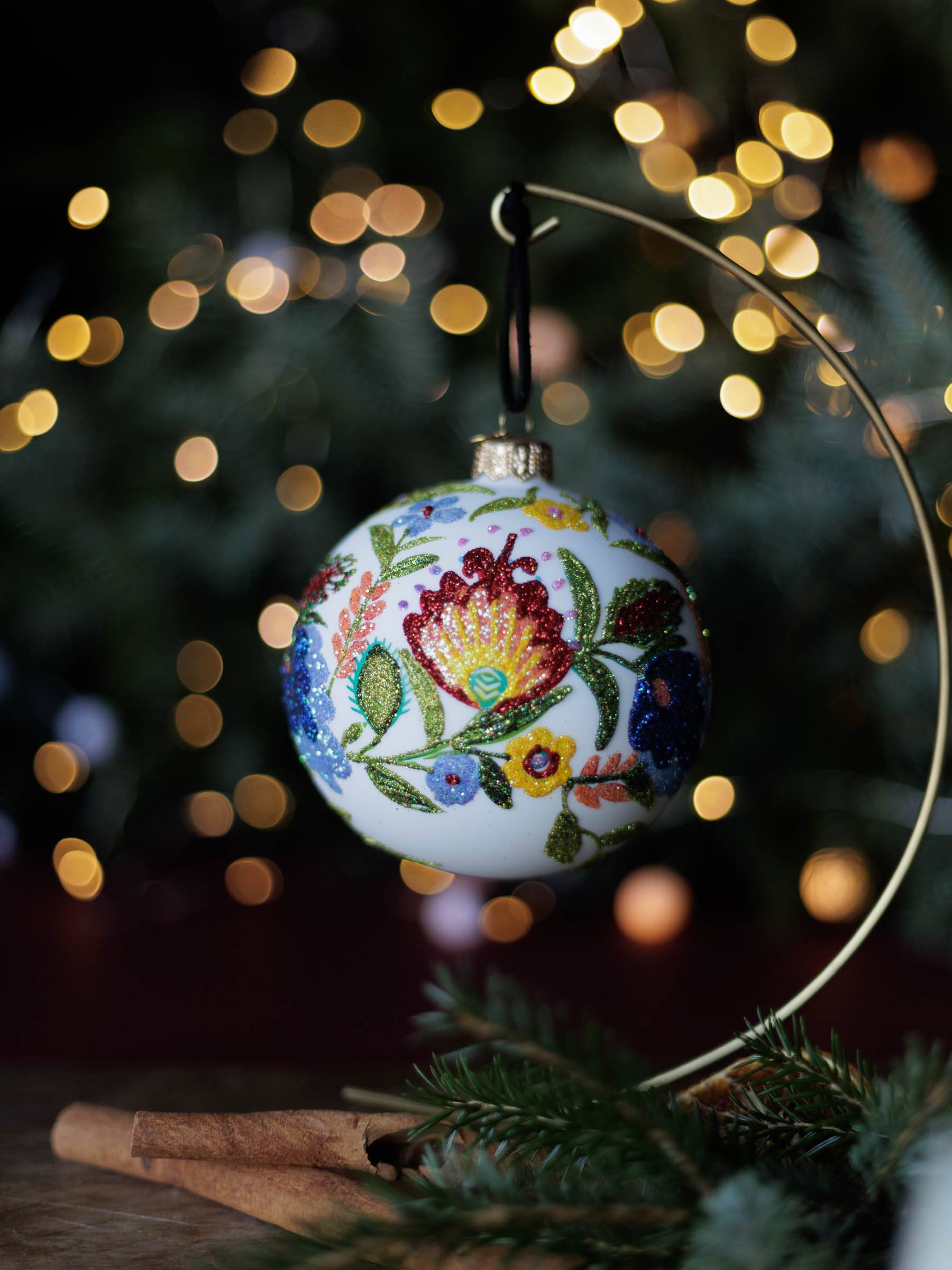 Szklana bombka w białym kolorze, pokryta ręcznie wykonanym zdobieniem, inspirowanym łowicką wycinanką w formie kwiatów. Wzór pokrywa całą bombkę dookoła. Zdobienie wykonano z użyciem brokatowych detali, które pięknie odbijają błysk światełek choinkowych. Ozdoba posiada metalowy zaczep w złotym kolorze, który umożliwia umieszczenie jej na stojaku czy bożonarodzeniowej choince.