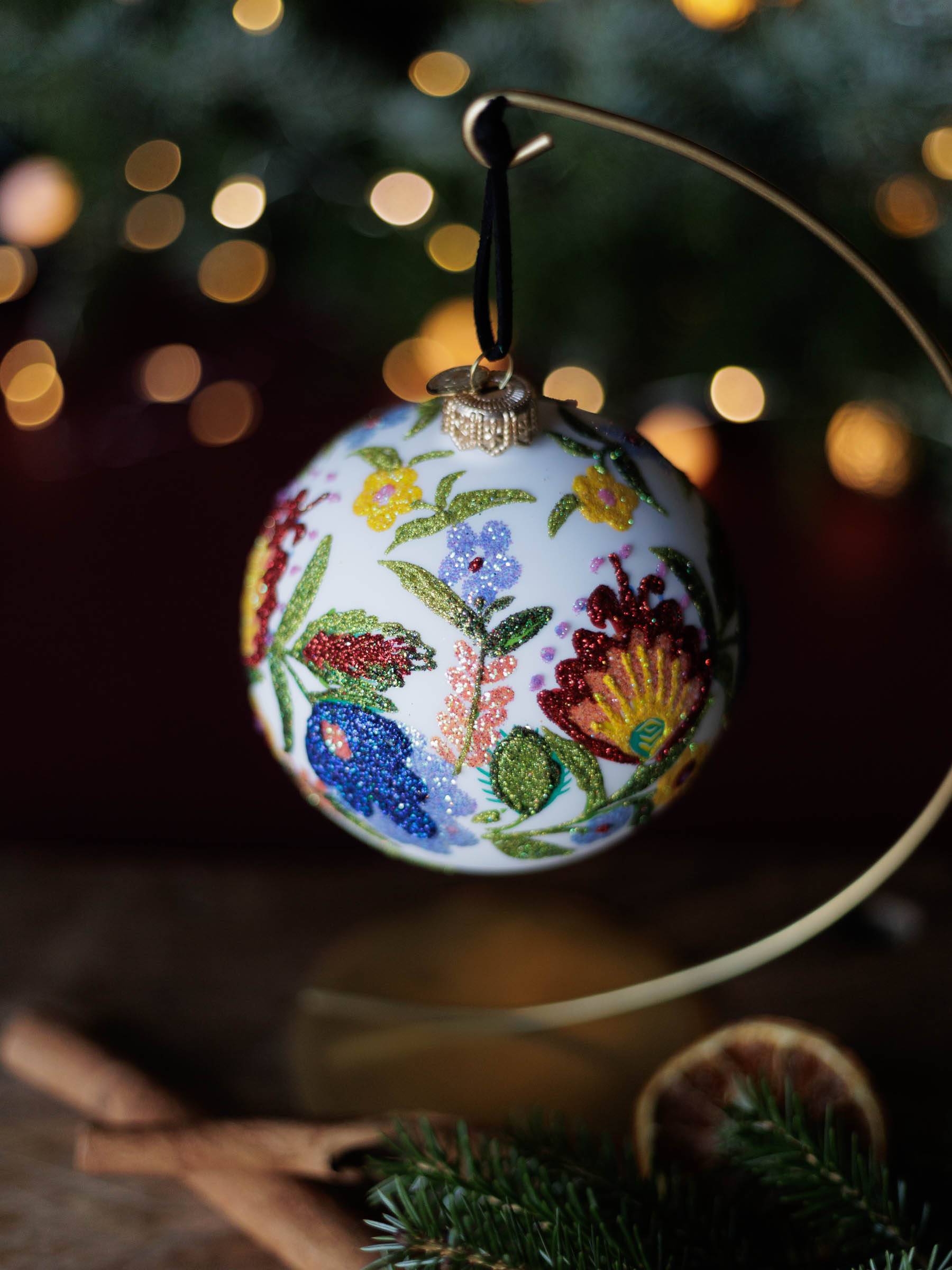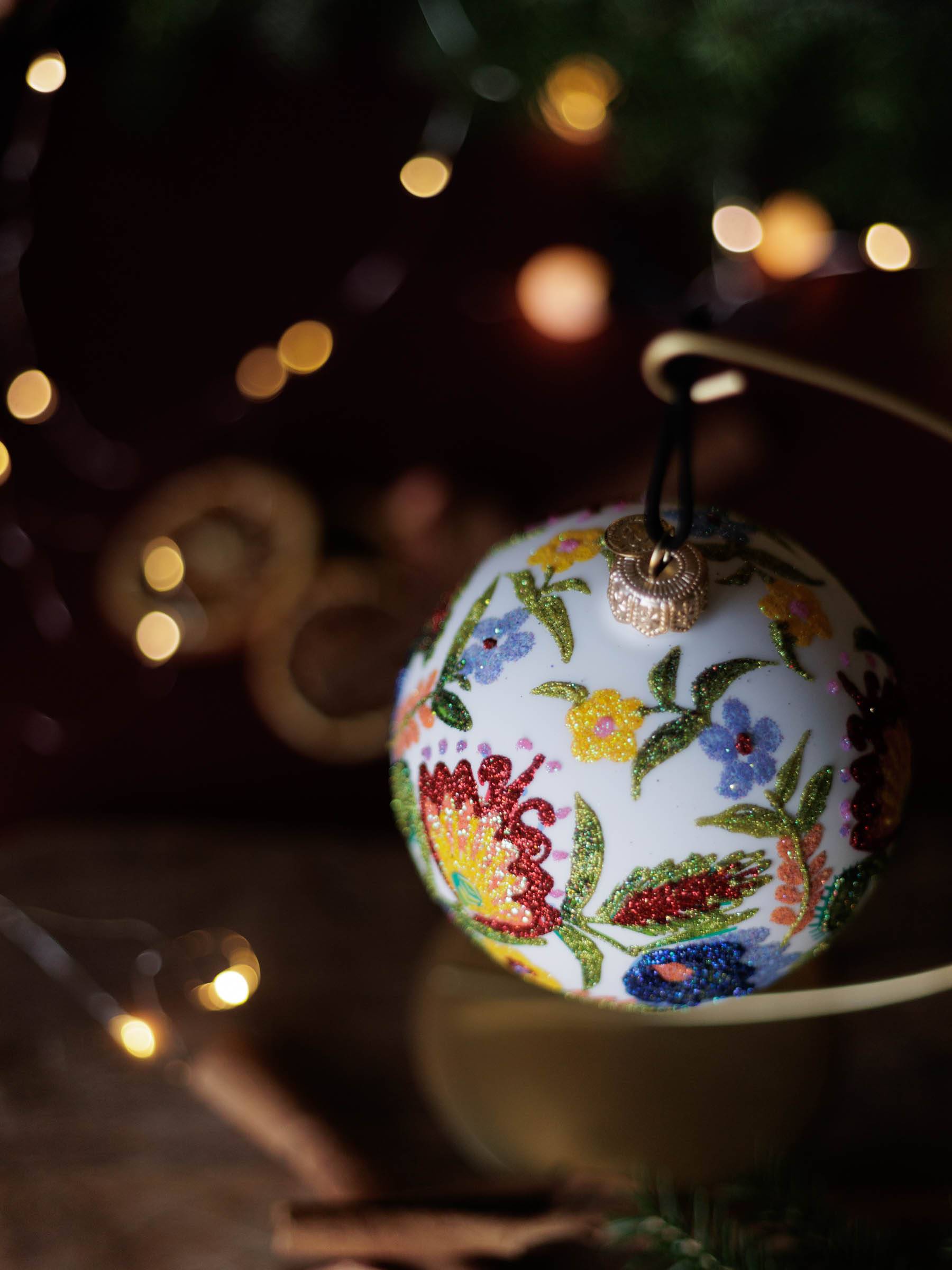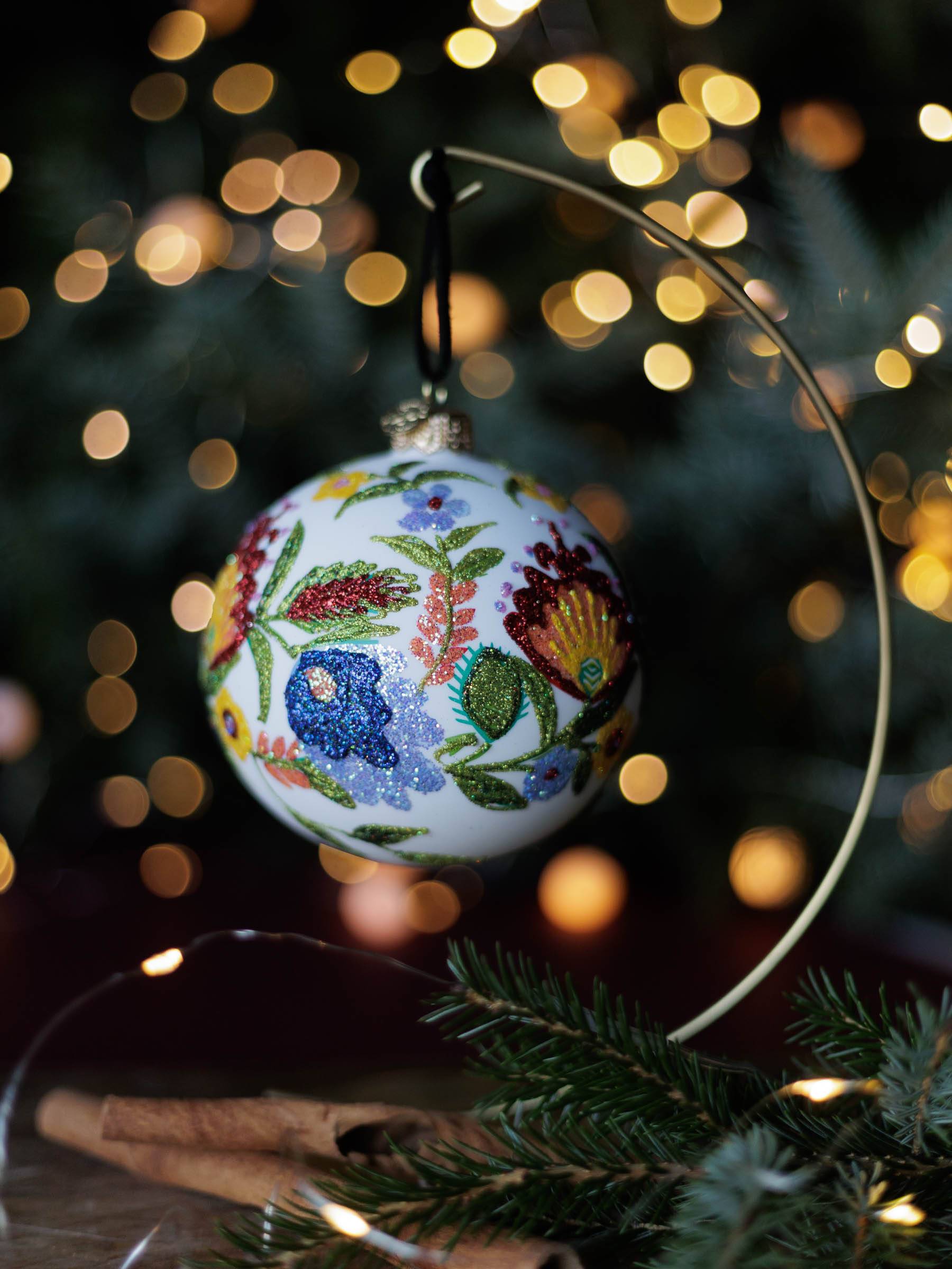 Szklana bombka w białym kolorze, pokryta ręcznie wykonanym zdobieniem, inspirowanym łowicką wycinanką w formie kwiatów. Wzór pokrywa całą bombkę dookoła. Zdobienie wykonano z użyciem brokatowych detali, które pięknie odbijają błysk światełek choinkowych. Ozdoba posiada metalowy zaczep w złotym kolorze, który umożliwia umieszczenie jej na stojaku czy bożonarodzeniowej choince.