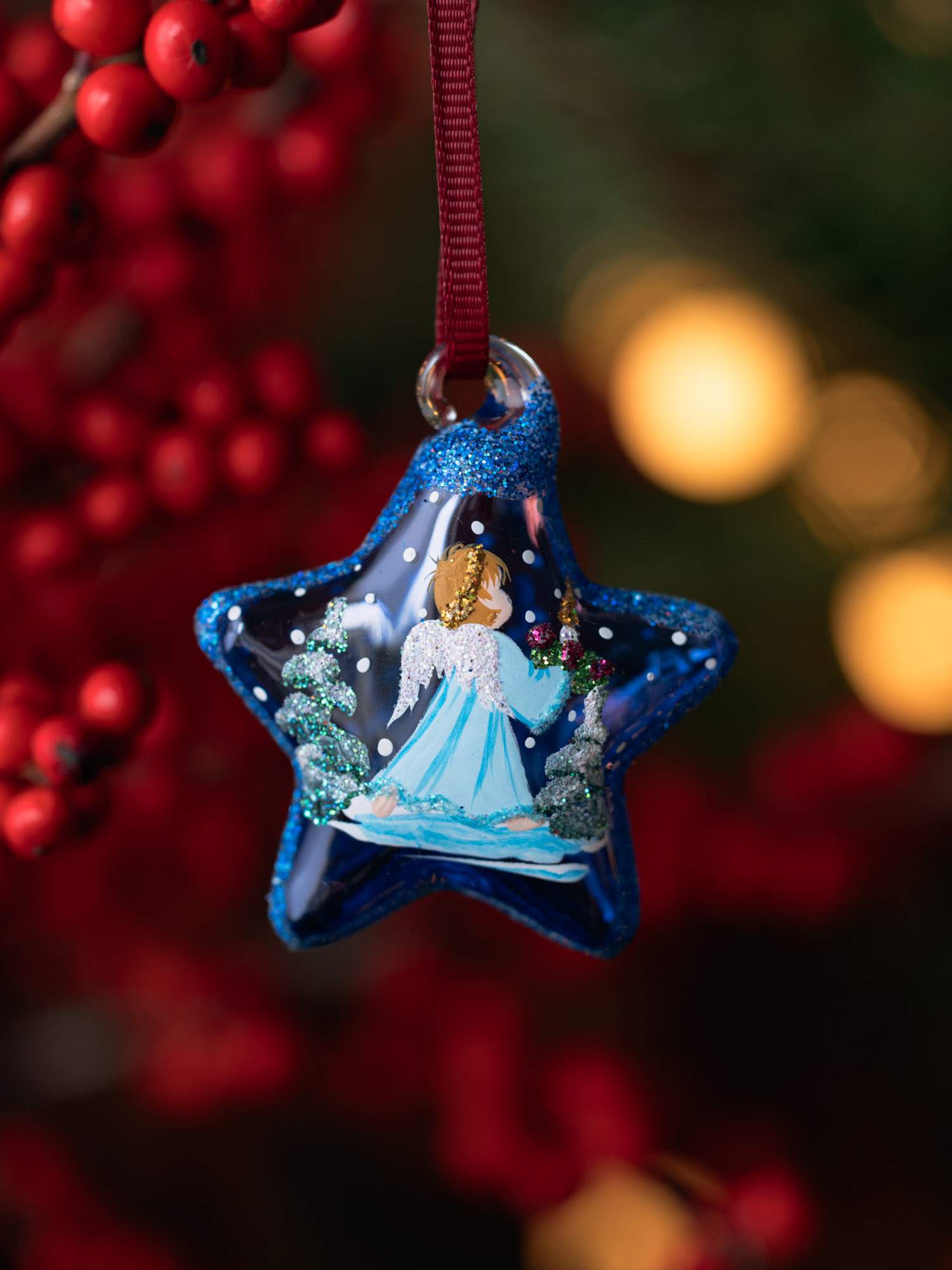 Mała, ręcznie malowana szklana bombka niebieska w kształcie gwiazdy z motywem aniołka.