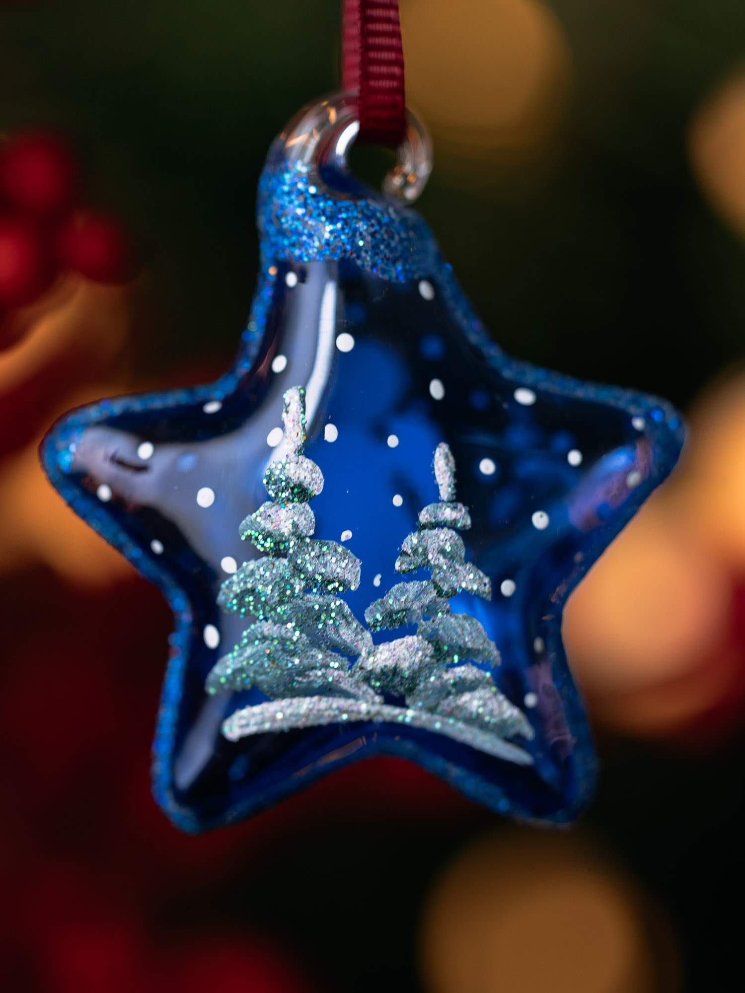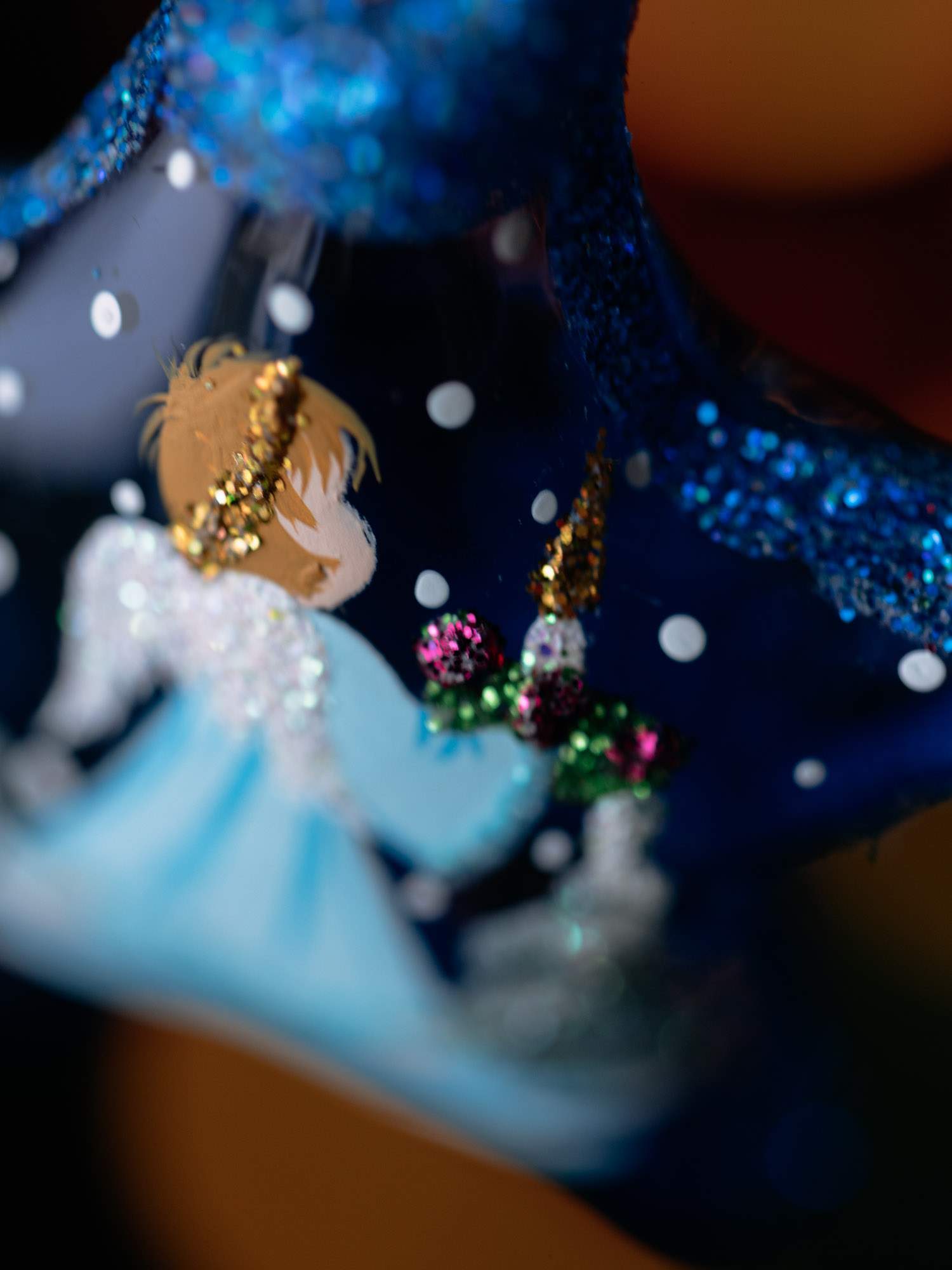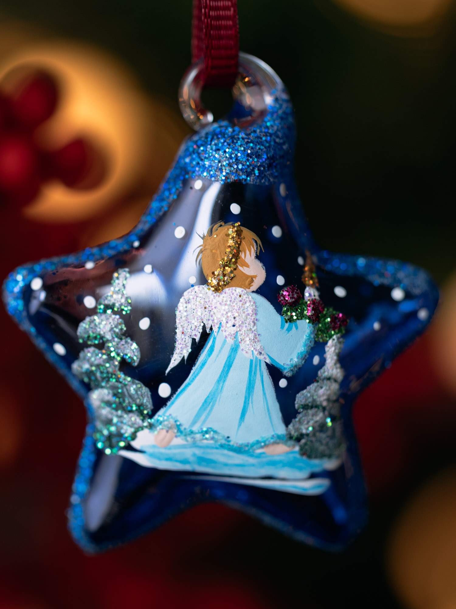 Szklana bombka w kształcie gwiazdki została wykonana ręcznie, ozdobiona motywem aniołka okrytego zimową aurą. Z drugiej strony znajdują się dwie zielone choinki pokryte śniegiem. Niebieski kolor podkreśla świetliste wykończenie i brokatowe akcenty. Bombka została wykonana przez malarkę z okolic Łowicza.