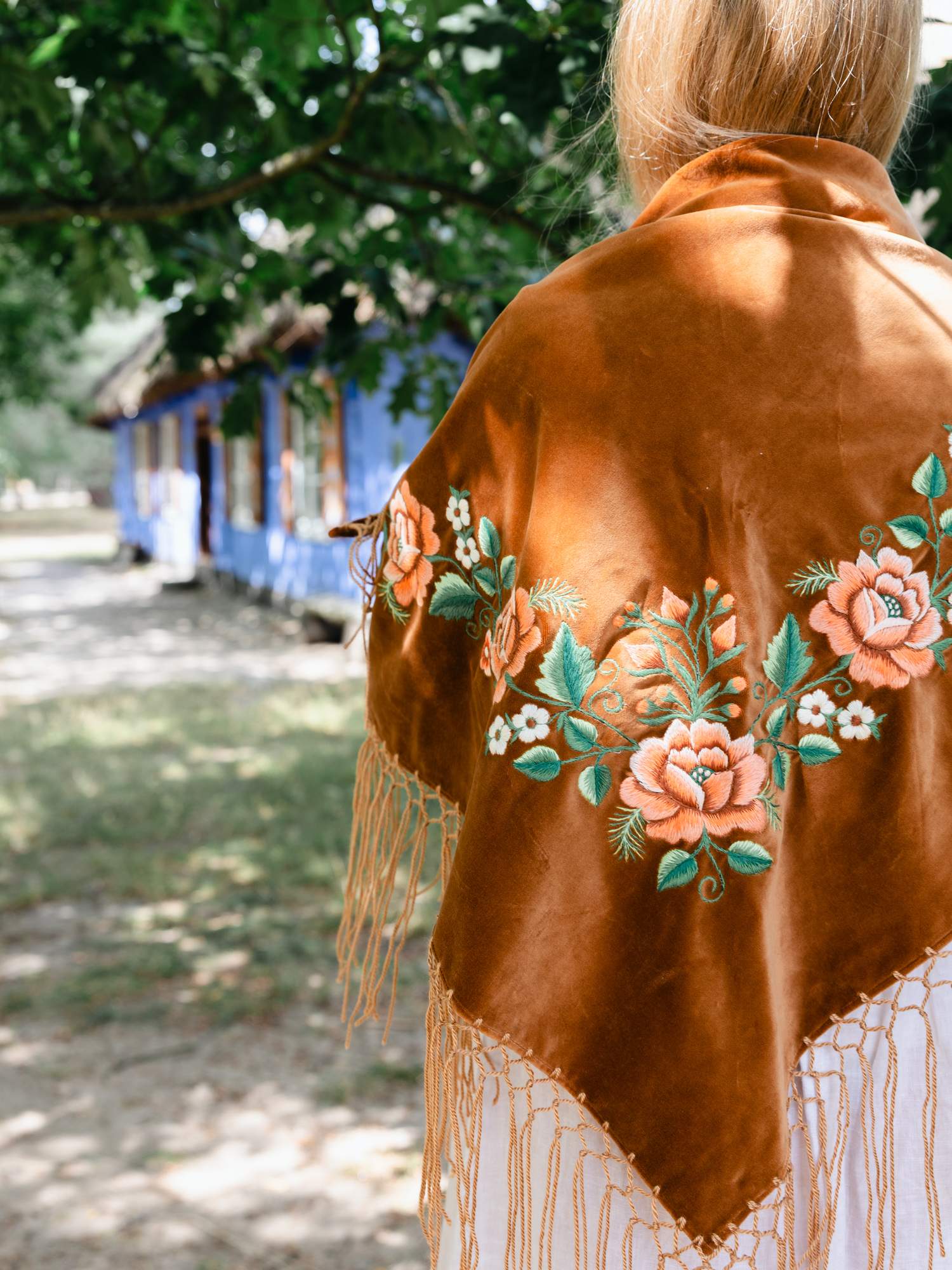 Duża, aksamitna chusta w łososiowym kolorze, ozdobiona haftem łososiowych róż z białymi kwiatkami. Chusta posiada długie, wełniane frędzle w kolorze dopasowanym do aksamitu. Wyszywane detale zostały wykonane przez hafciarkę z okolic Łowicza.