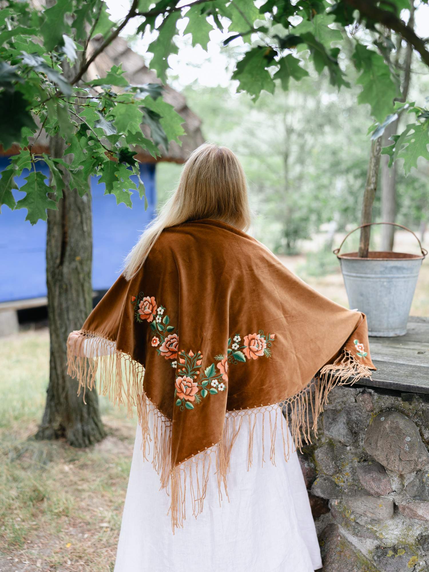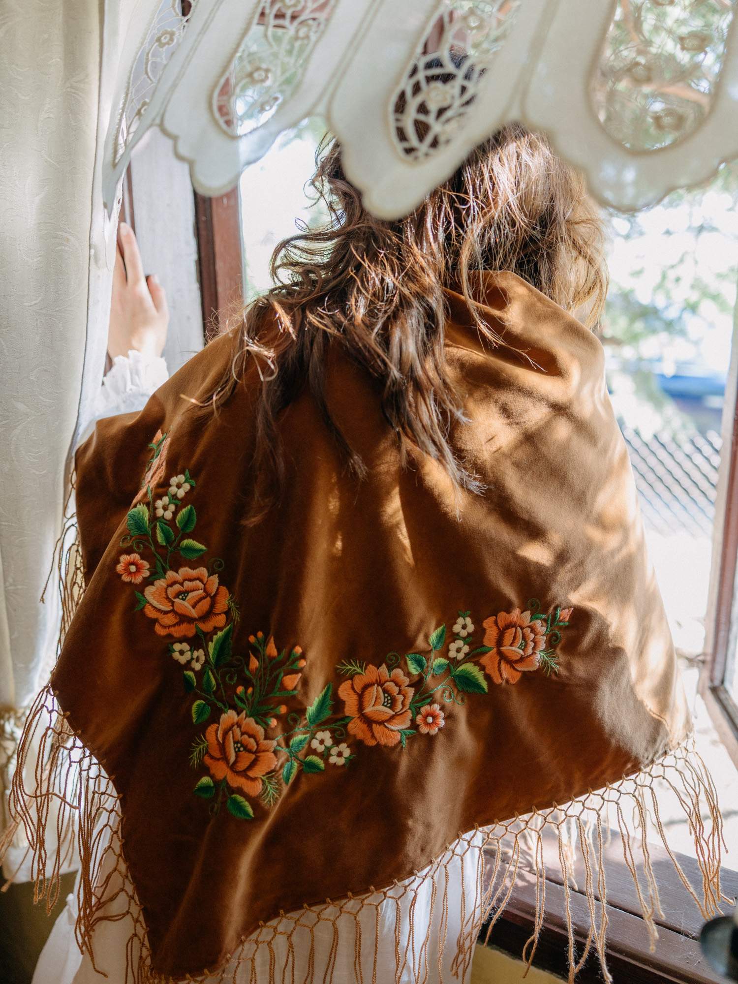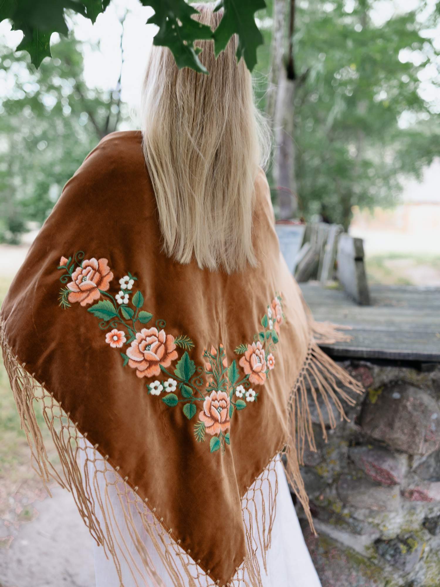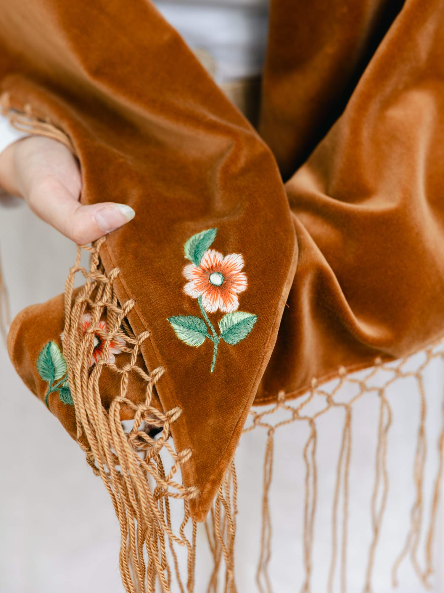 Duża, aksamitna chusta w brązowym kolorze. Ozdobiona haftem łososiowych róż z białymi kwiatkami