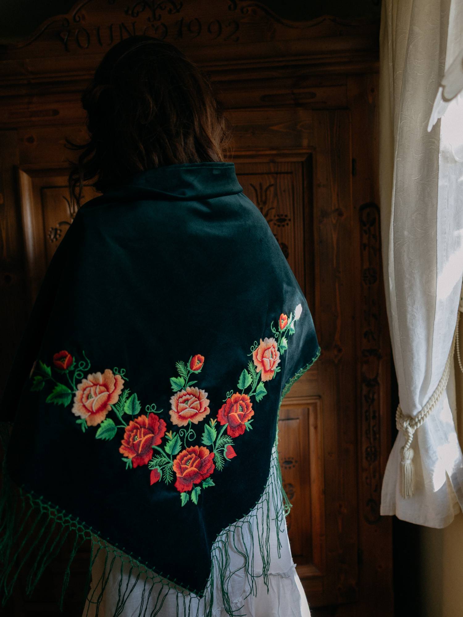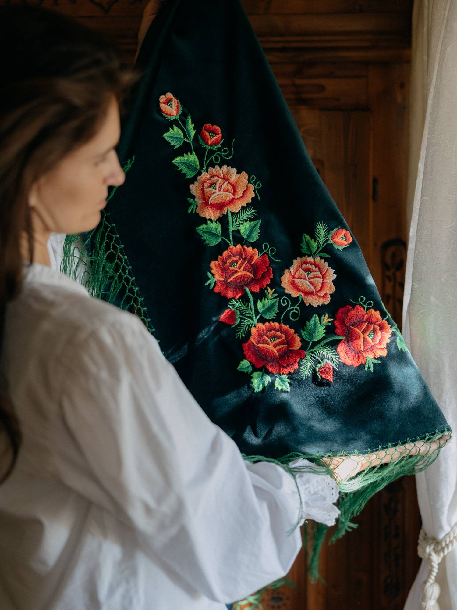 Duża, aksamitna chusta w ciemnozielonym kolorze, ozdobiona haftem czerwonych róż z jasnymi i ciemnymi płatkami. Chusta posiada długie, wełniane frędzle w kolorze dopasowanym do aksamitu. Wyszywane detale zostały wykonane przez hafciarkę z okolic Łowicza.