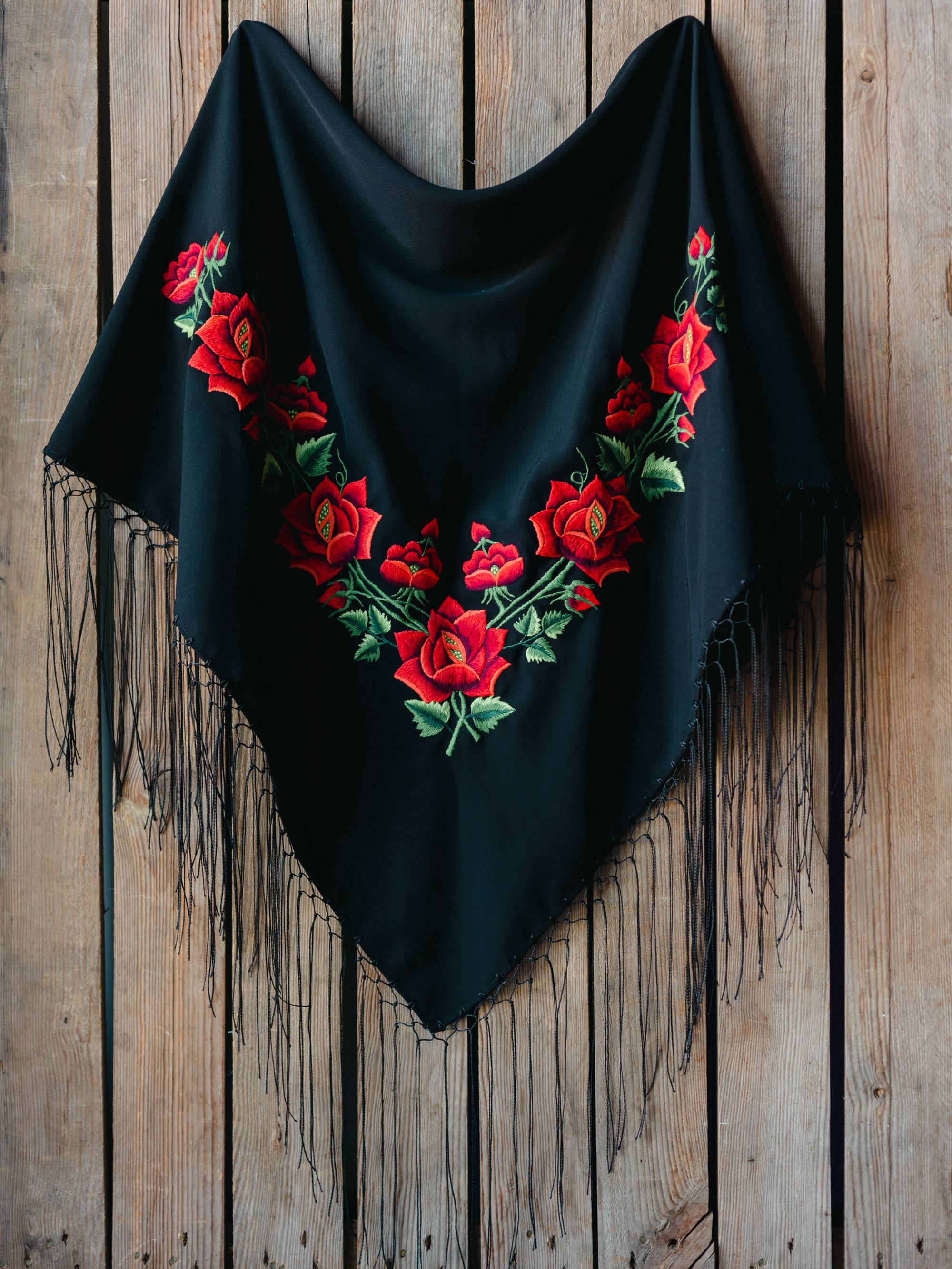 Duża chusta w czarnym kolorze, ozdobiona haftem ciemnoczerwonych róż z ostrymi płatkami.