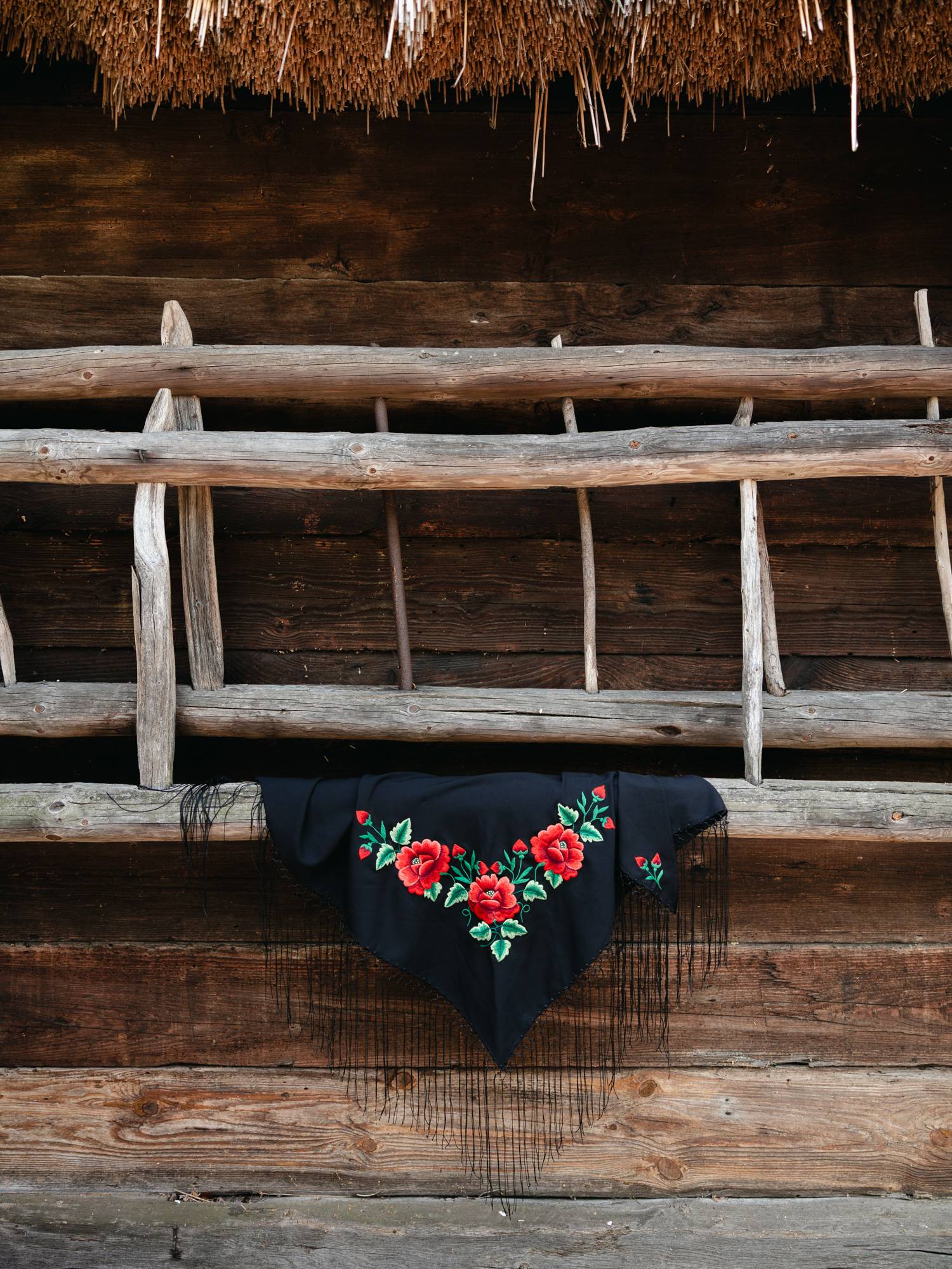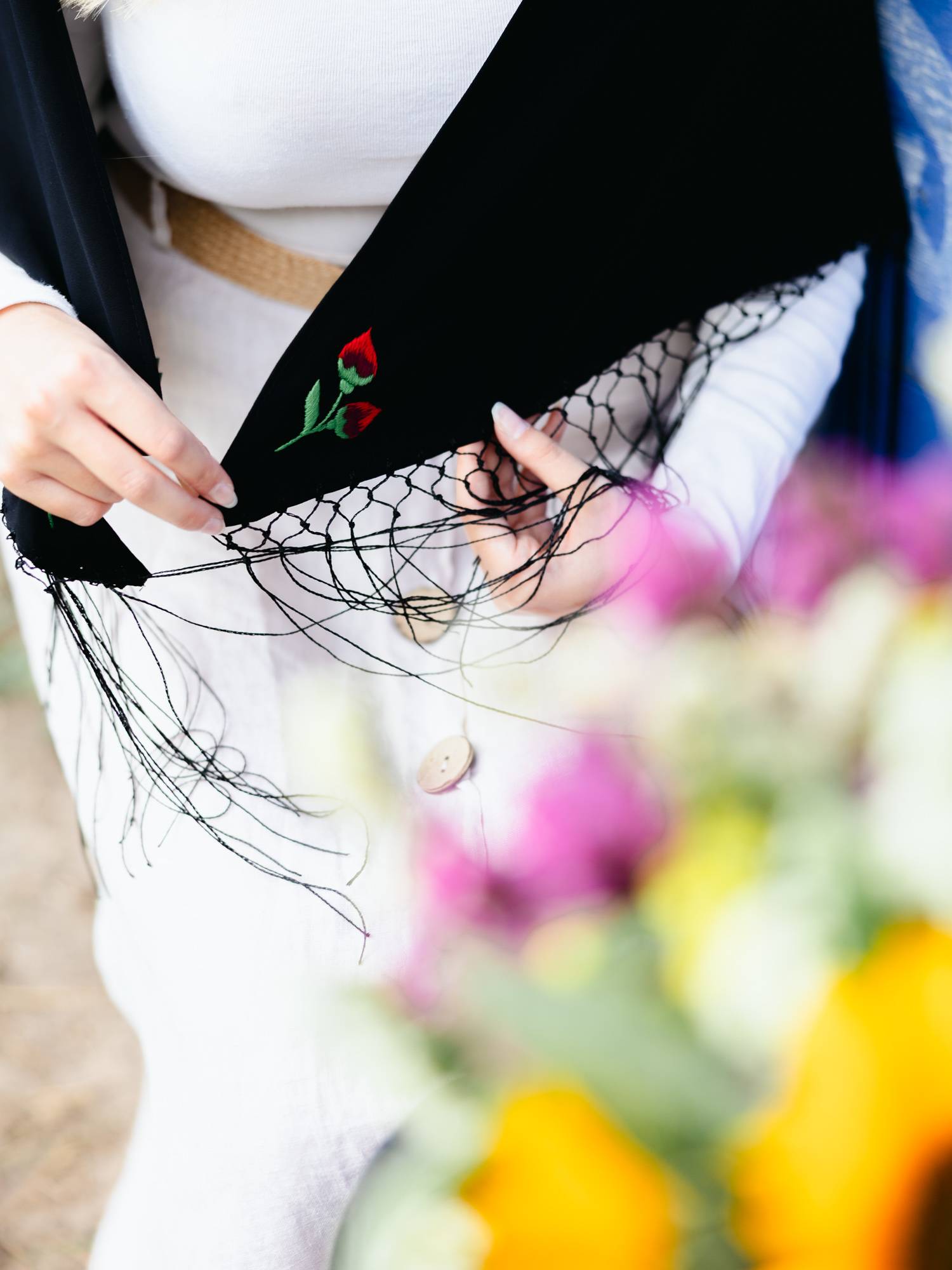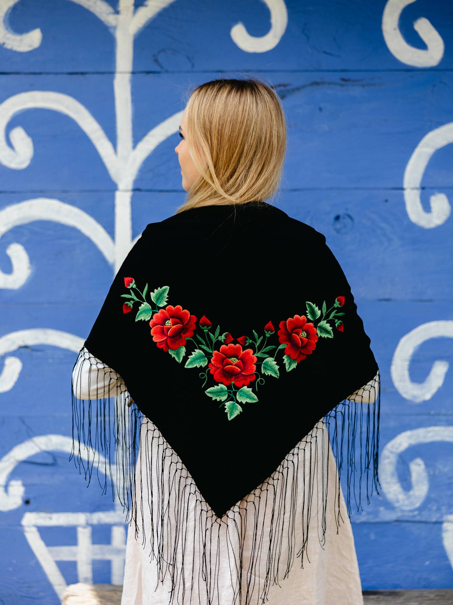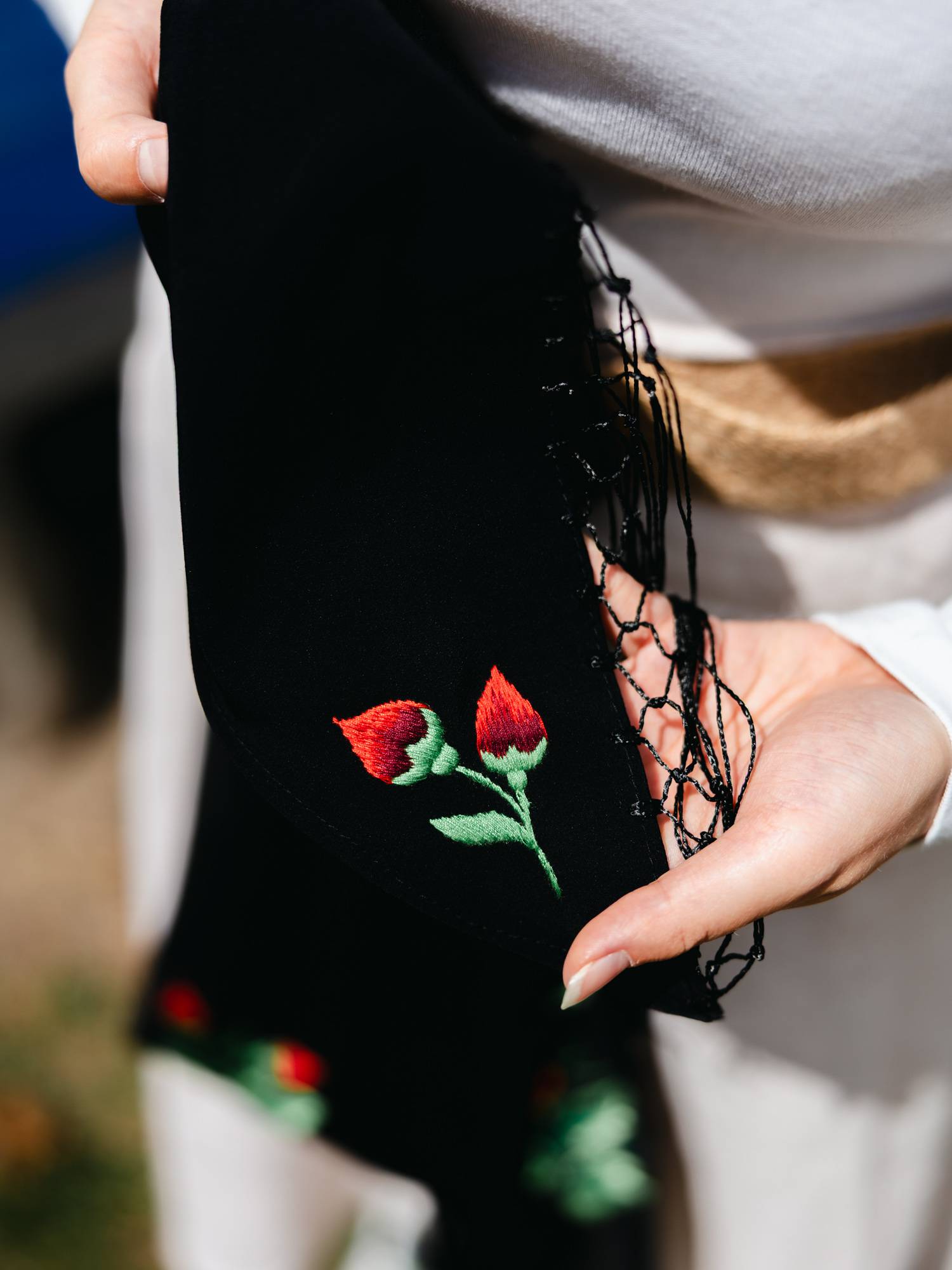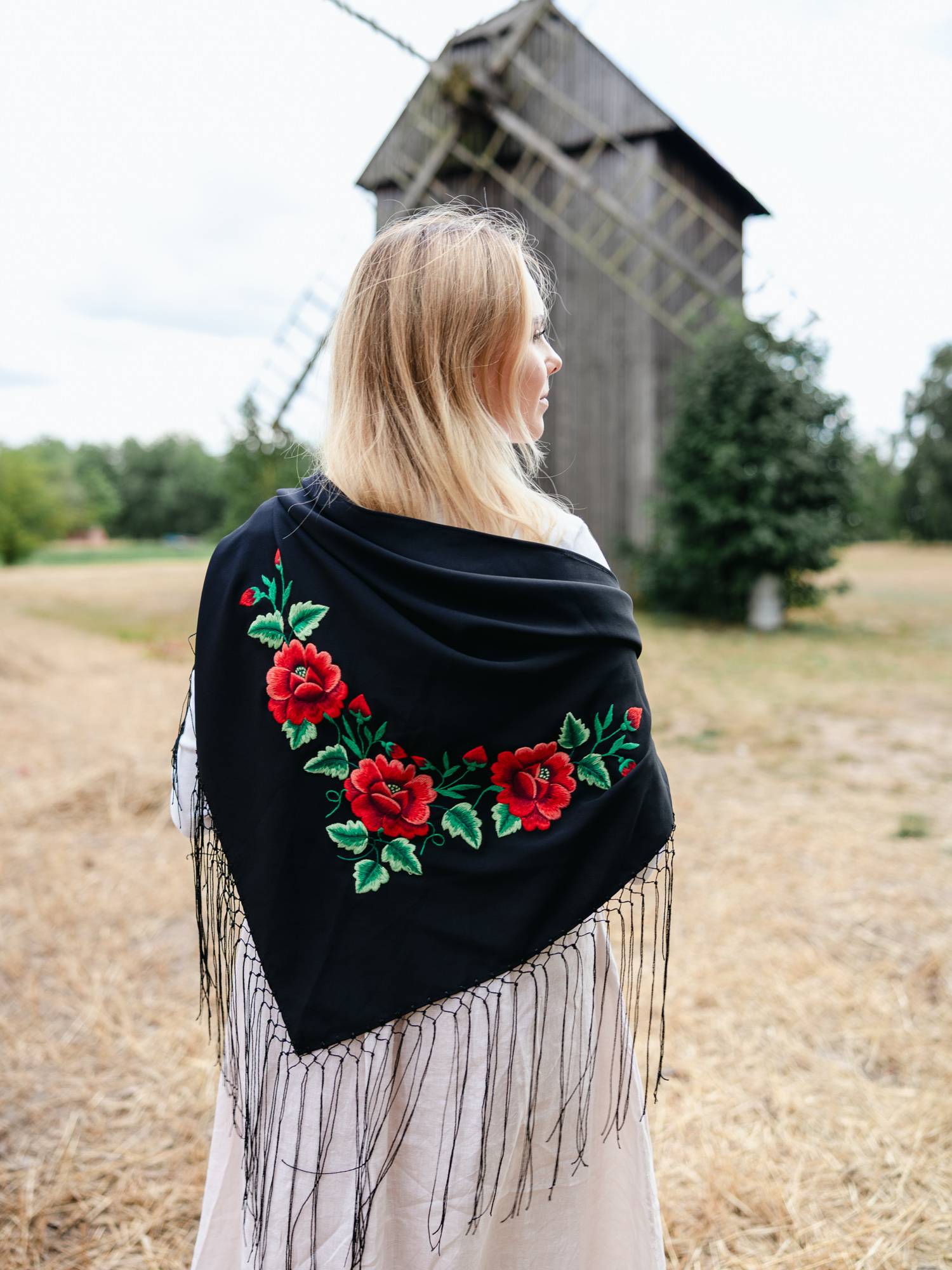 Mała chusta w czarnym kolorze. Ozdobiona wyhaftowanymi ciemnymi różami i jasno zielonymi listkami. Chusta posiada długie, cienkie frędzelki w kolorze czarnym. Wyszywane detale zostały wykonane przez hafciarkę z okolic Łowicza