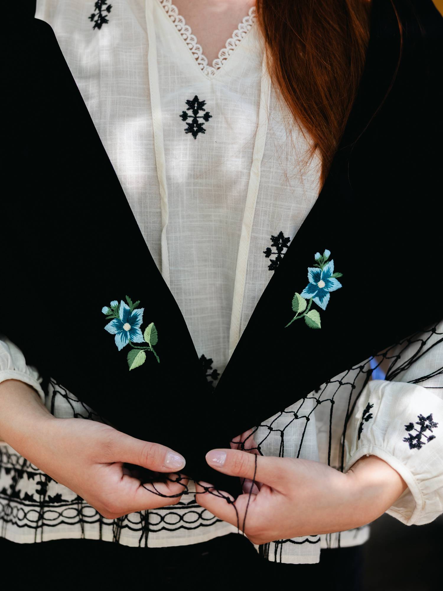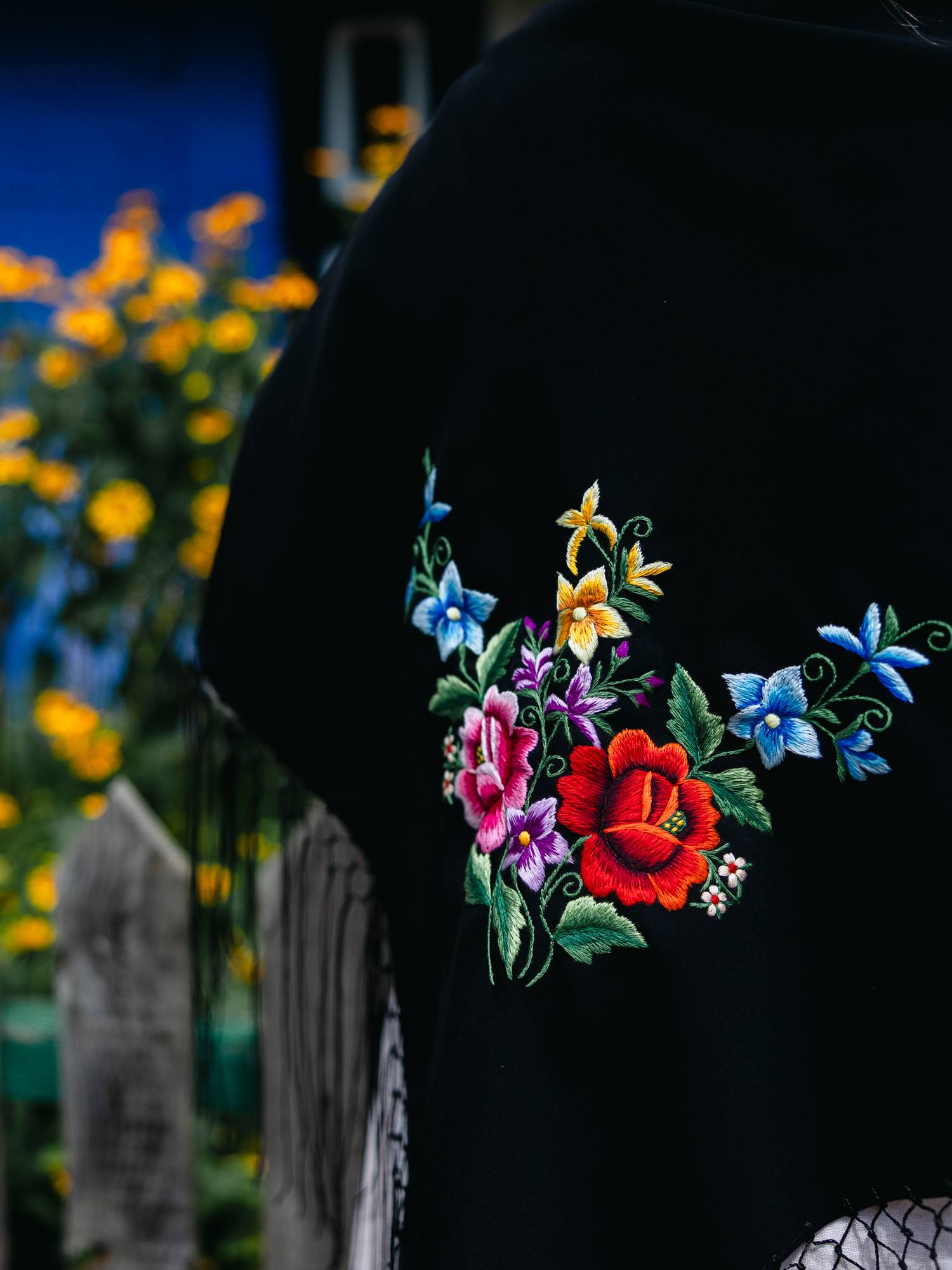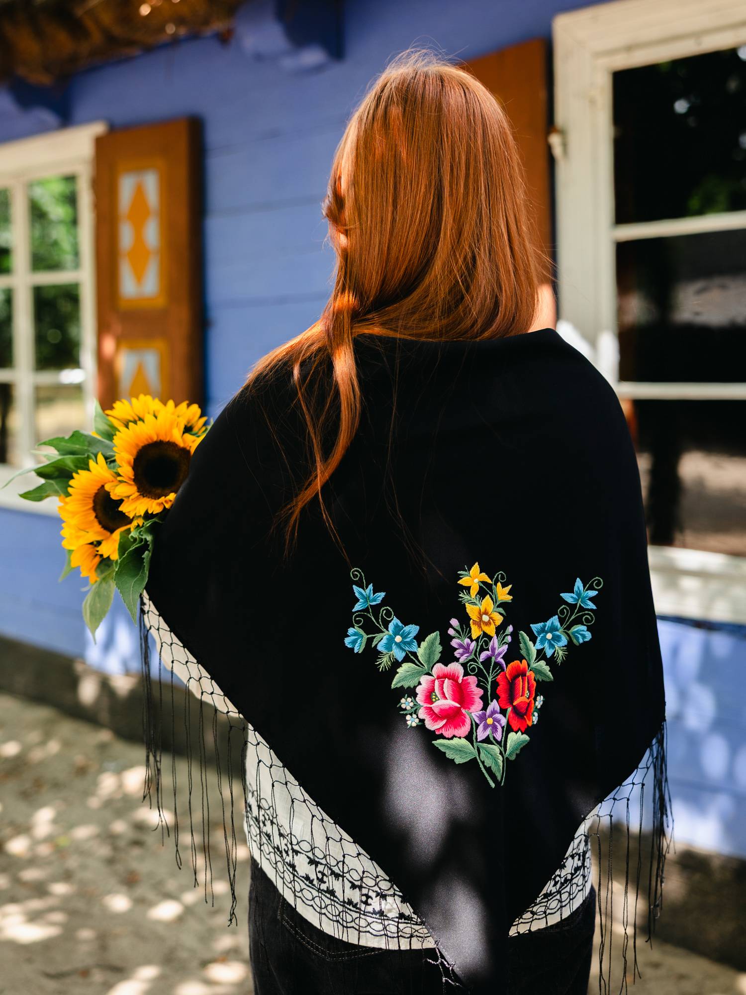 Mała chusta w czarnym kolorze. Ozdobiona haftowanym, kolorowym bukietem. Chusta posiada długie, cienkie frędzelki w kolorze dopasowanym do materiału. Wyszywane detale zostały wykonane przez hafciarkę z okolic Łowicza.