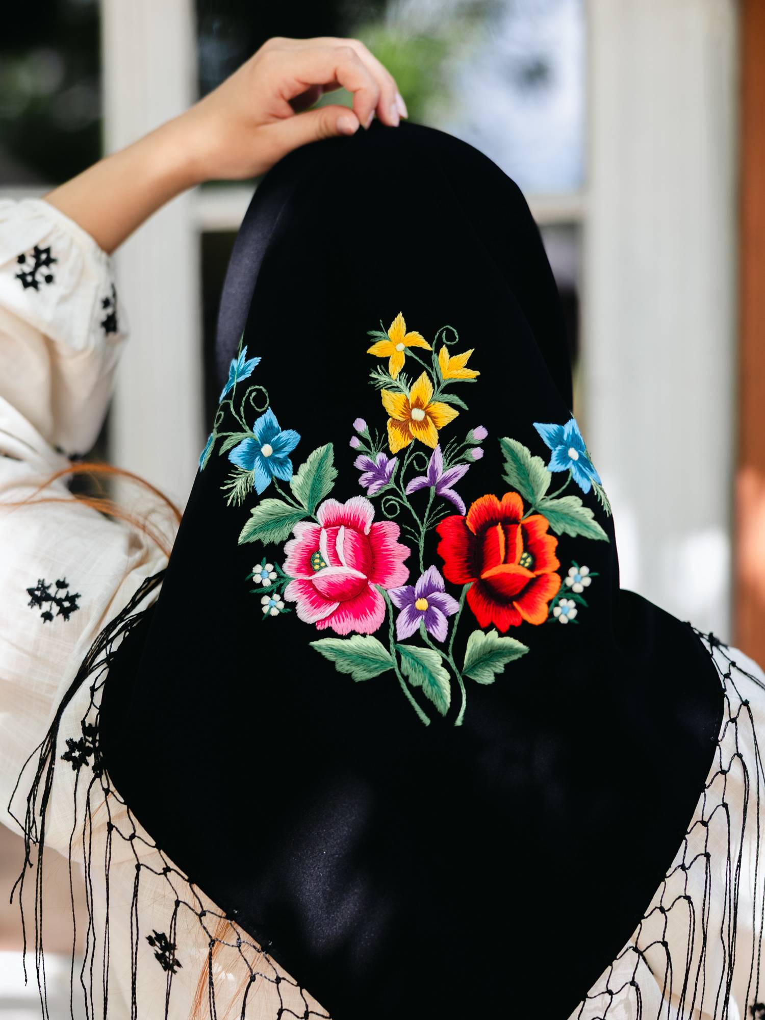 Mała chusta w czarnym kolorze. Ozdobiona haftowanym, kolorowym bukietem.