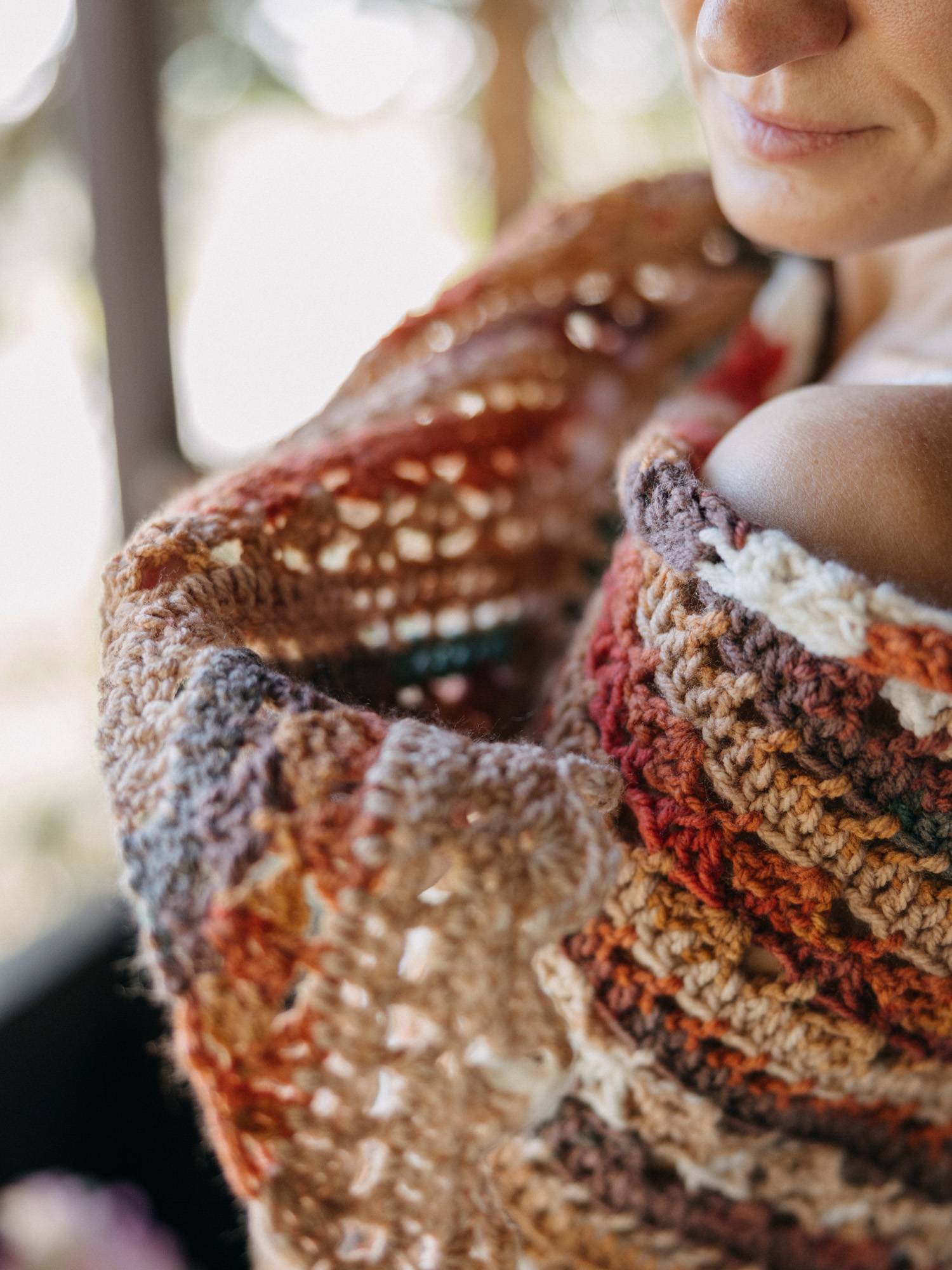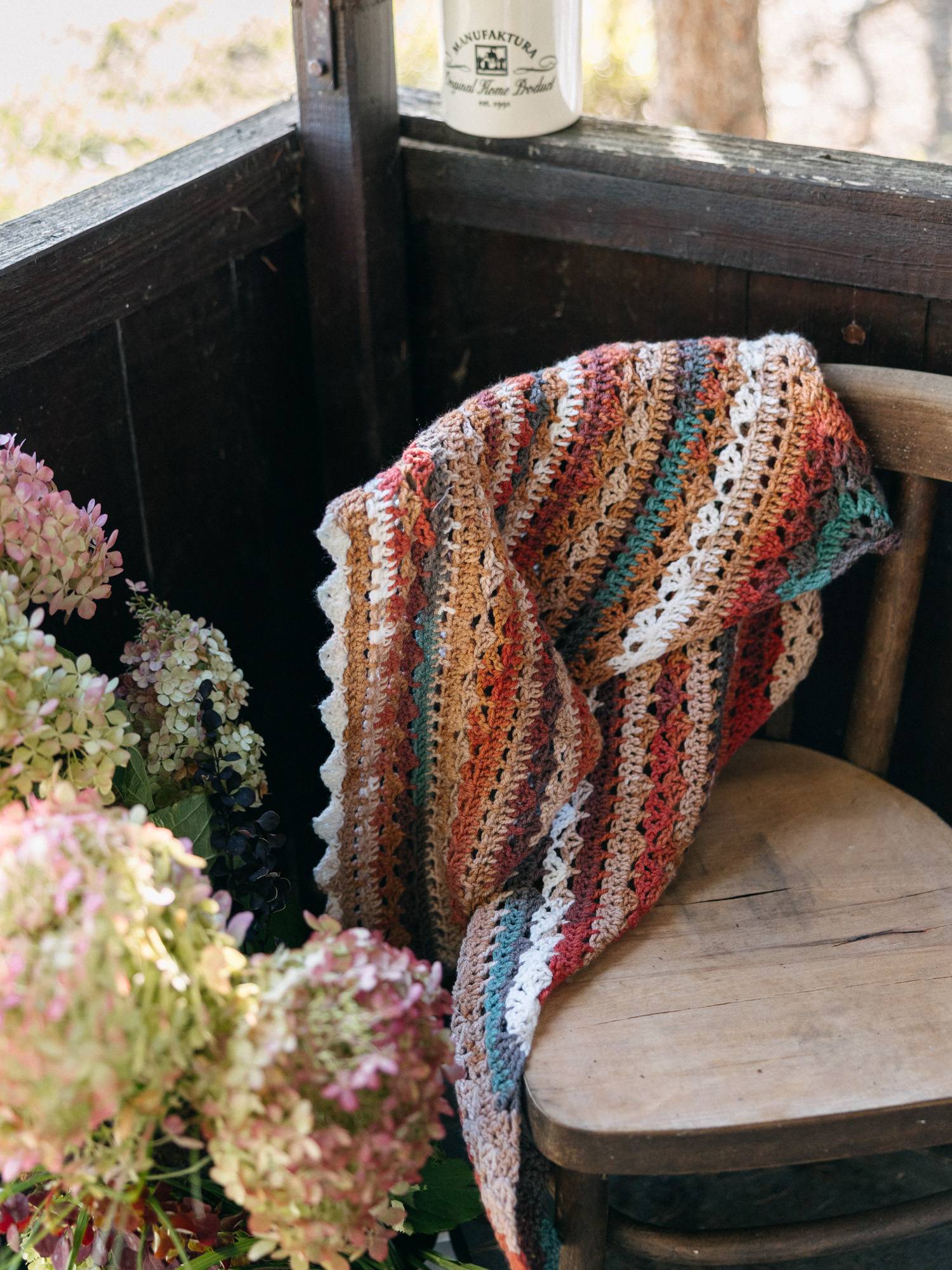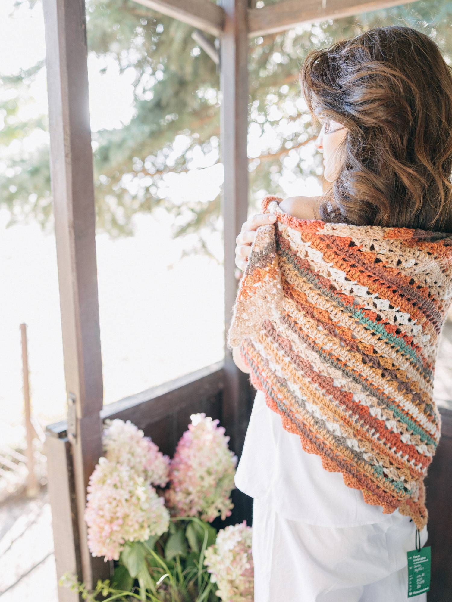 Chusta wykonana na szydełku w kształcie trójkąta w jesiennych kolorach.