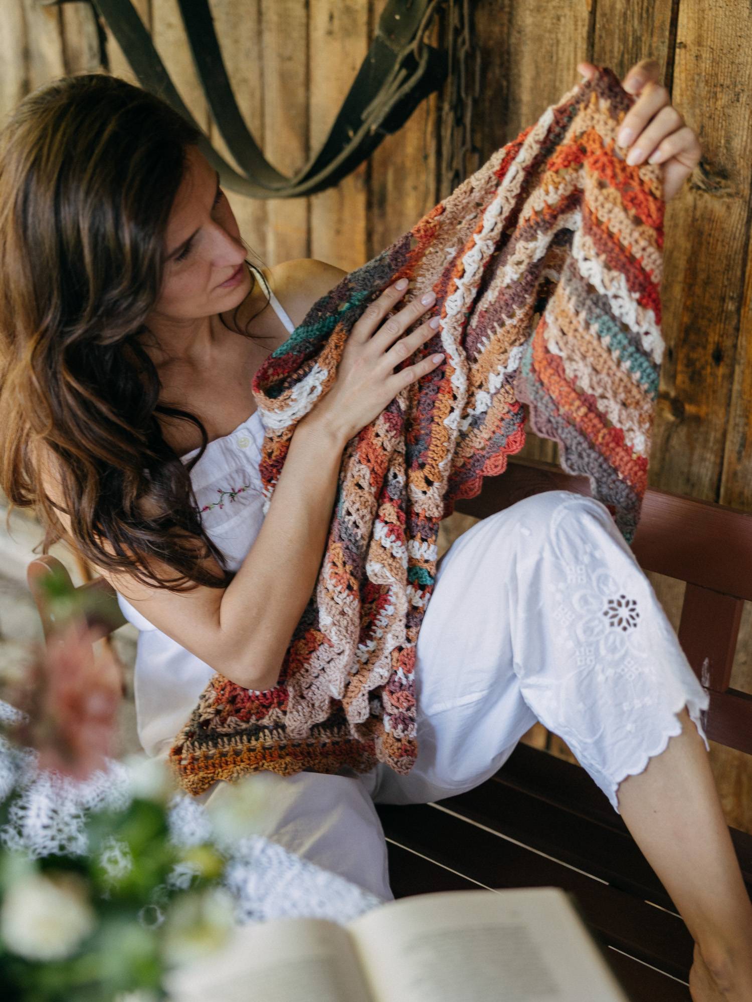 Chusta wykonana na szydełku w kolorystyce ciepłych jesiennych kolorów. Ma kształt trójkąta, ażurowe pasy i otworki. Brzegi są ozdobione falującym wykończeniem. Użyto włóczki w kilku kolorach zmienianych po kolei. Jest miękka, ma dość gruby materiał, więc świetnie nadaje się na chłodniejsze dni.