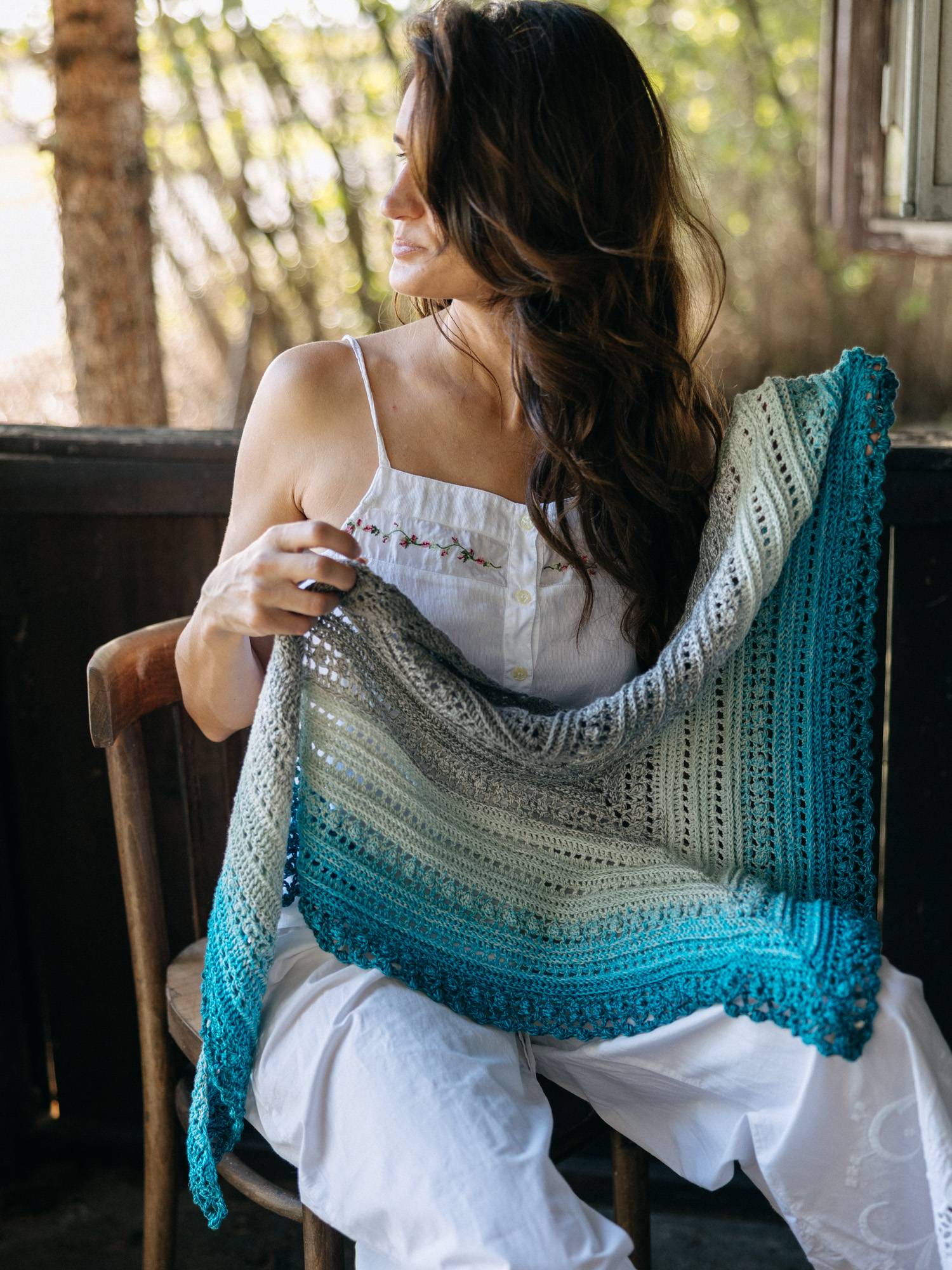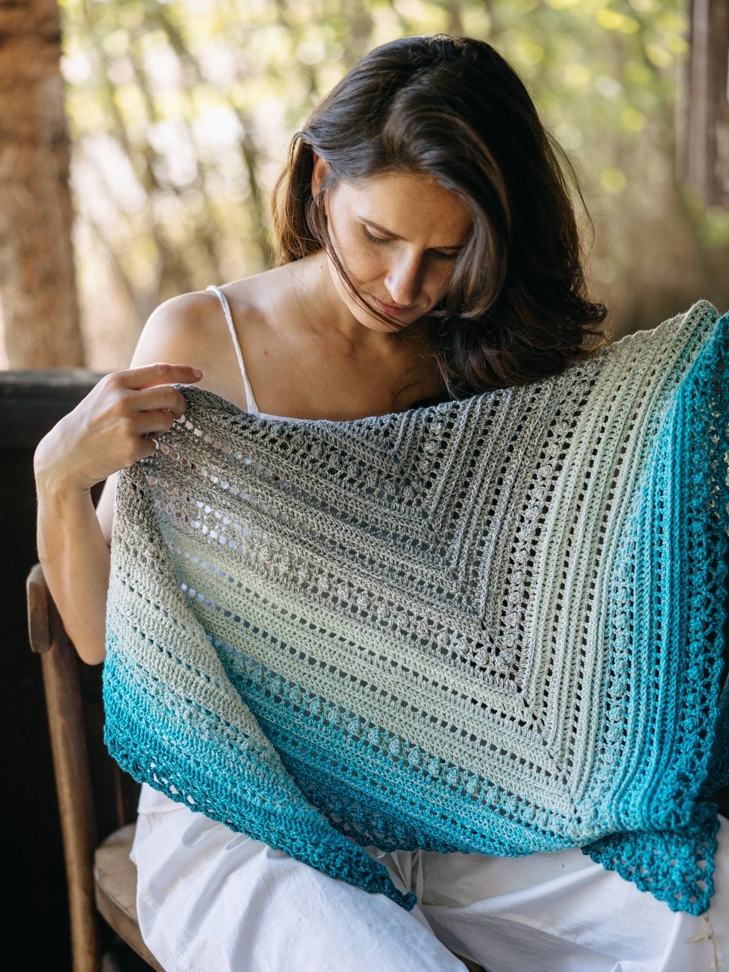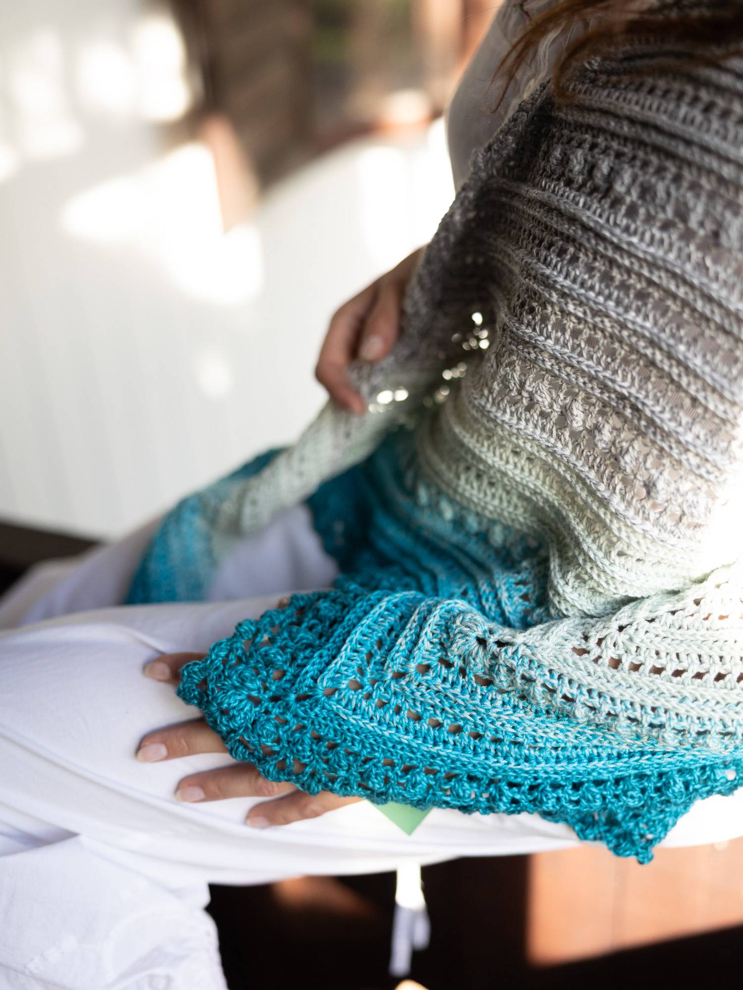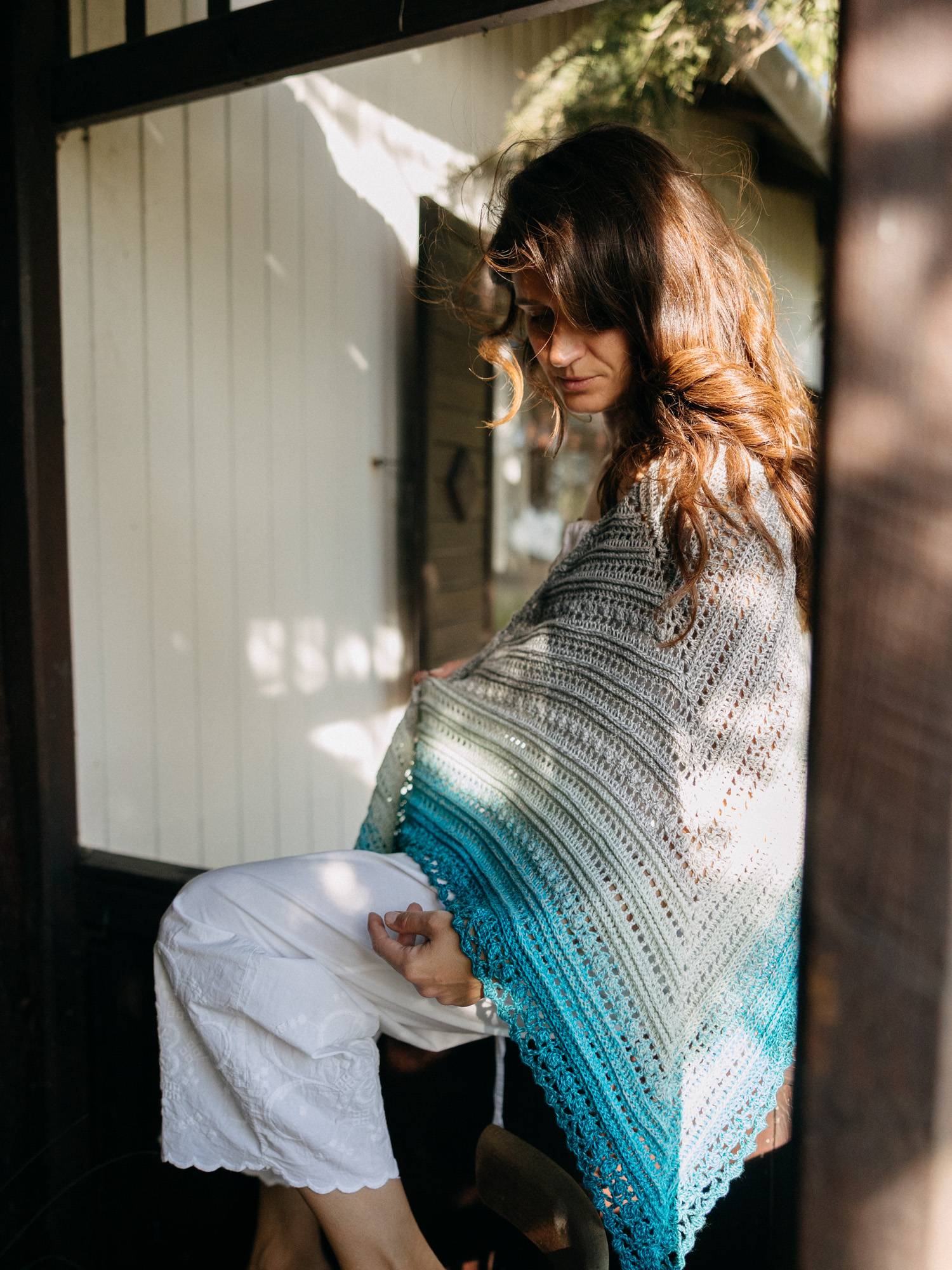 Wykonana ręcznie chusta szydełko w niebiesko-szarym kolorze. Ma kształt trójkąta, a kolory na chuście przeplatają się w stylu ombre. Miękka i przyjemna w dotyku z ażurowym wzorem i ozdobnym wykończeniem.
