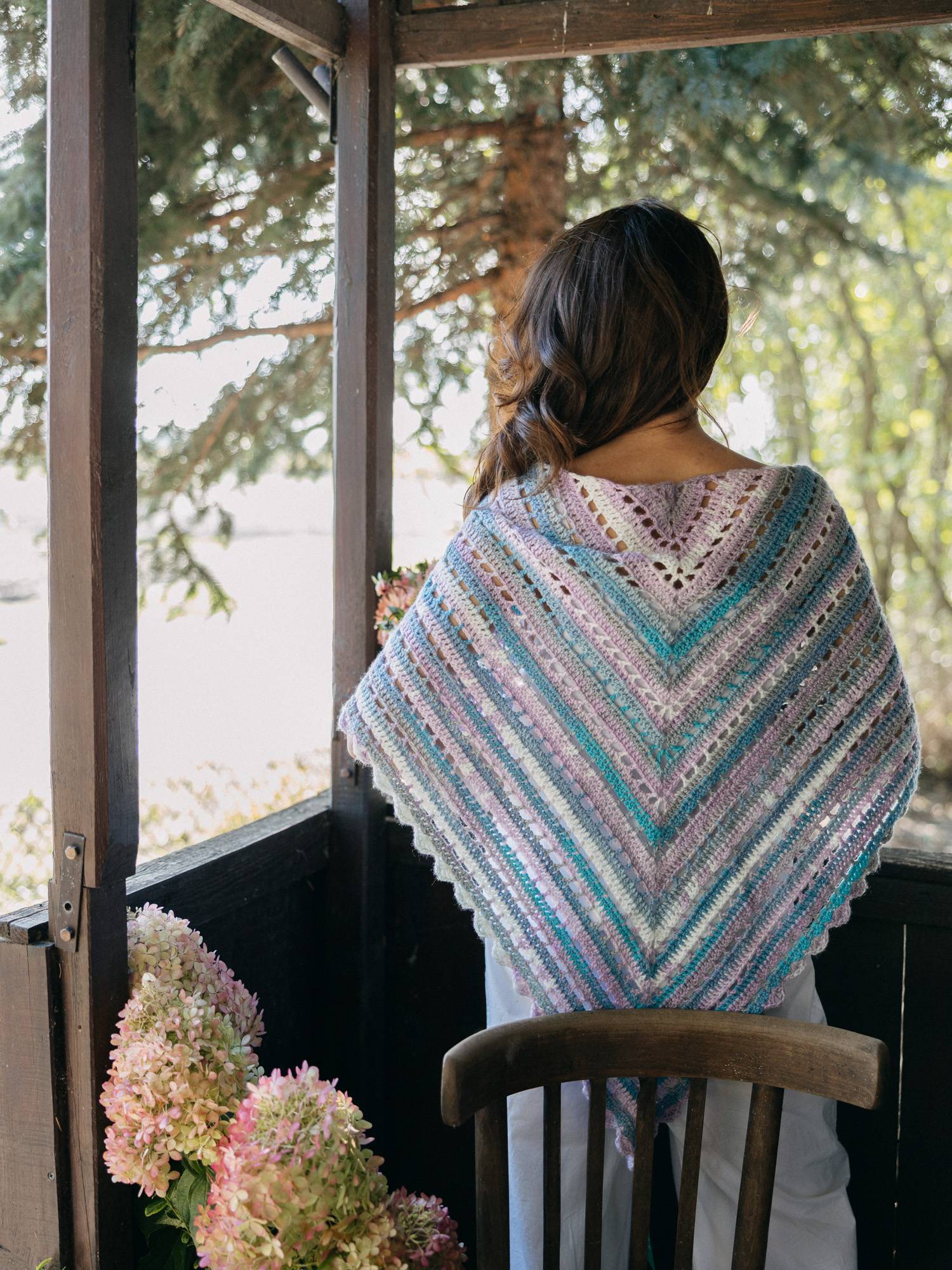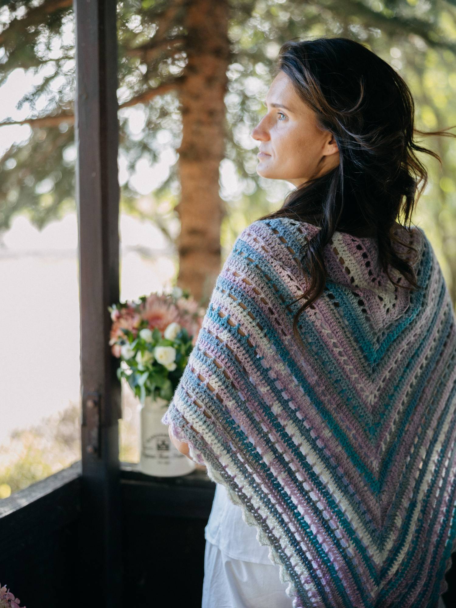 Trójkątna chusta wykonana z włóczki w pastelowych odcieniach różu, fioletu szarości i bieli. Kolory przeplatają się ze sobą, tworząc spójną całość w delikatnych odcieniach. Brzeg został wykończony ozdobnym falowanym wzorem. Wzór składa się z pasów i otworków.