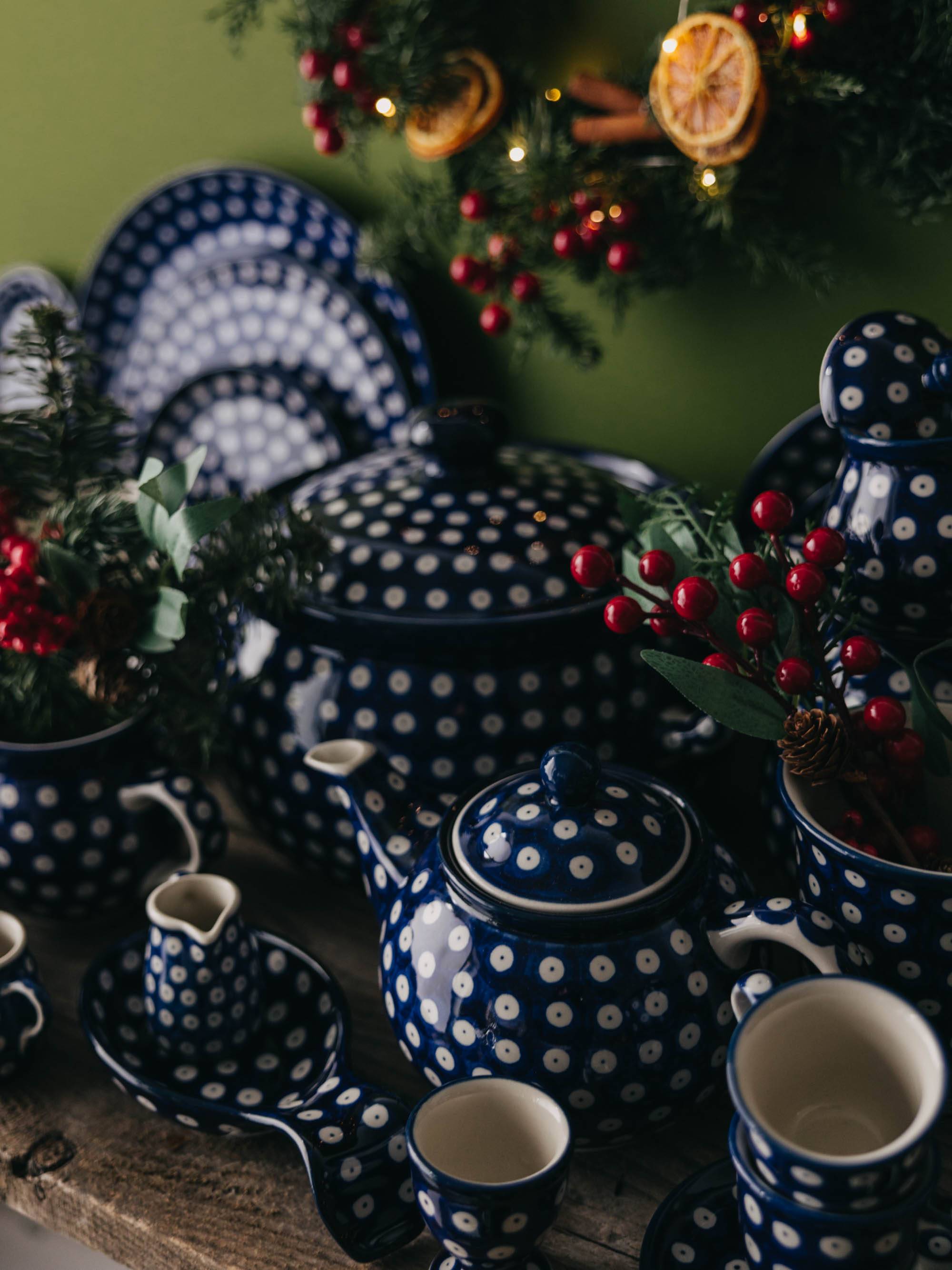 Oryginalny czajnik z dużym uchwytem i wieczkiem. Jasna ceramika została ozdobiona ręcznie, kobaltowym wzorem groszków. Naczynie posiada wygodne, wywinięte ucho oraz pokrywkę z okrągłym uchwytem i wgłębieniem, które chroni wieczko przed wypadnięciem. Czajnik został wykonany w „Ceramice Artystycznej” w Bolesławcu.