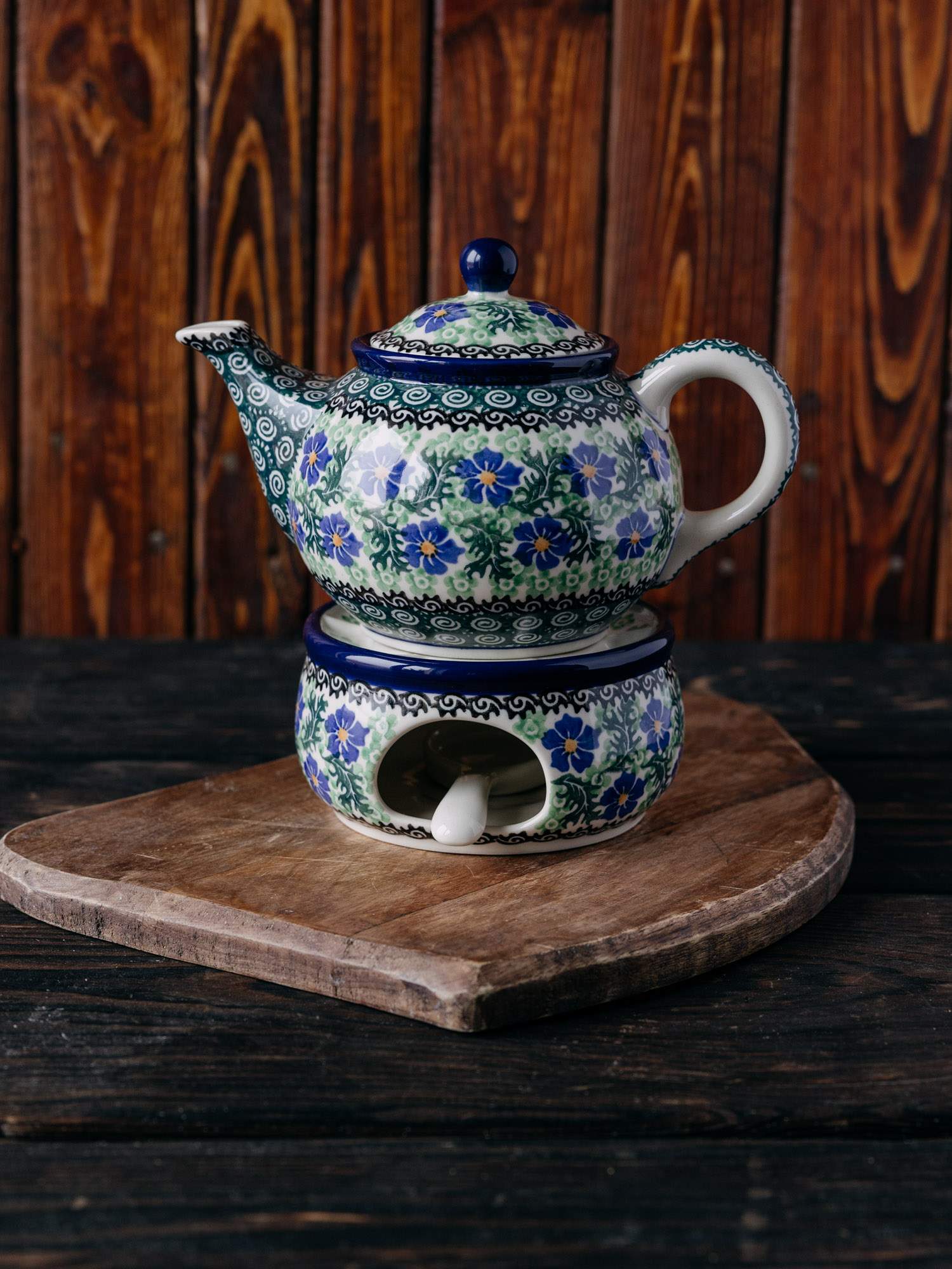Komplet w postaci czajnika z podgrzewaczem, ozdobiony kwiatowym, kobaltowo-zielonym wzorem chabrów.