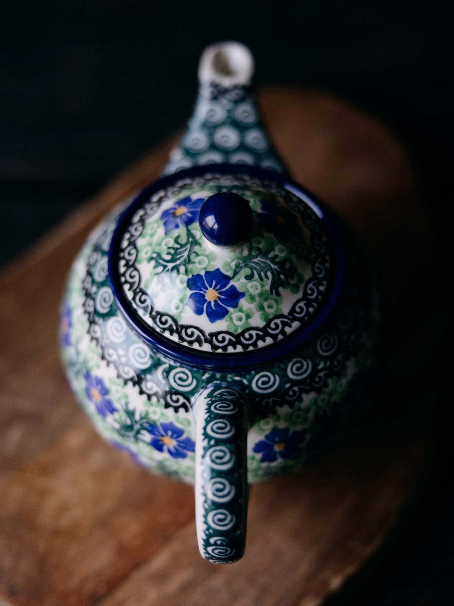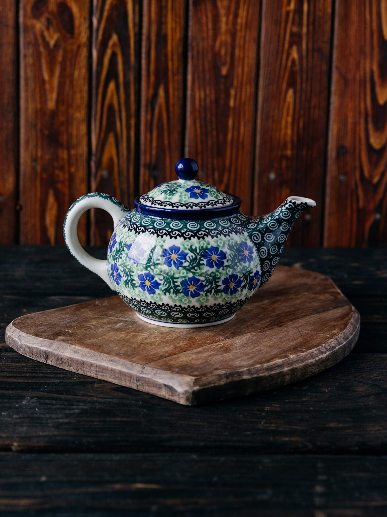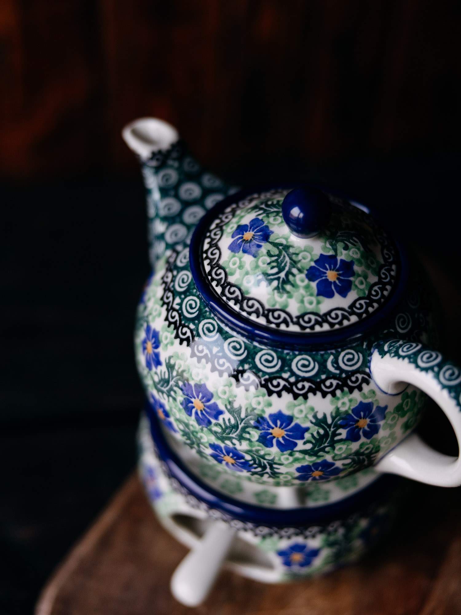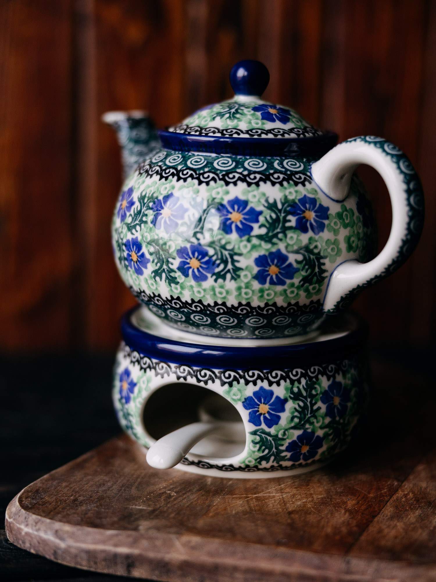 Komplet w postaci czajnika z podgrzewaczem. Jasna ceramika została ozdobiona ręcznie, kwiatowym, kobaltowo-zielonym wzorem chabrów. Czajnik posiada wygodne, wywinięte ucho oraz pokrywkę z okrągłym uchwytem i wgłębieniem, które chroni wieczko przed wypadnięciem. Podgrzewacz posiada w zestawie łyżkę na świeczkę. Komplet został wykonany w „Ceramice Artystycznej” w Bolesławcu.