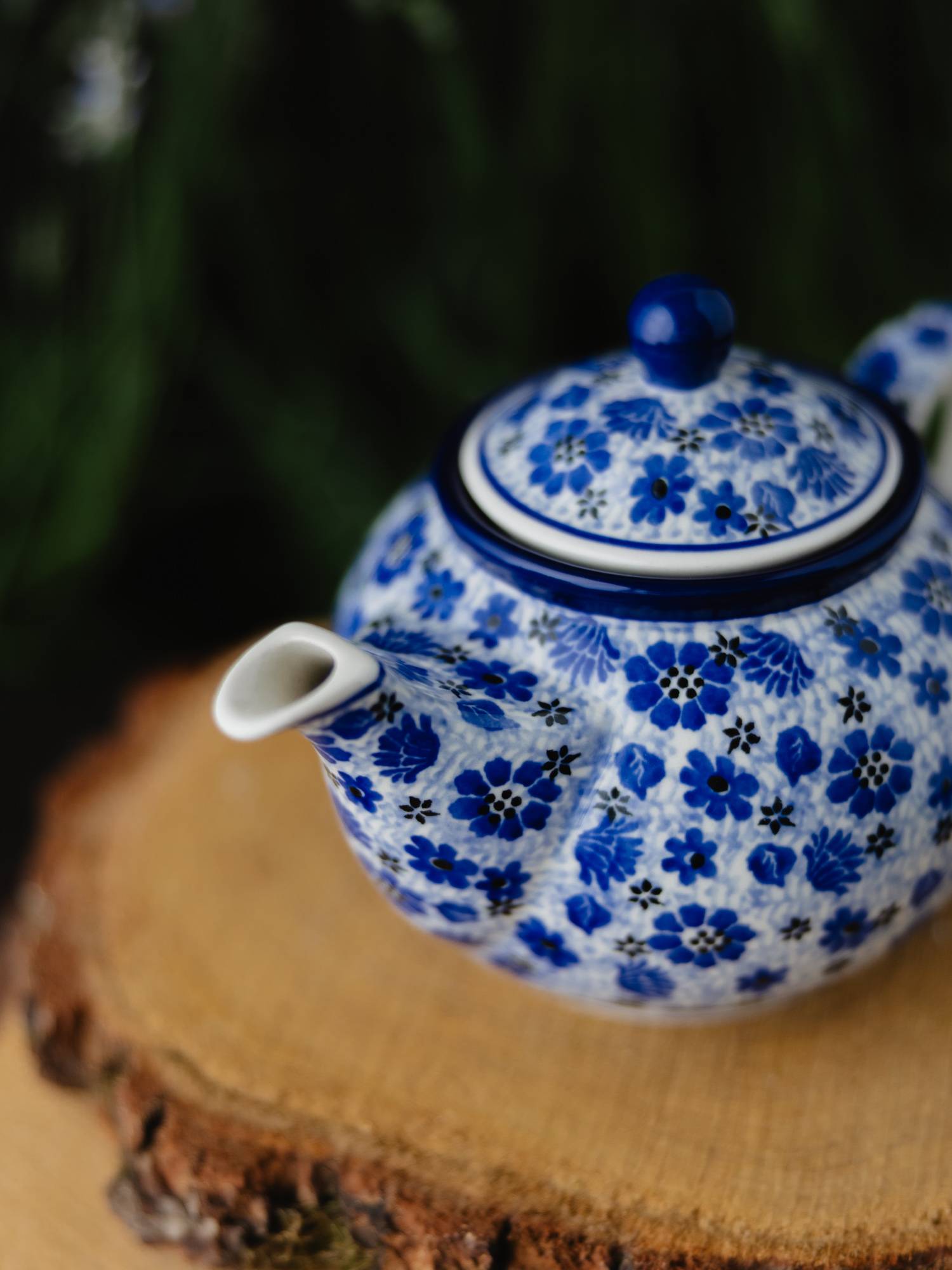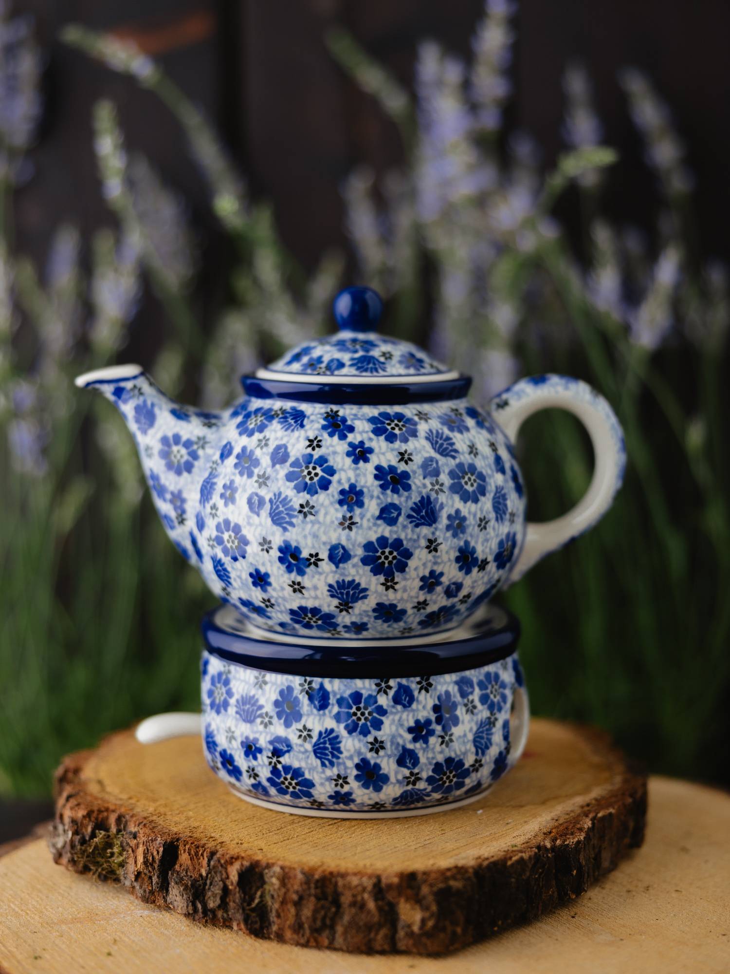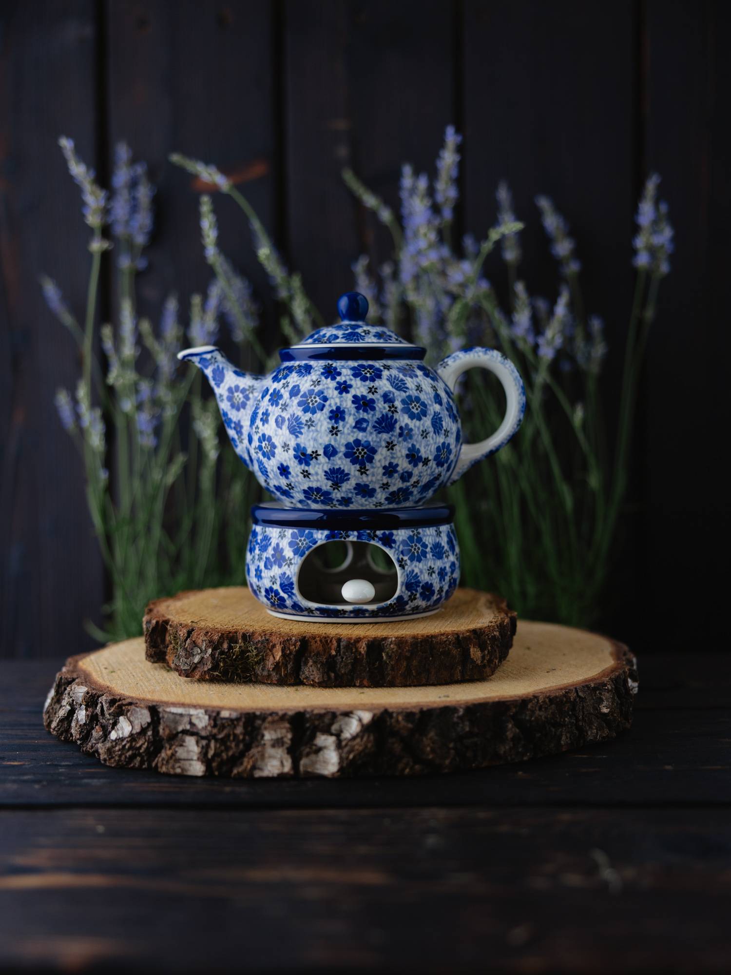 Komplet w postaci czajnika z podgrzewaczem. Jasna ceramika została ozdobiona ręcznie, niebiesko-kobaltowym wzorem kwiatowej łąki. Czajnik posiada wygodne, wywinięte ucho oraz pokrywkę z okrągłym uchwytem i wgłębieniem, które chroni wieczko przed wypadnięciem. Podgrzewacz posiada w zestawie łyżkę na świeczkę. Komplet został wykonany w „Ceramice Artystycznej” w Bolesławcu.