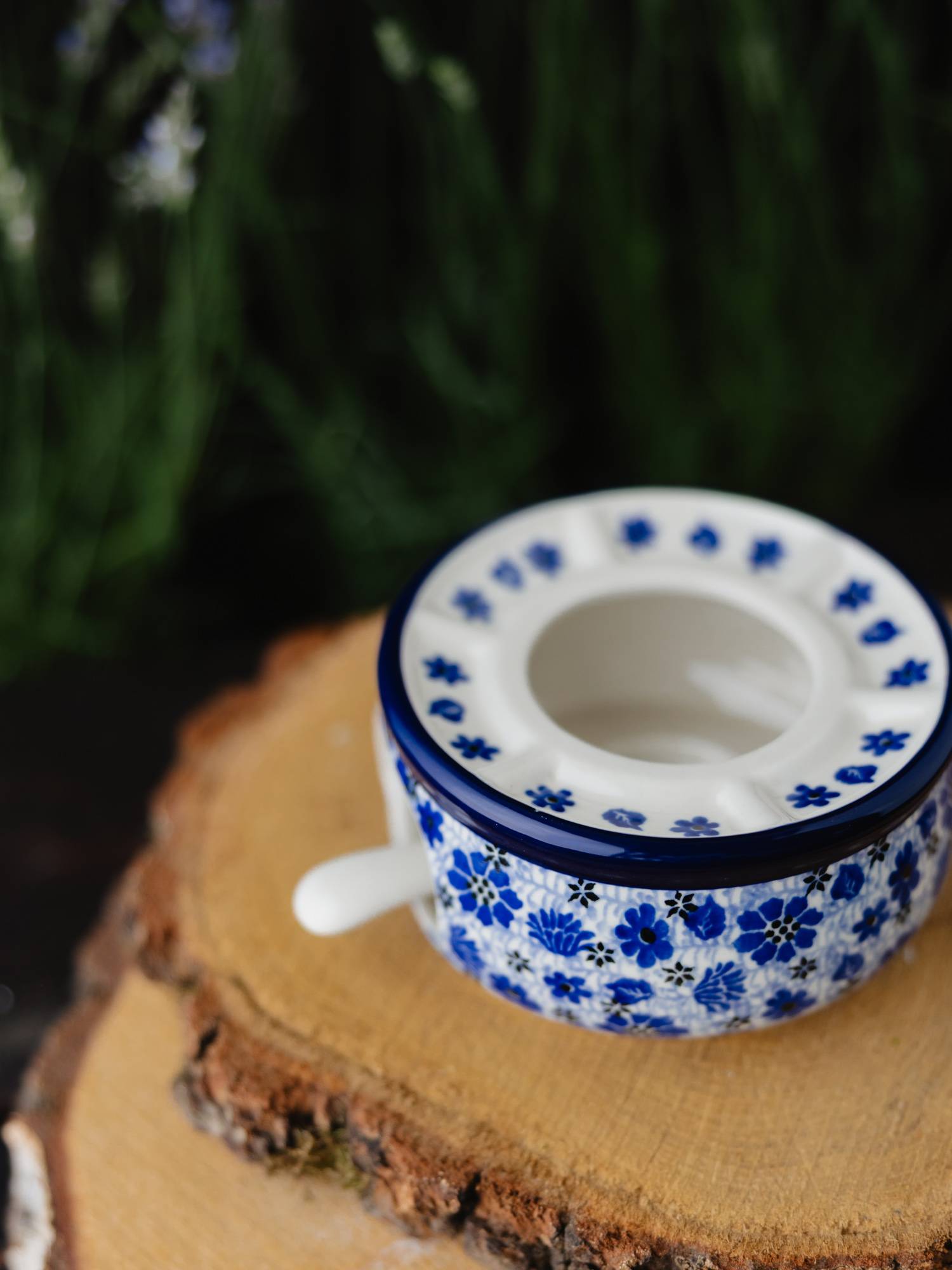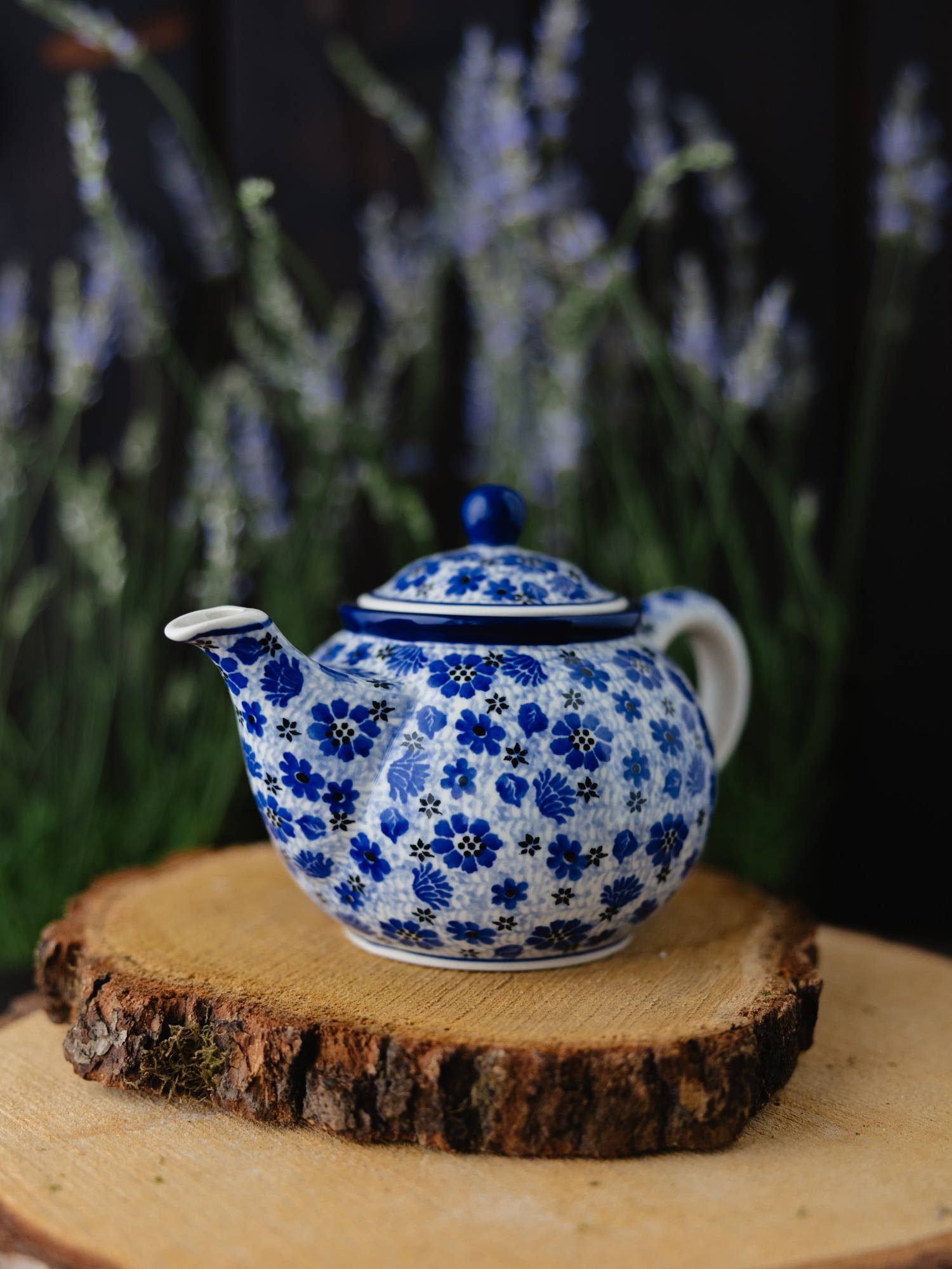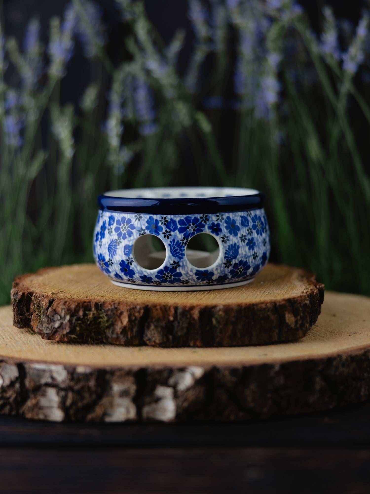 Komplet w postaci czajnika z podgrzewaczem. Jasna ceramika została ozdobiona ręcznie, niebiesko-kobaltowym wzorem kwiatowej łąki. Czajnik posiada wygodne, wywinięte ucho oraz pokrywkę z okrągłym uchwytem i wgłębieniem, które chroni wieczko przed wypadnięciem. Podgrzewacz posiada w zestawie łyżkę na świeczkę. Komplet został wykonany w „Ceramice Artystycznej” w Bolesławcu.
