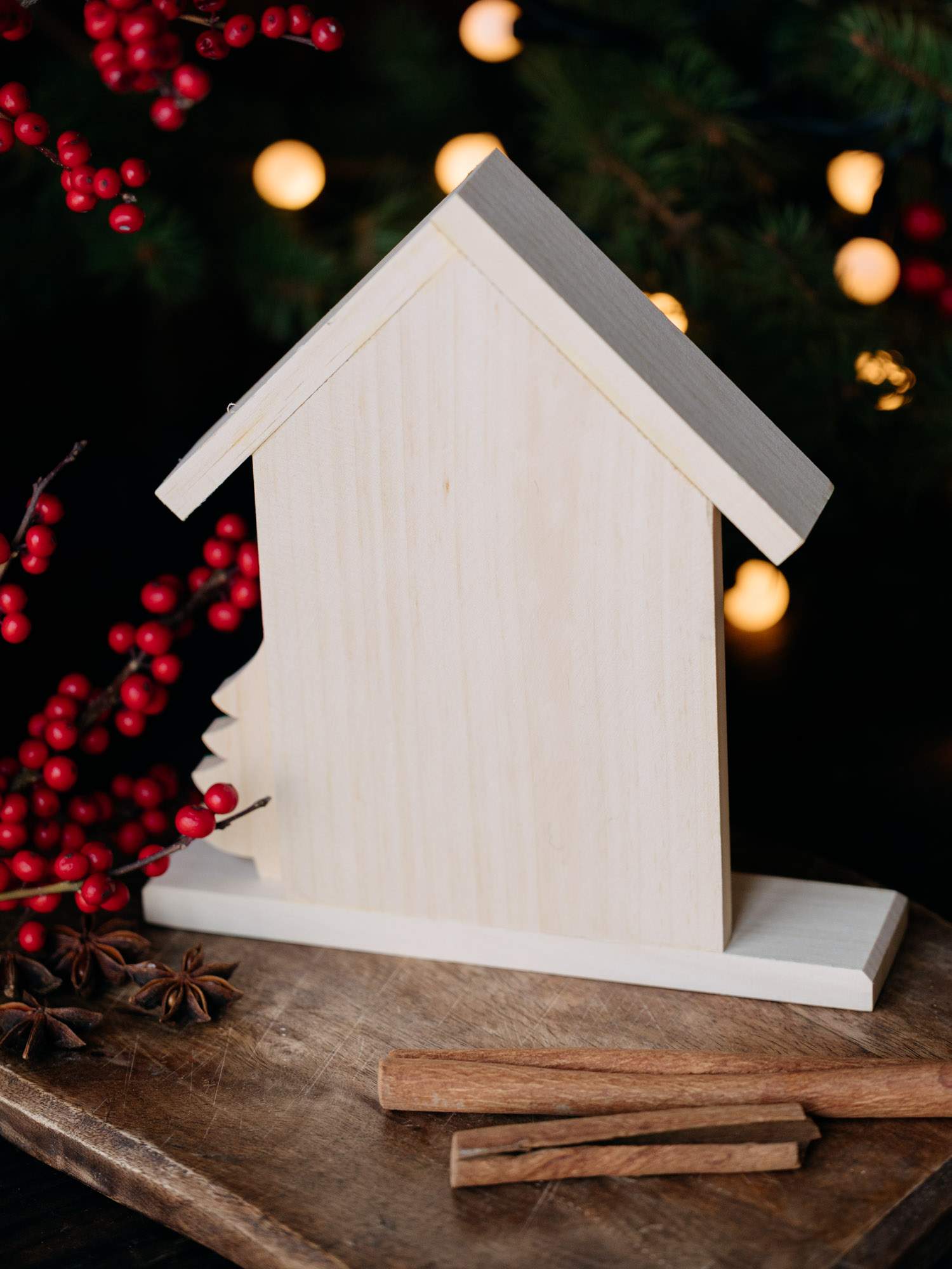 Drewniany domek świąteczny z napisem ,,Wesołych Świąt". Ozdobiony kwiatowym zdobieniem i choinką.
