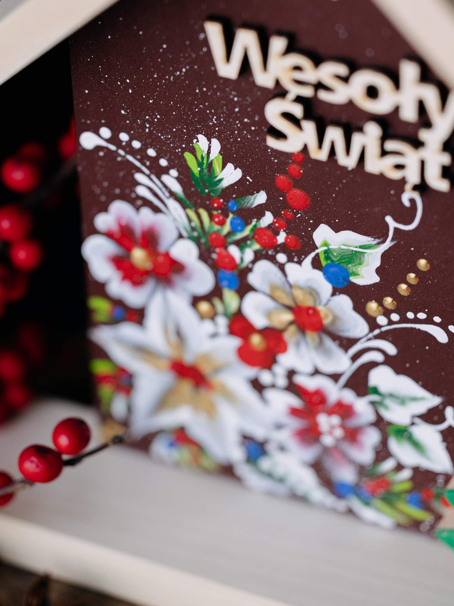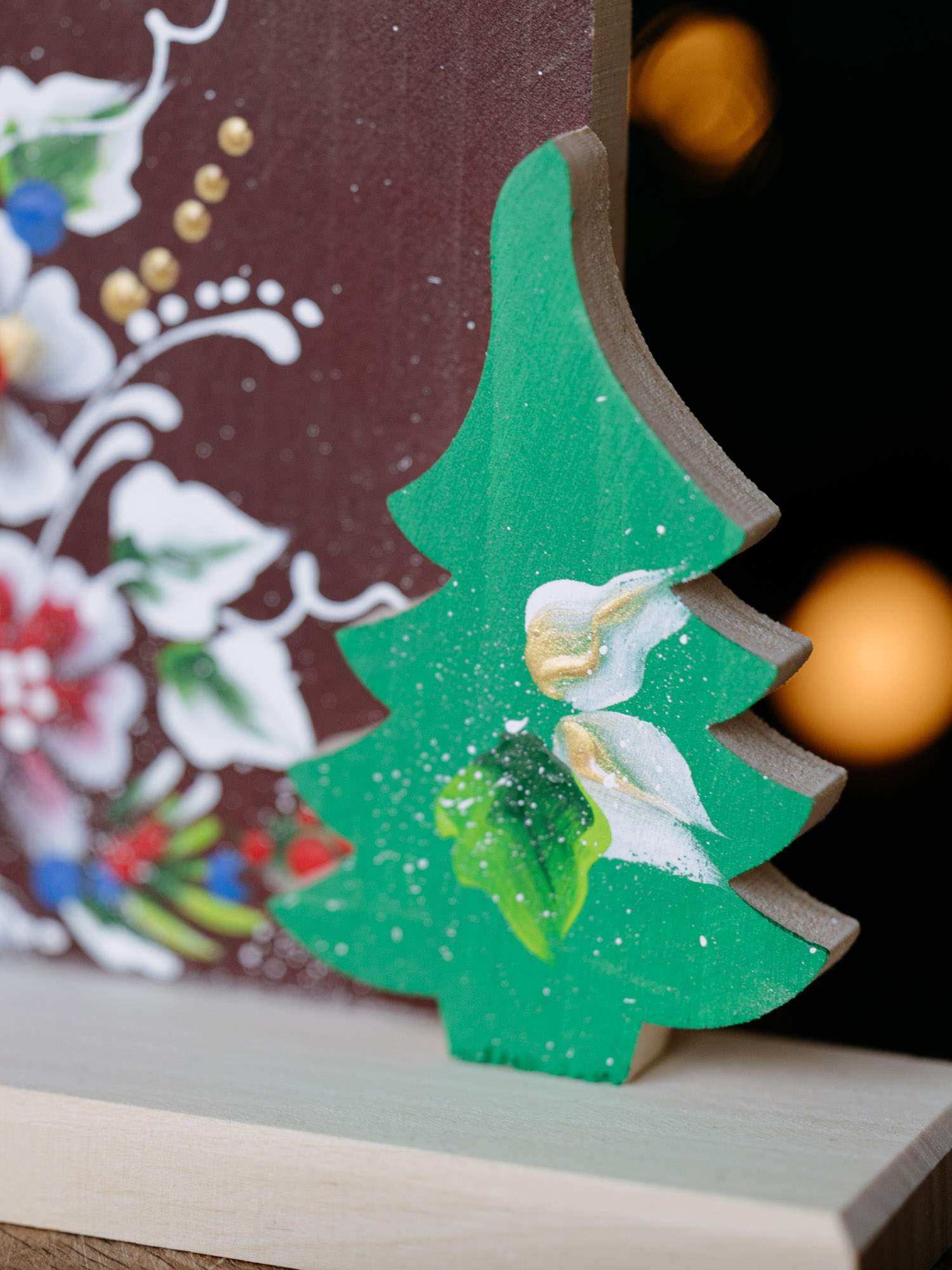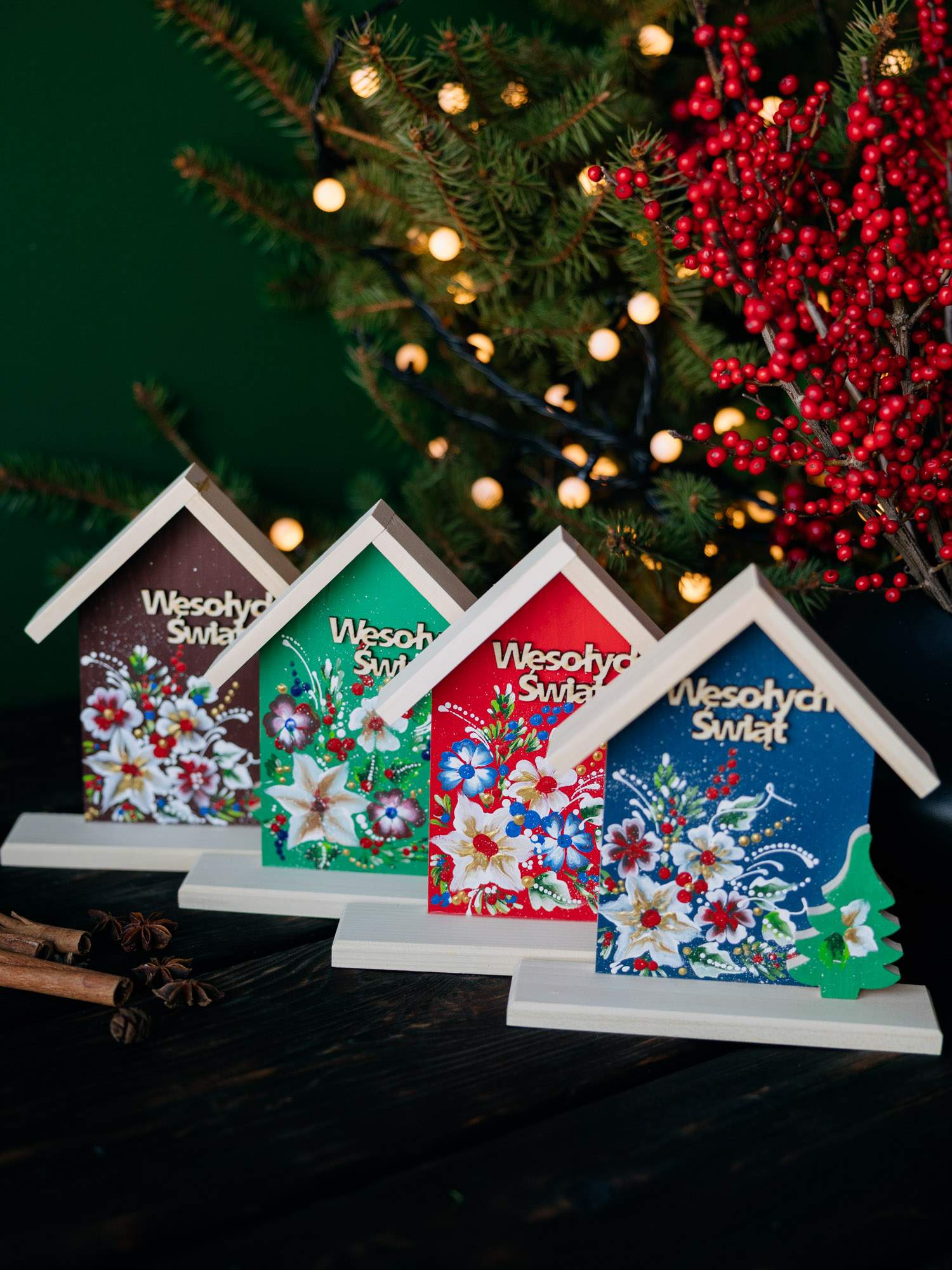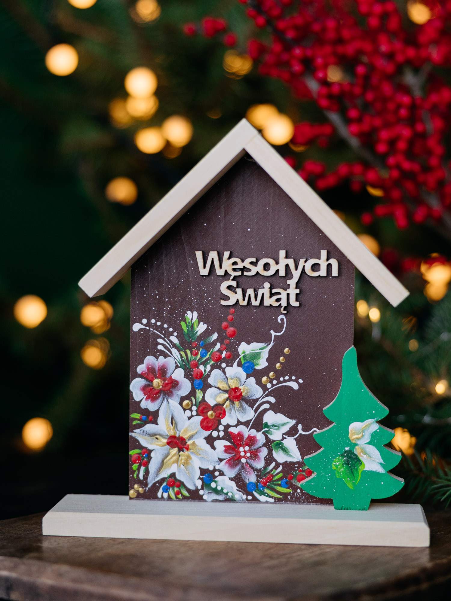 Ręcznie wykonany domek z drewna, zdobiony kwiatowym motywem oraz napisem ,,Wesolych Świąt''. Z przodu znajduje się mała zielona choinka. Idealnie prezentuje się w otoczeniu lampek i bożonarodzeniowych dodatków.
