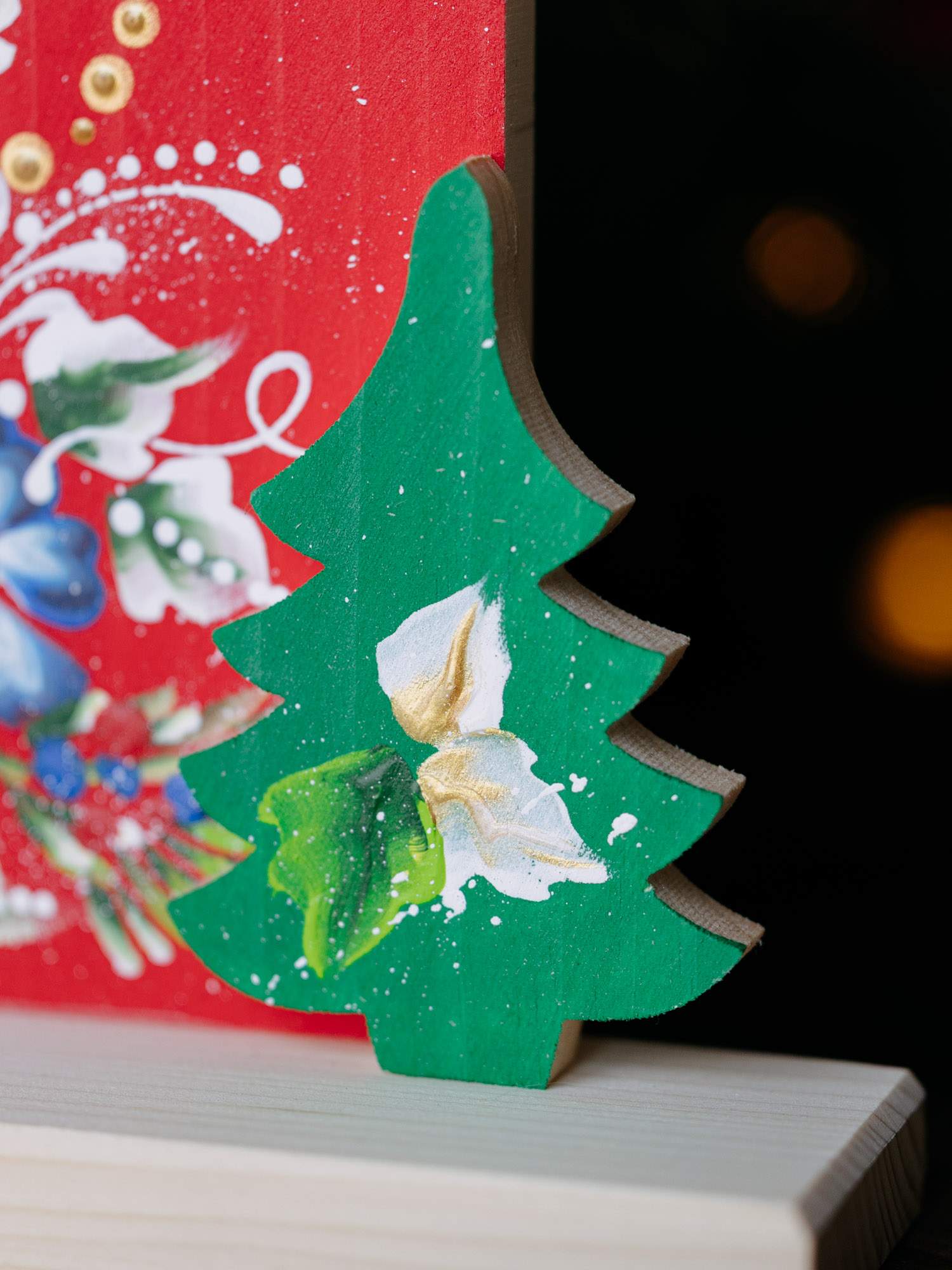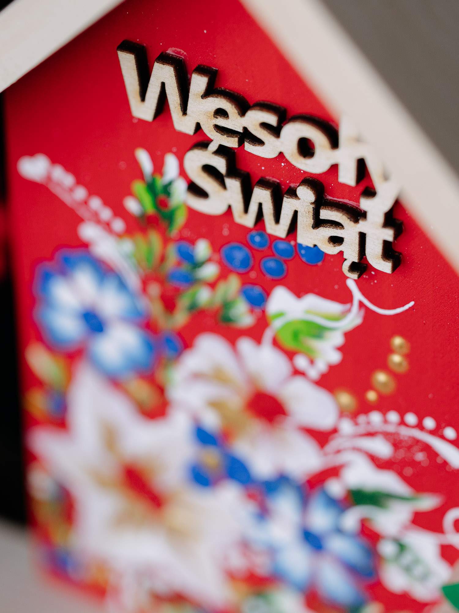 Ręcznie wykonany domek z drewna. Z przodu umieszczono kwiatowo-świąteczne zdobienie oraz napis ,,Wesołych Świąt". Obok znajduje się mała choinka zielona. Konstrukcja domku umieszczona jest na stabilnej podstawce, co pozwala ustawić ją w dowolnym miejscu.