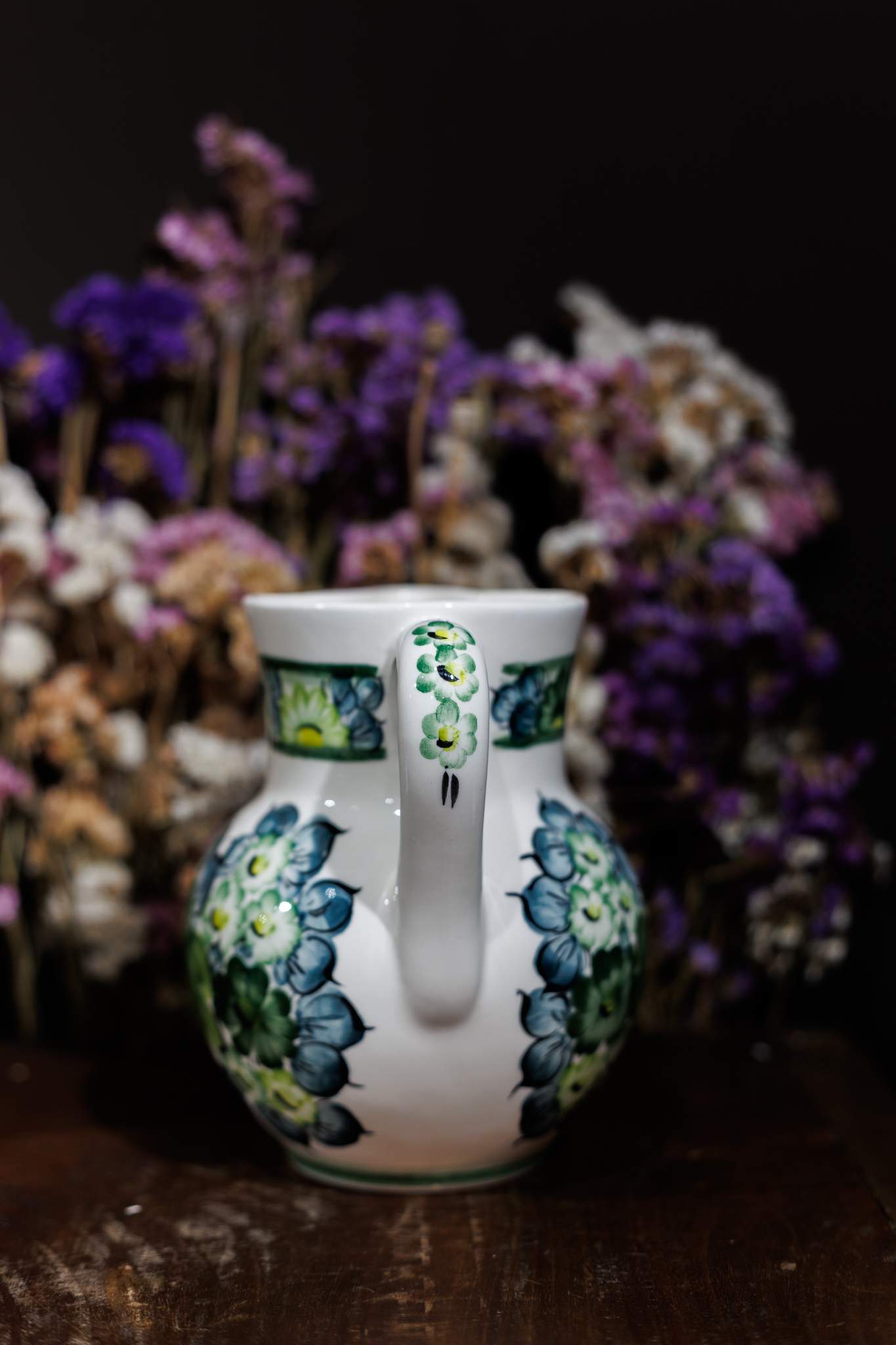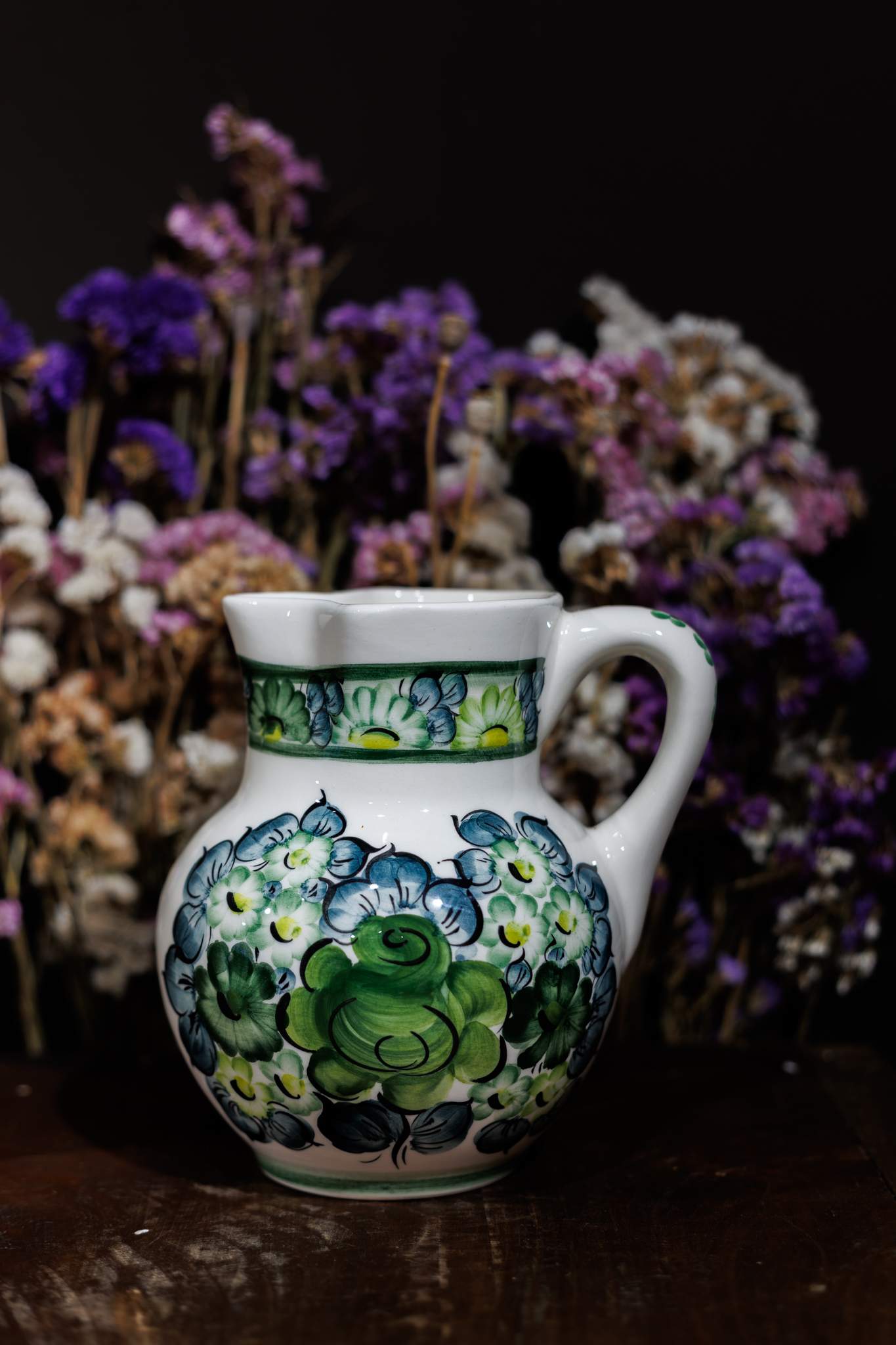 Fajansowy dzban do mleka z klasycznym, zielonym wzorem kwiatowym.