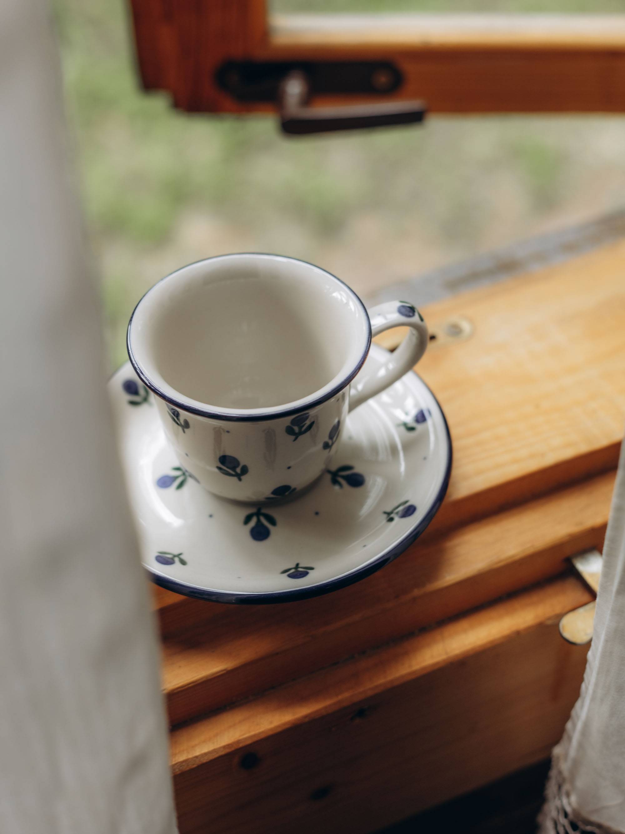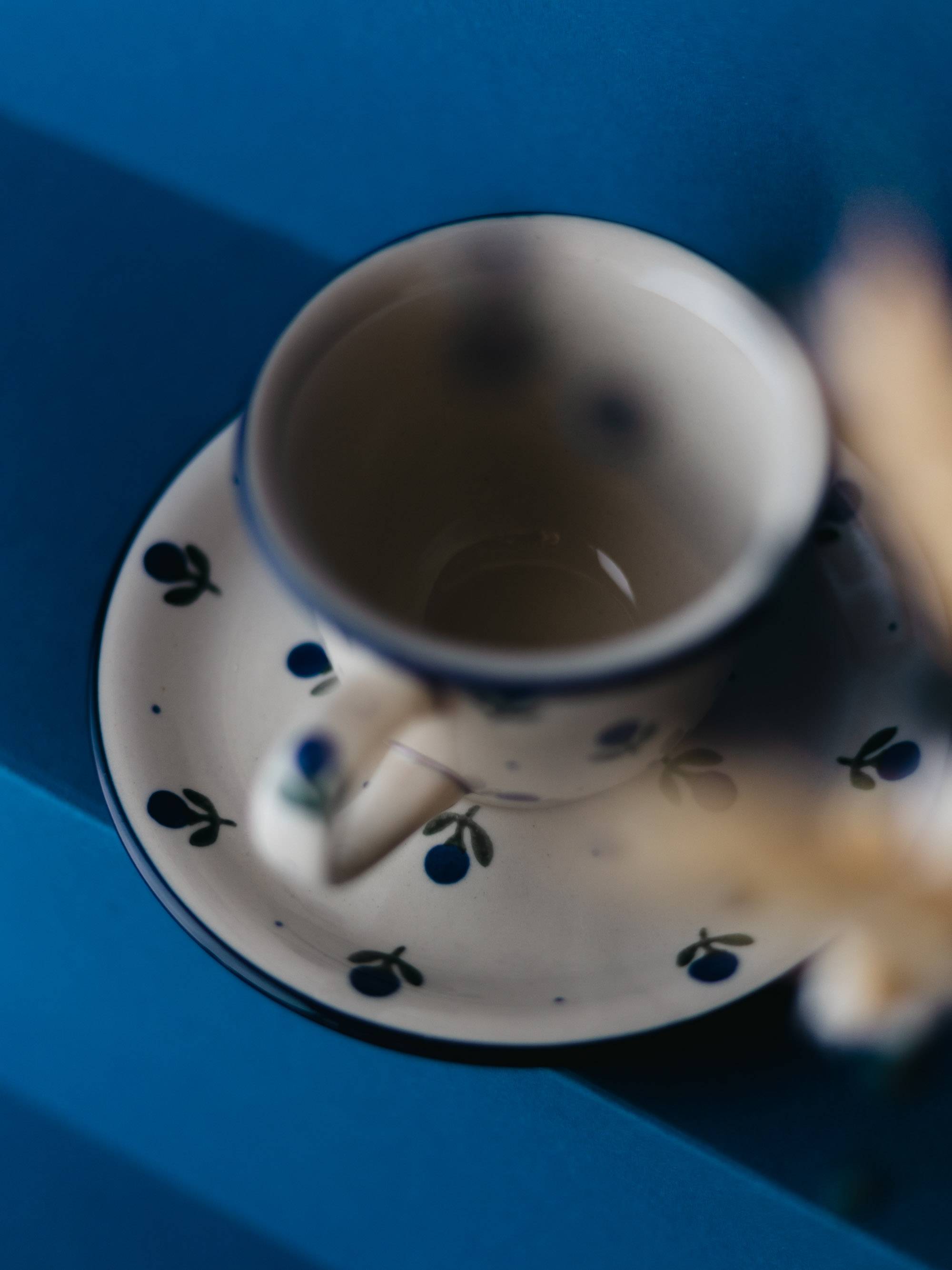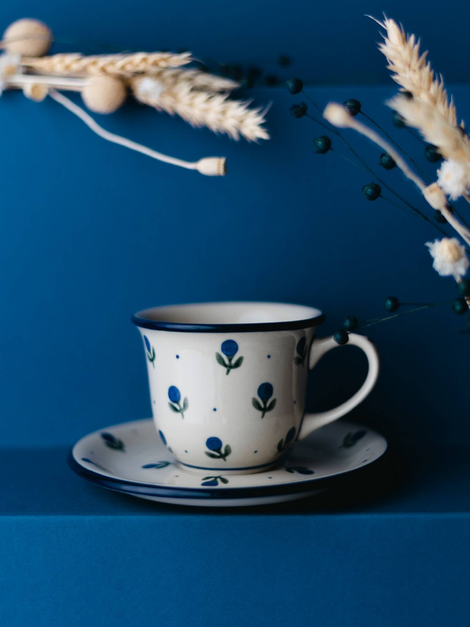 Kawowa filiżanka z wywiniętym brzegiem, w komplecie z talerzykiem, ozdobiona delikatnym, kobaltowo-zielonym wzorem jagódek.