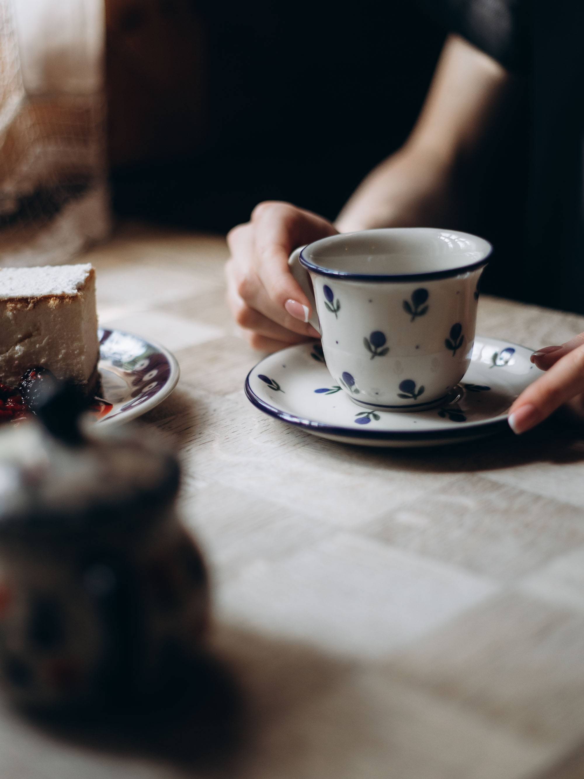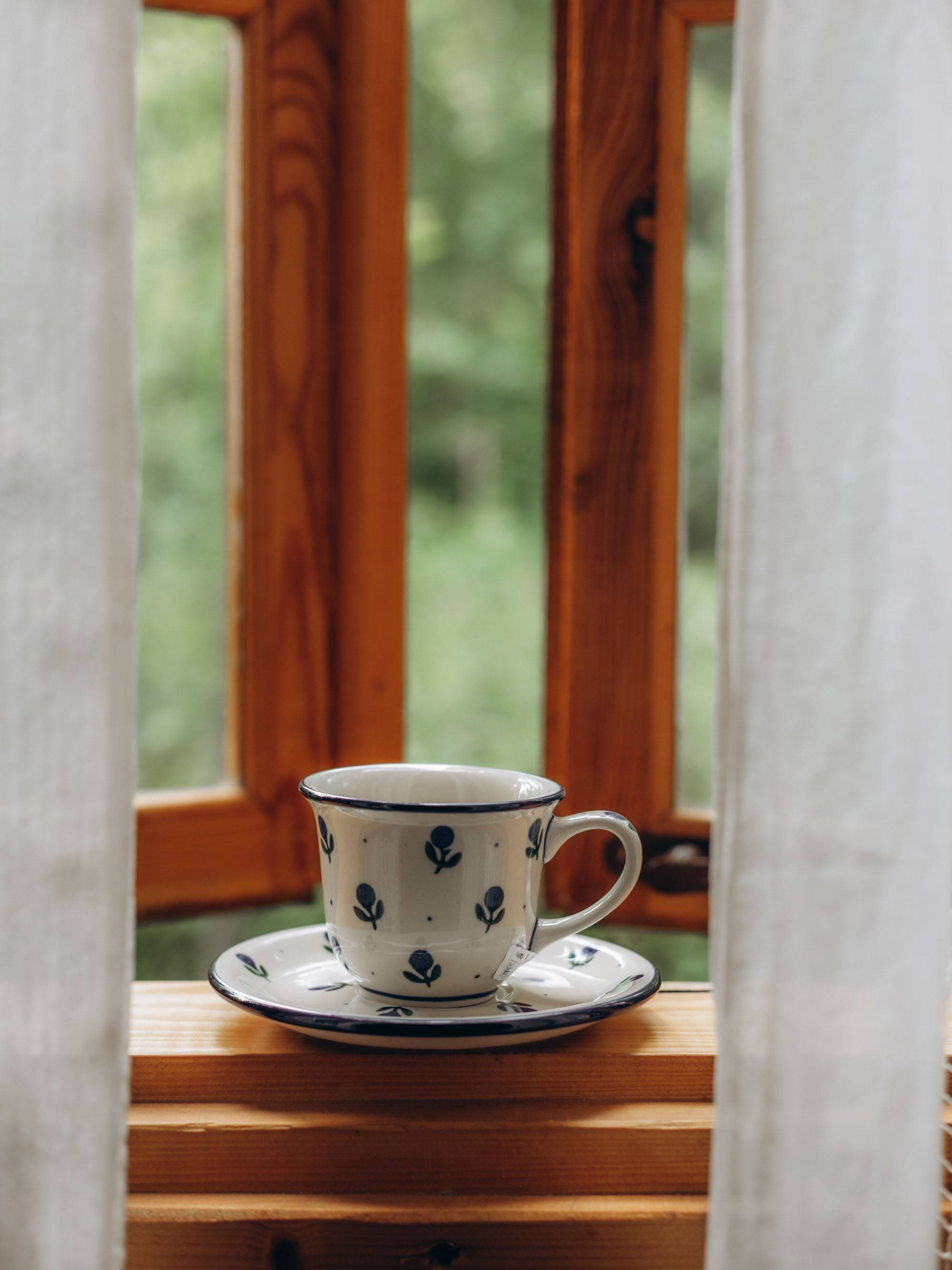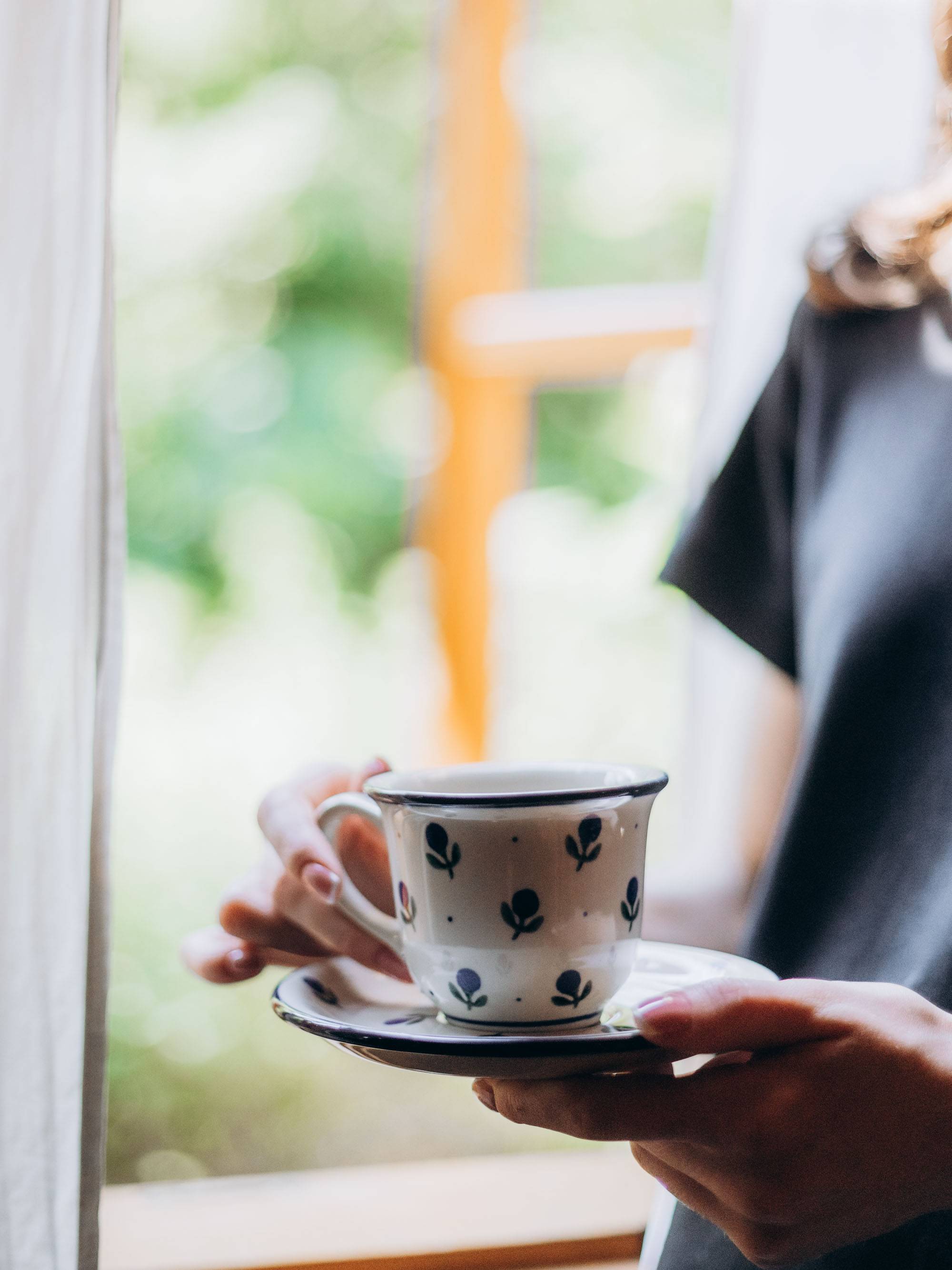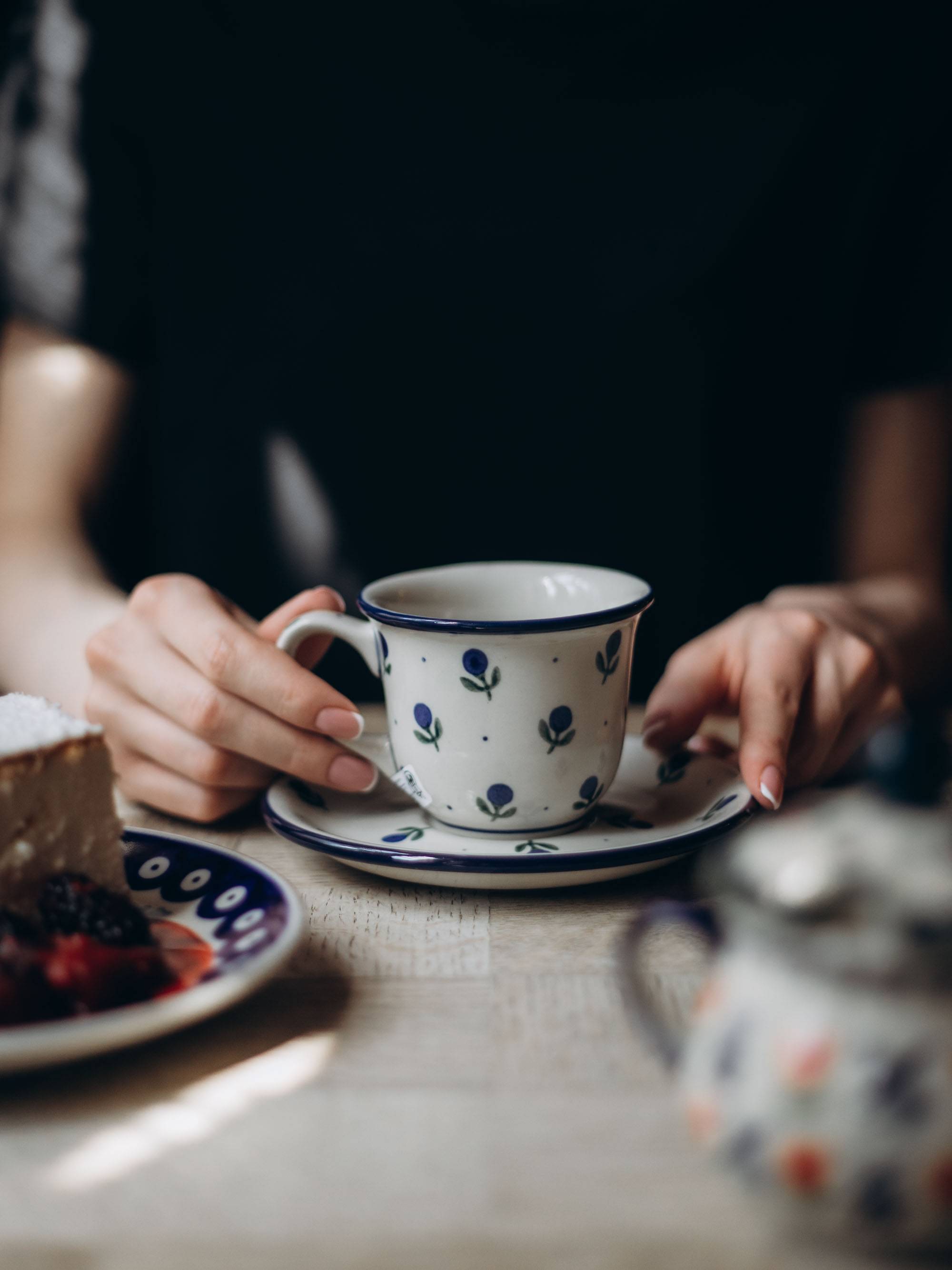 Kawowa filiżanka z wywiniętym brzegiem, w komplecie z talerzykiem, ozdobiona delikatnym, kobaltowo-zielonym wzorem jagódek.