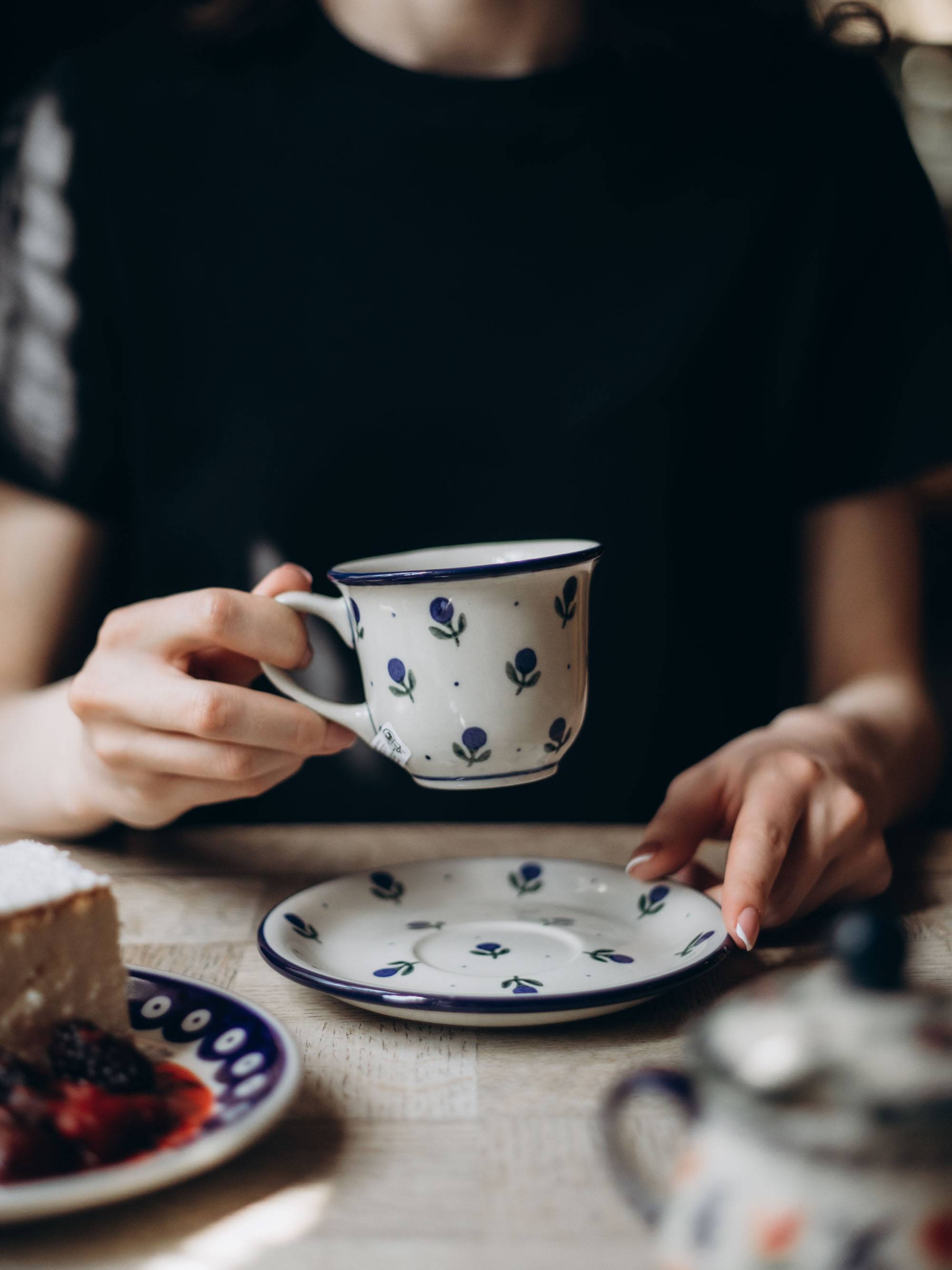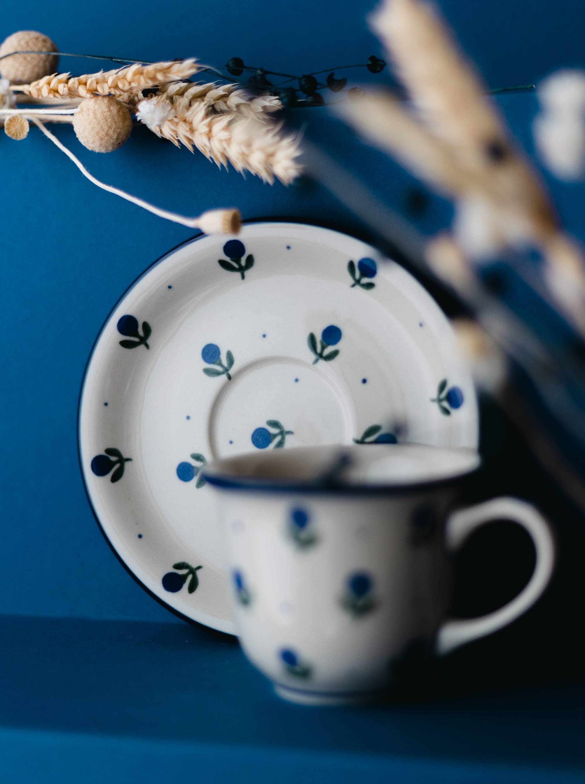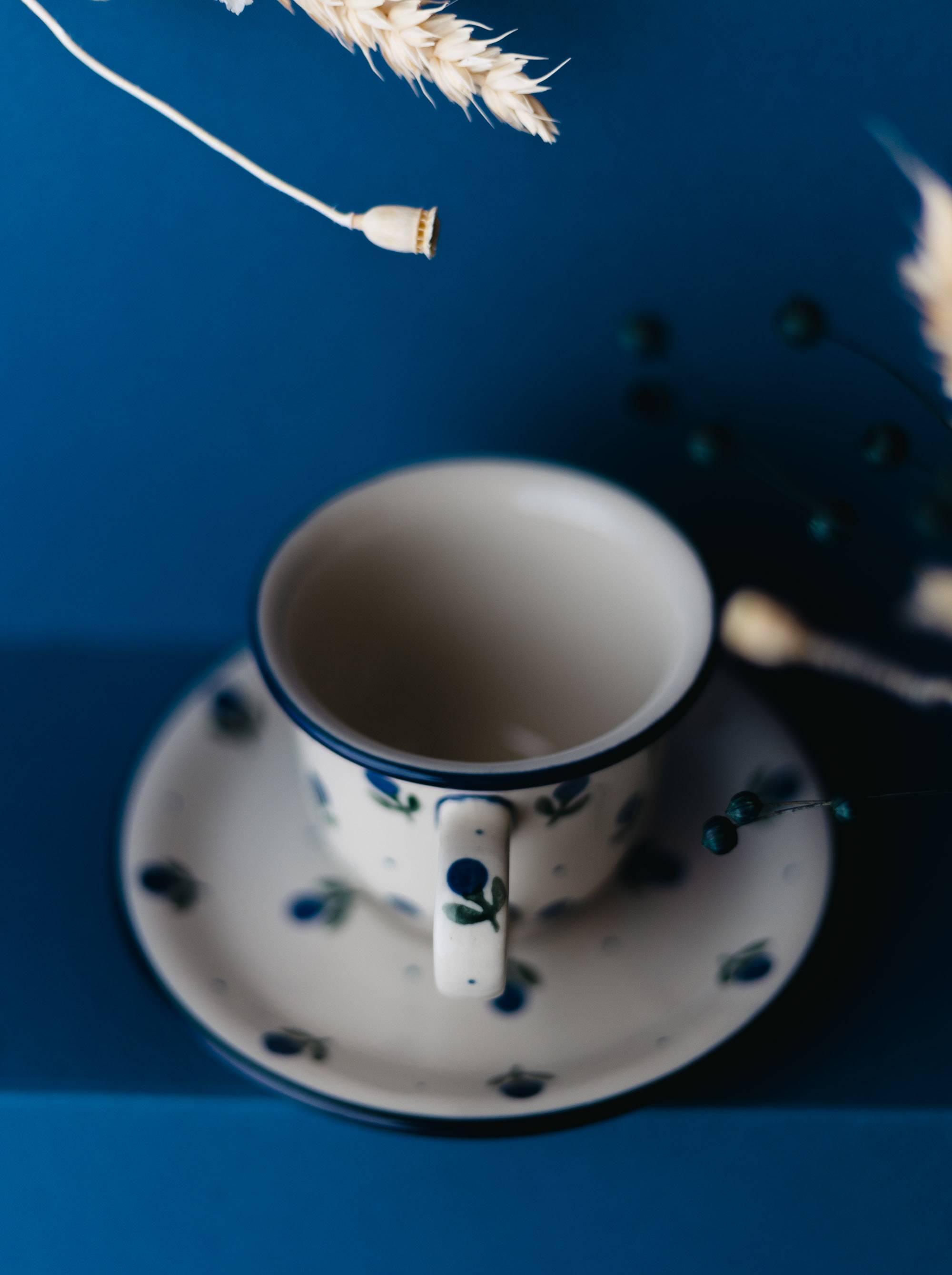 Kawowa filiżanka z wywiniętym brzegiem, w komplecie z talerzykiem. Jasna ceramika została ozdobiona ręcznie, kobaltowo-zielonym wzorem jagódek. Podstawek posiada delikatne wgłębienie, które pozwala utrzymać filiżankę w odpowiednim miejscu. Komplet został wykonany w „Ceramice Artystycznej” w Bolesławcu.