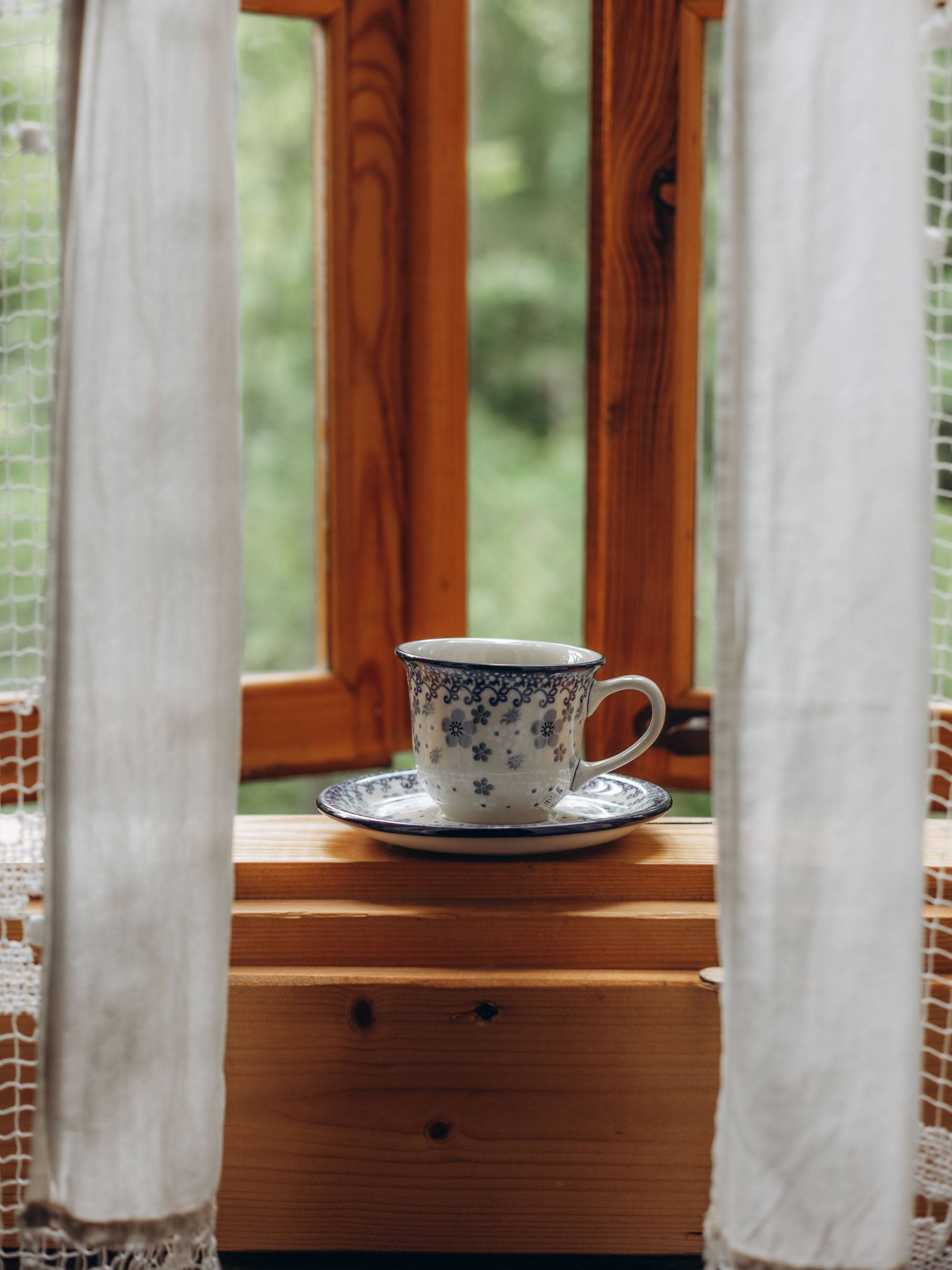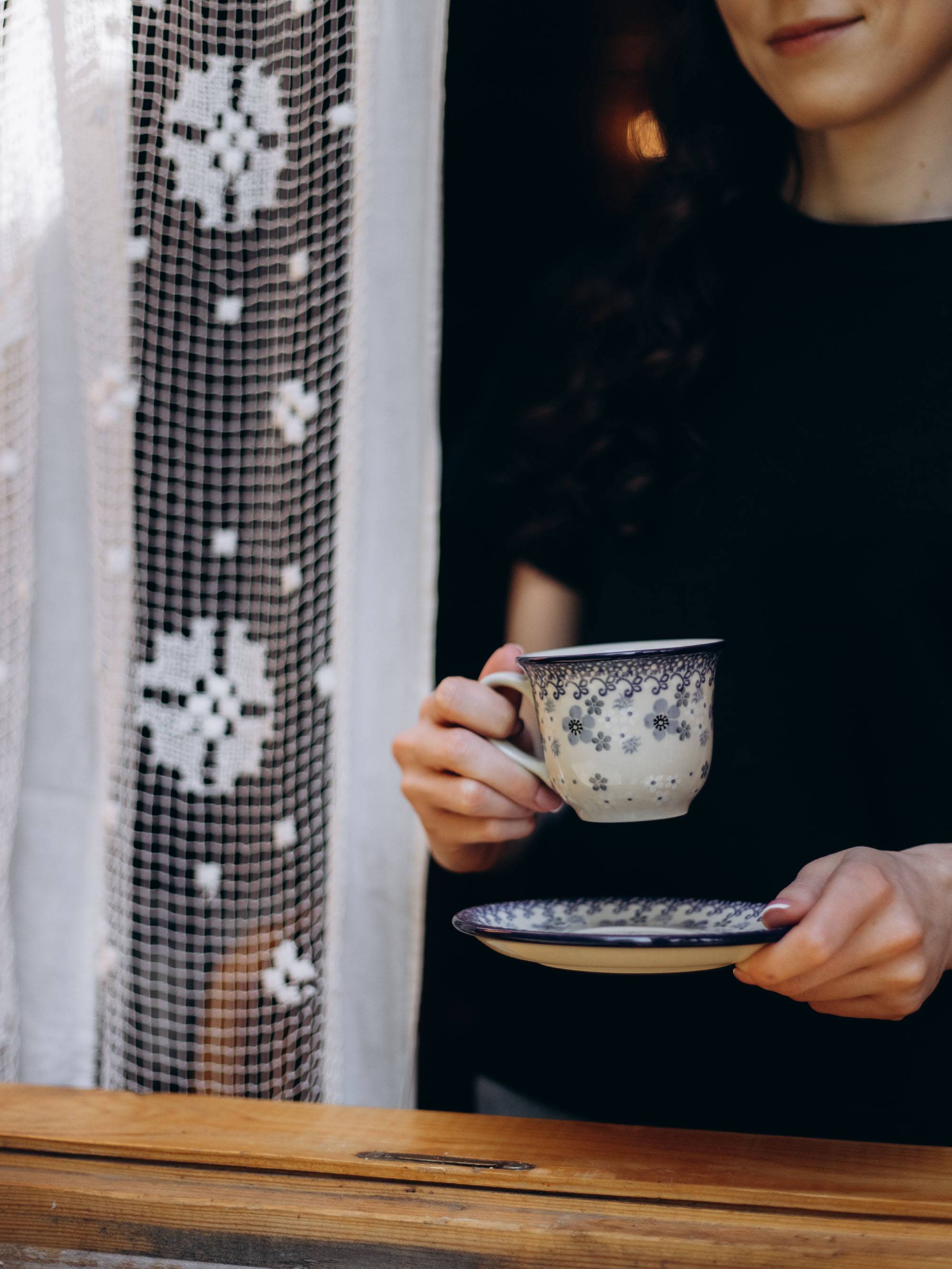 Kawowa filiżanka z wywiniętym brzegiem, w komplecie z talerzykiem. Jasna ceramika została ozdobiona ręcznie, niebiesko-kobaltowym wzorem koronki. Podstawek posiada delikatne wgłębienie, które pozwala utrzymać filiżankę w odpowiednim miejscu. Komplet został wykonany w „Ceramice Artystycznej” w Bolesławcu.