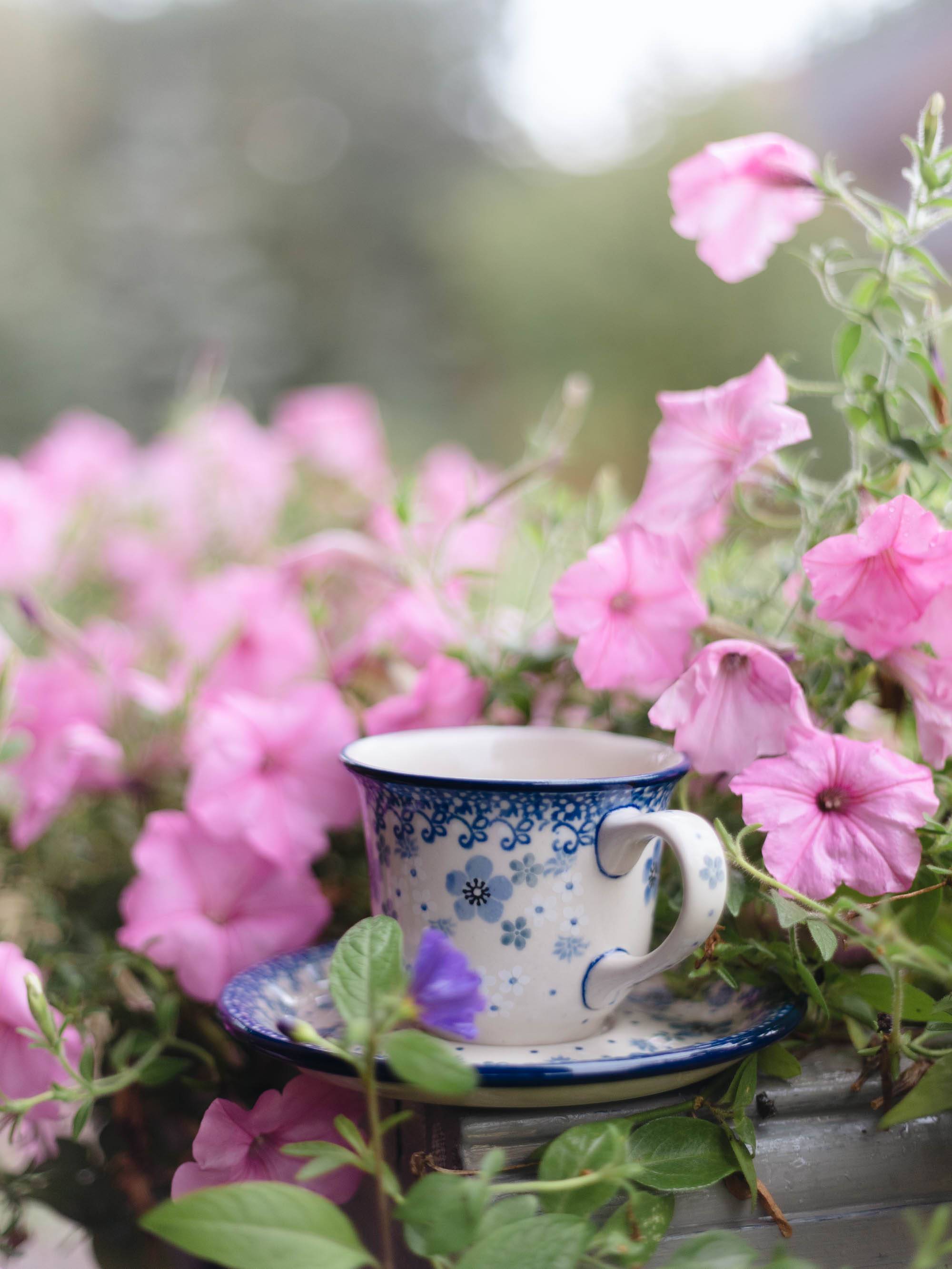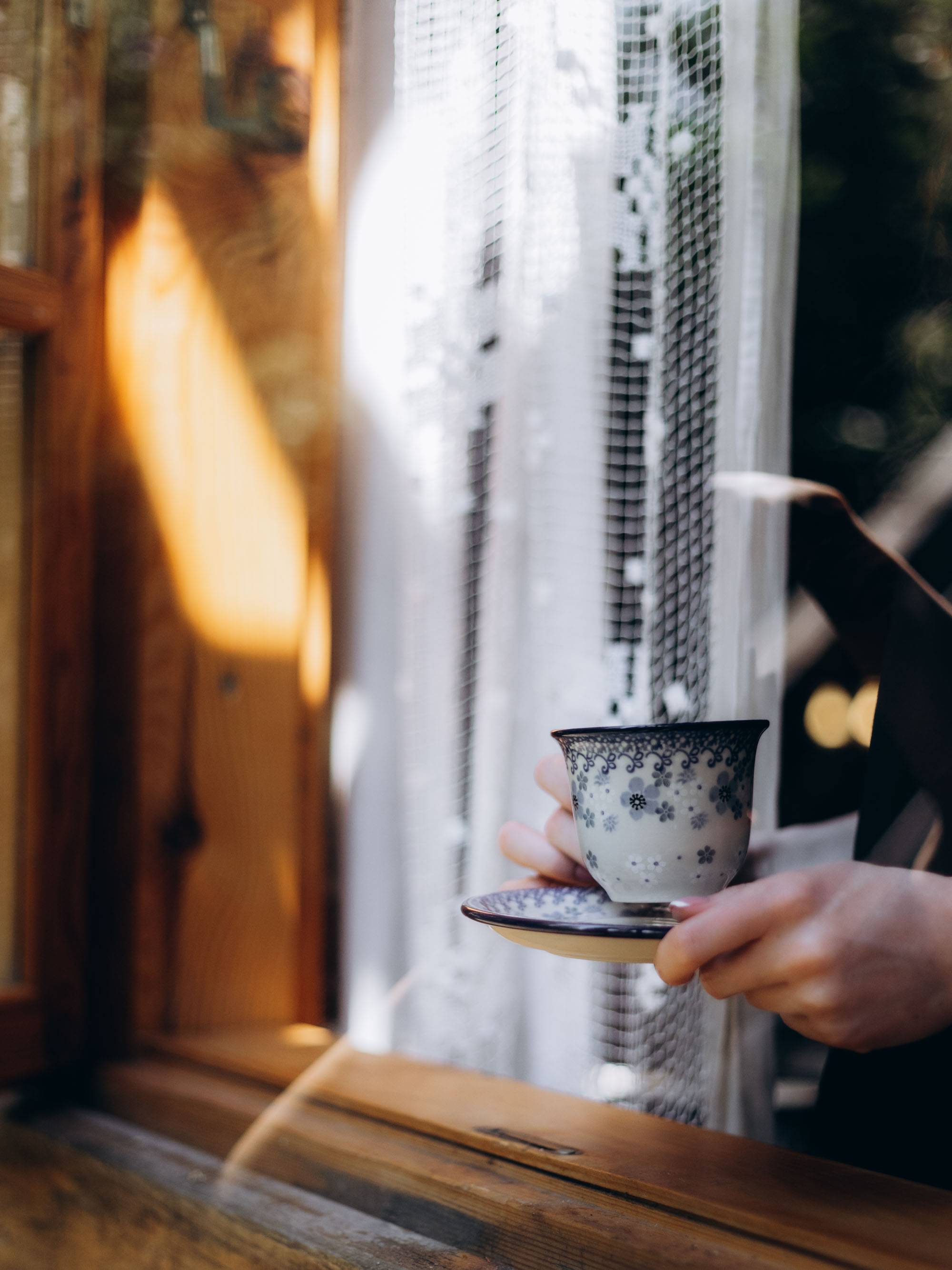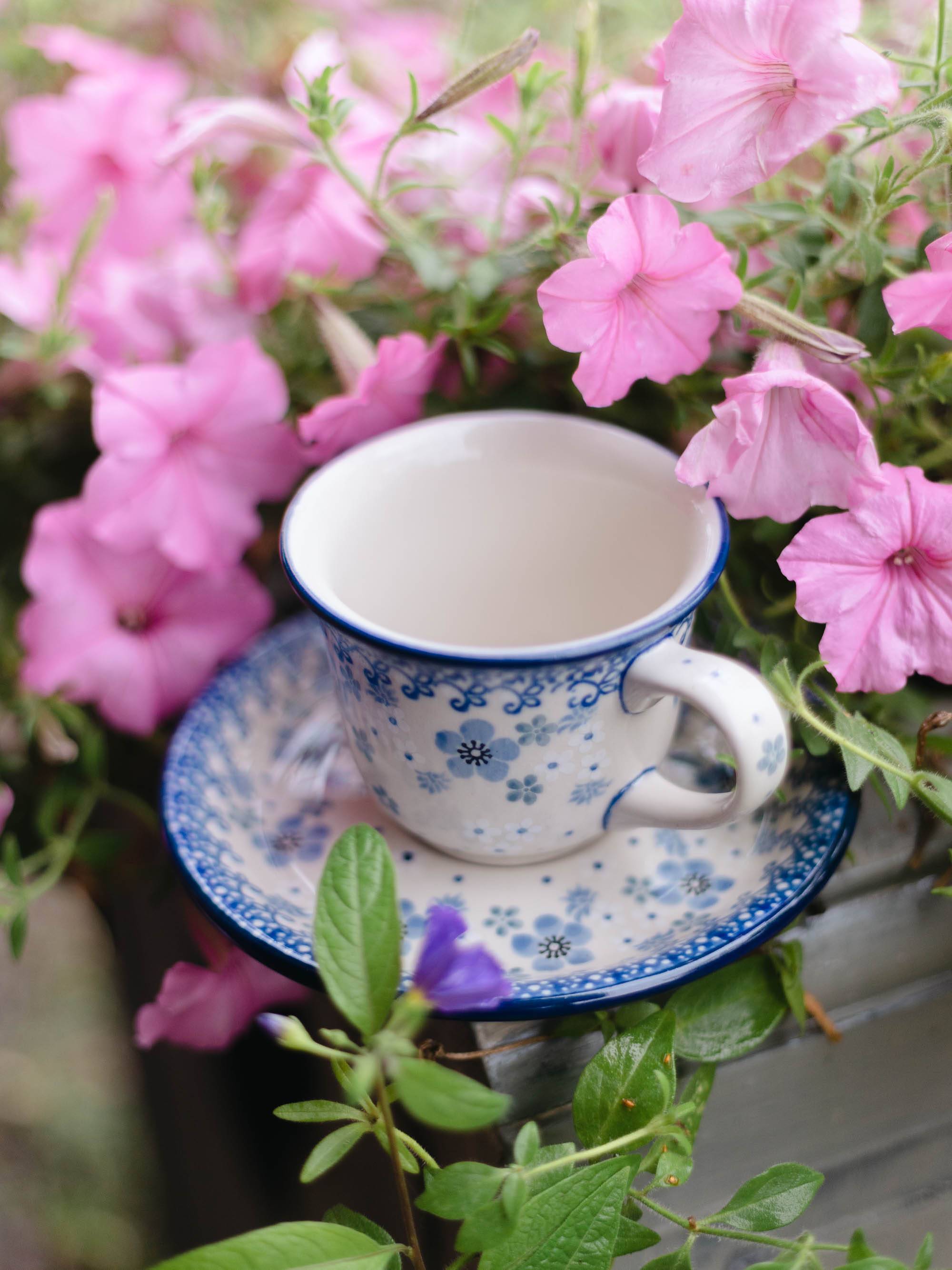 Kawowa filiżanka z wywiniętym brzegiem, w komplecie z talerzykiem, ozdobiona delikatnym, niebiesko-kobaltowym wzorem kwiecistej koronki.