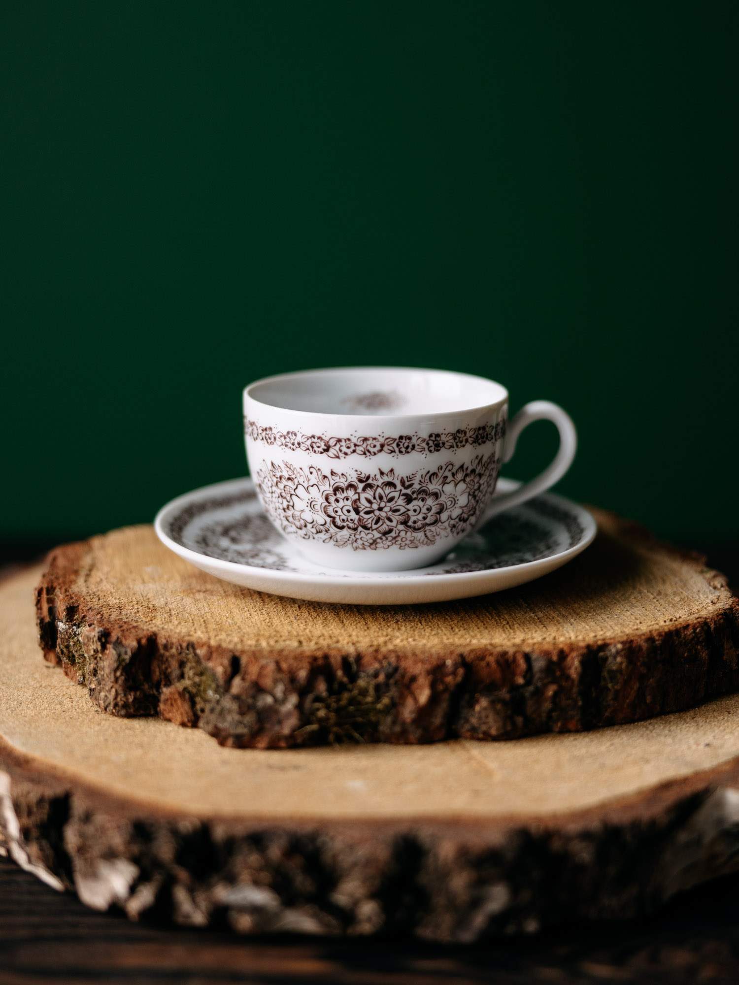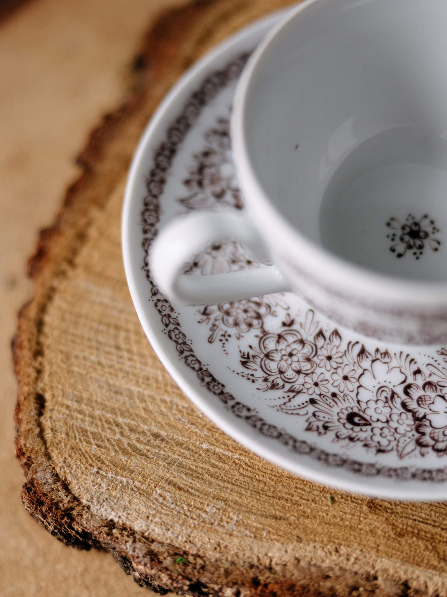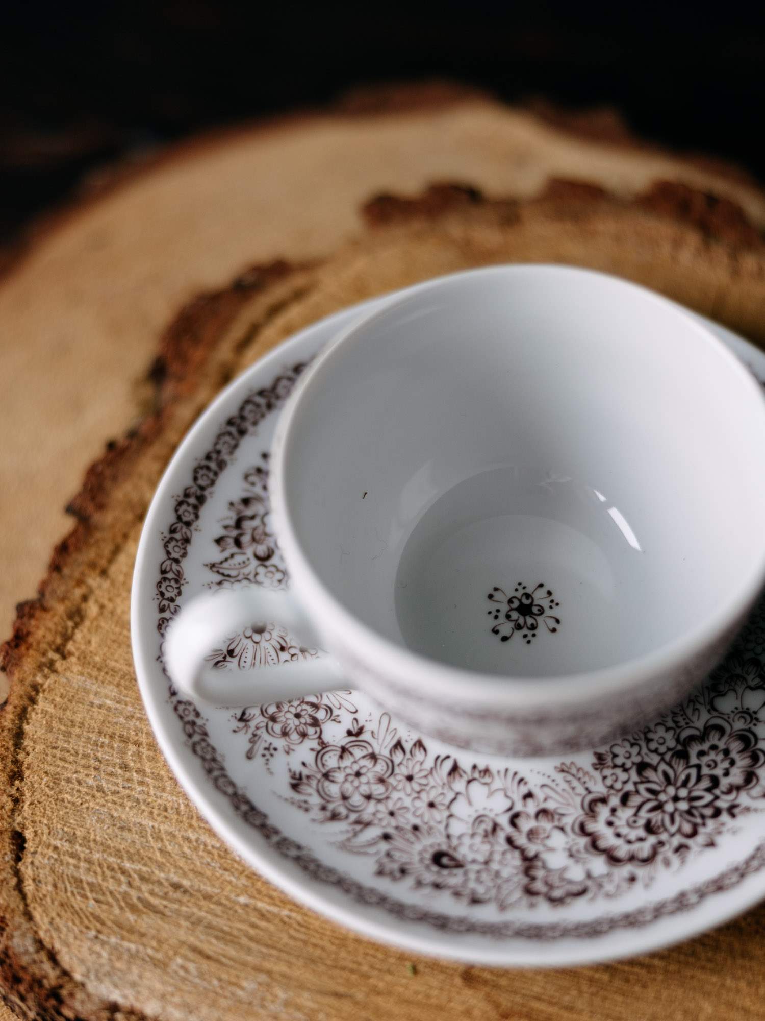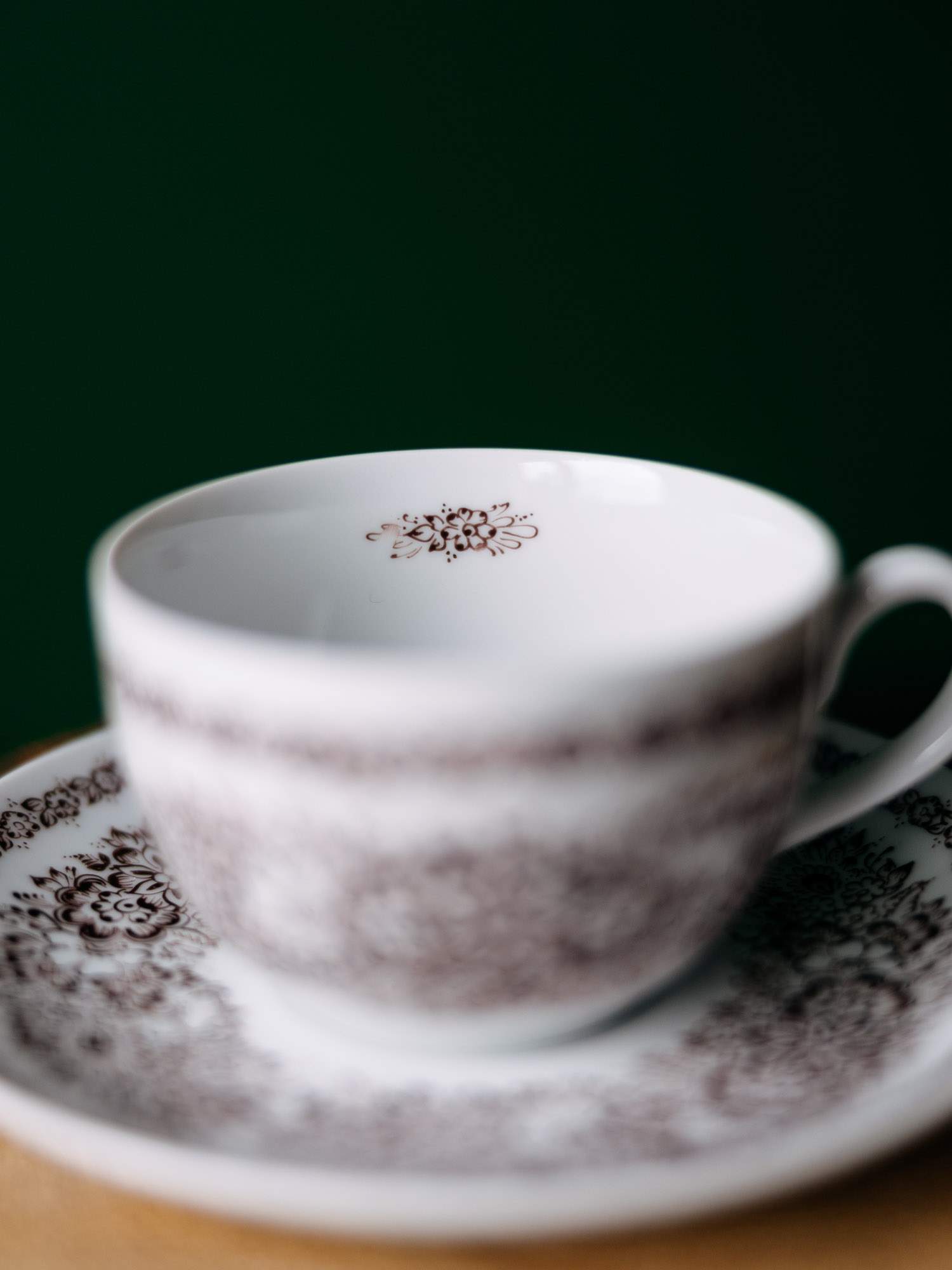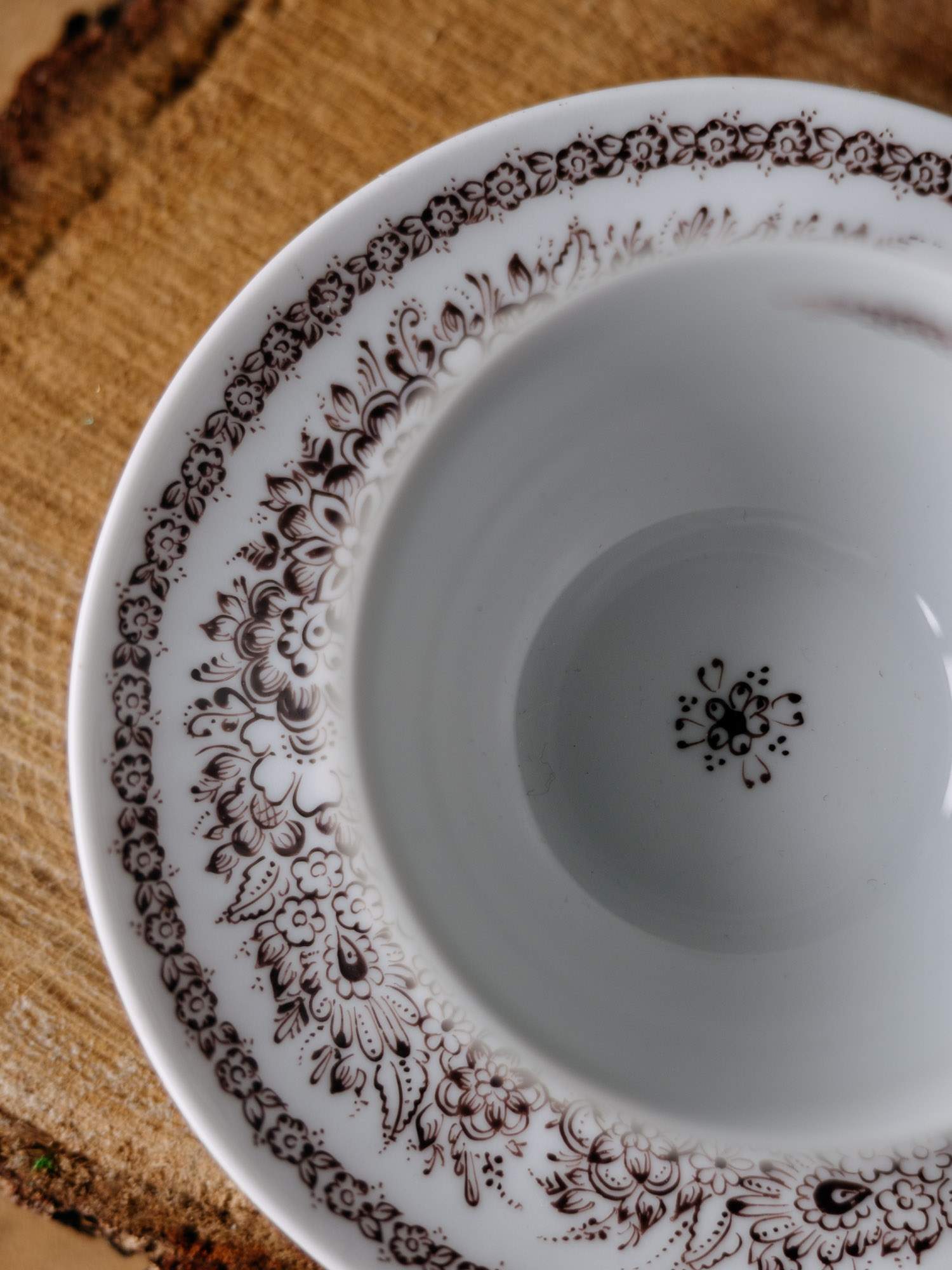 Okrągła filiżanka ze spodkiem wykonana z porcelany opolskiej, zdobiona delikatnym kwiatowym wzorem w brązowym odcieniu.