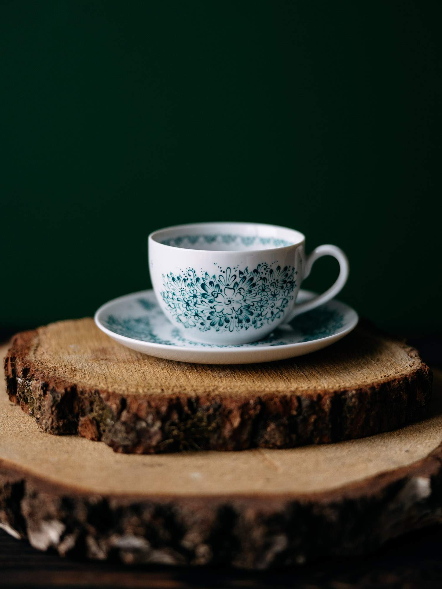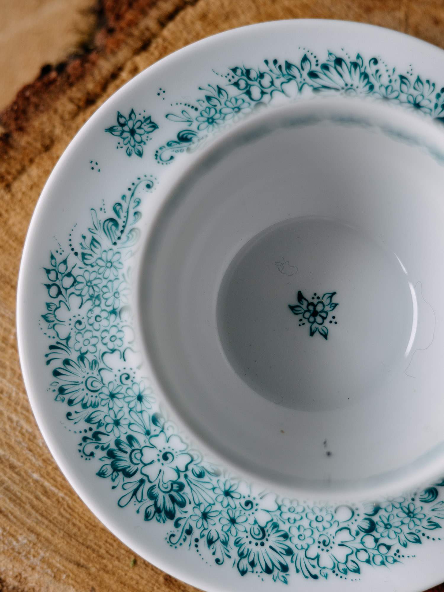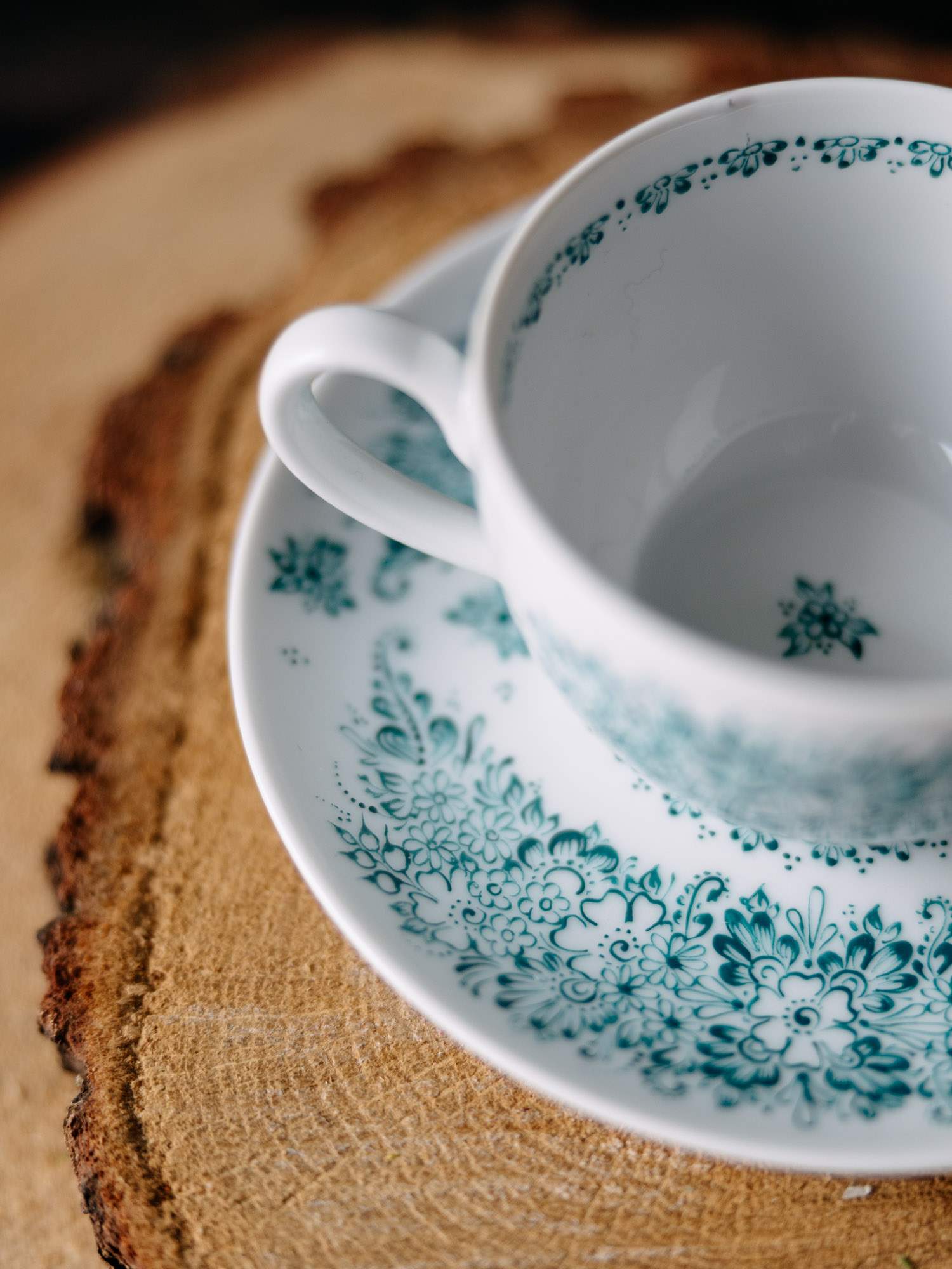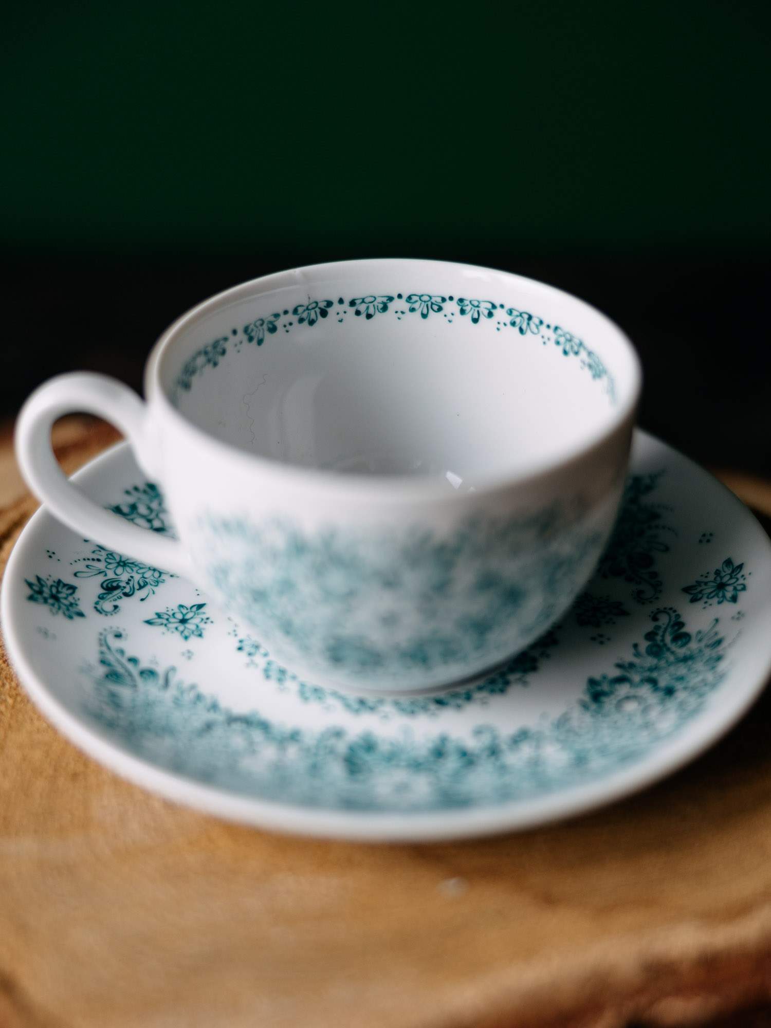 Okrągła, porcelanowa filiżanka w zestawie ze spodkiem, zdobiona delikatnym kwiatowym wzorem w morskim odcieniu.