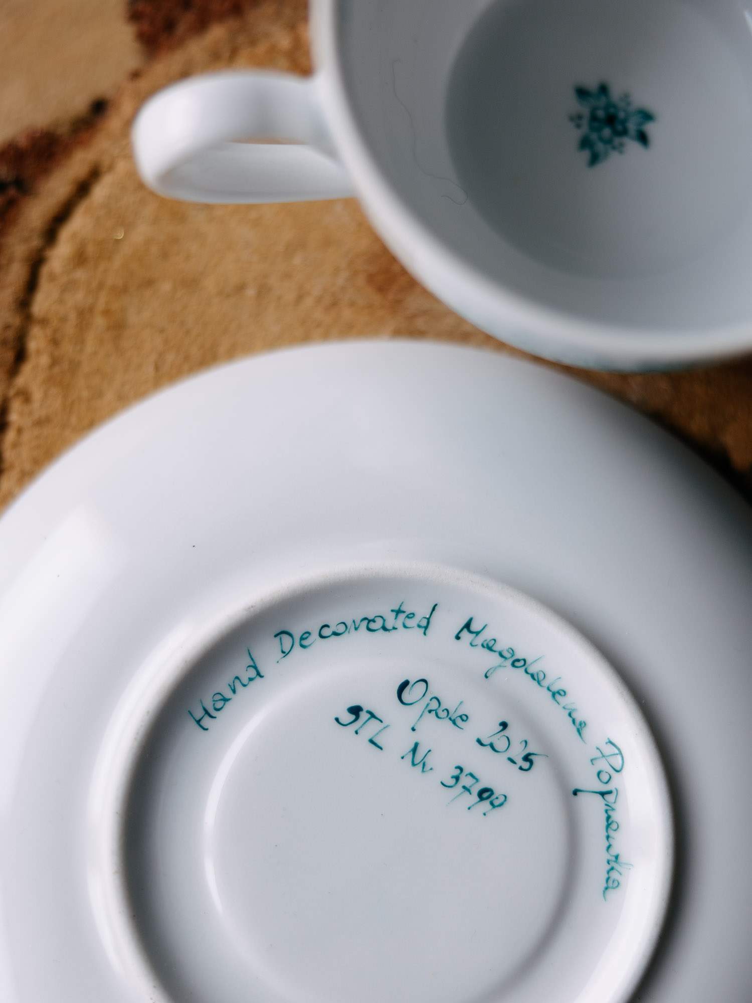 Okrągła, porcelanowa filiżanka w zestawie ze spodkiem, zdobiona tradycyjnym, opolskim wzorem. Charakterystyczne zdobienia w postaci morskich kwiatów zostały naniesione ręcznie na białą porcelanę. Filiżanka została wykonana przez Twórczynię Ludową z regionu opolskiego.