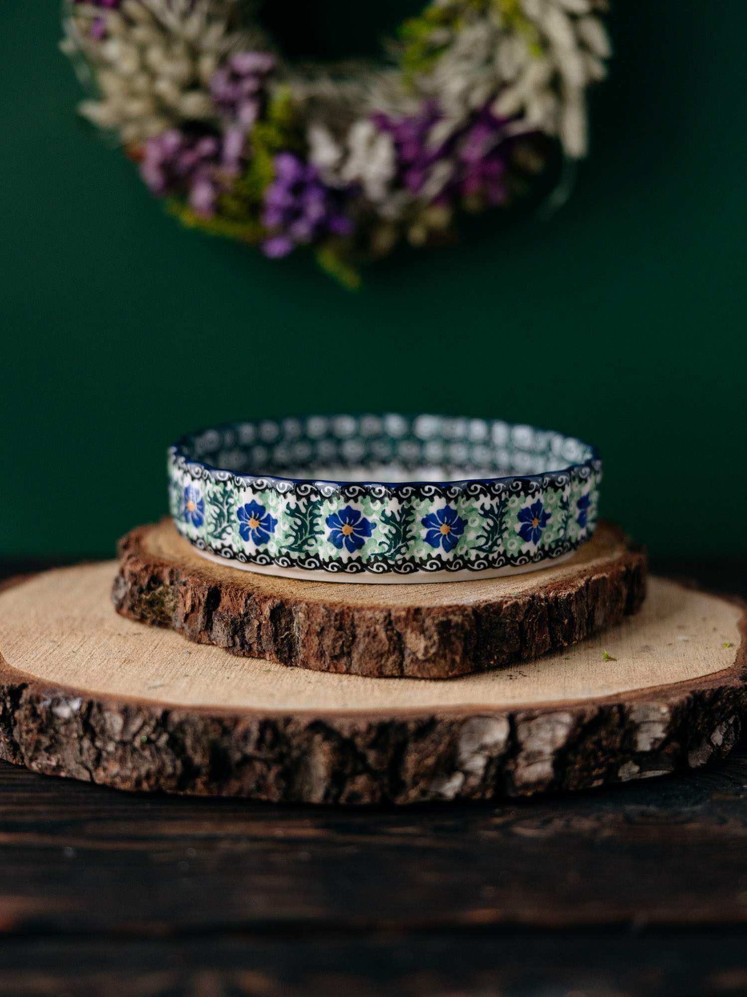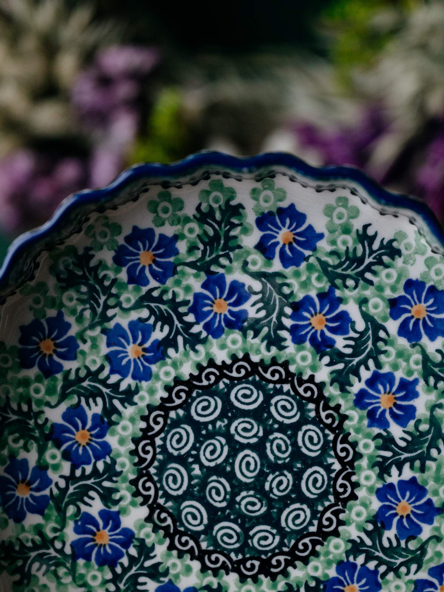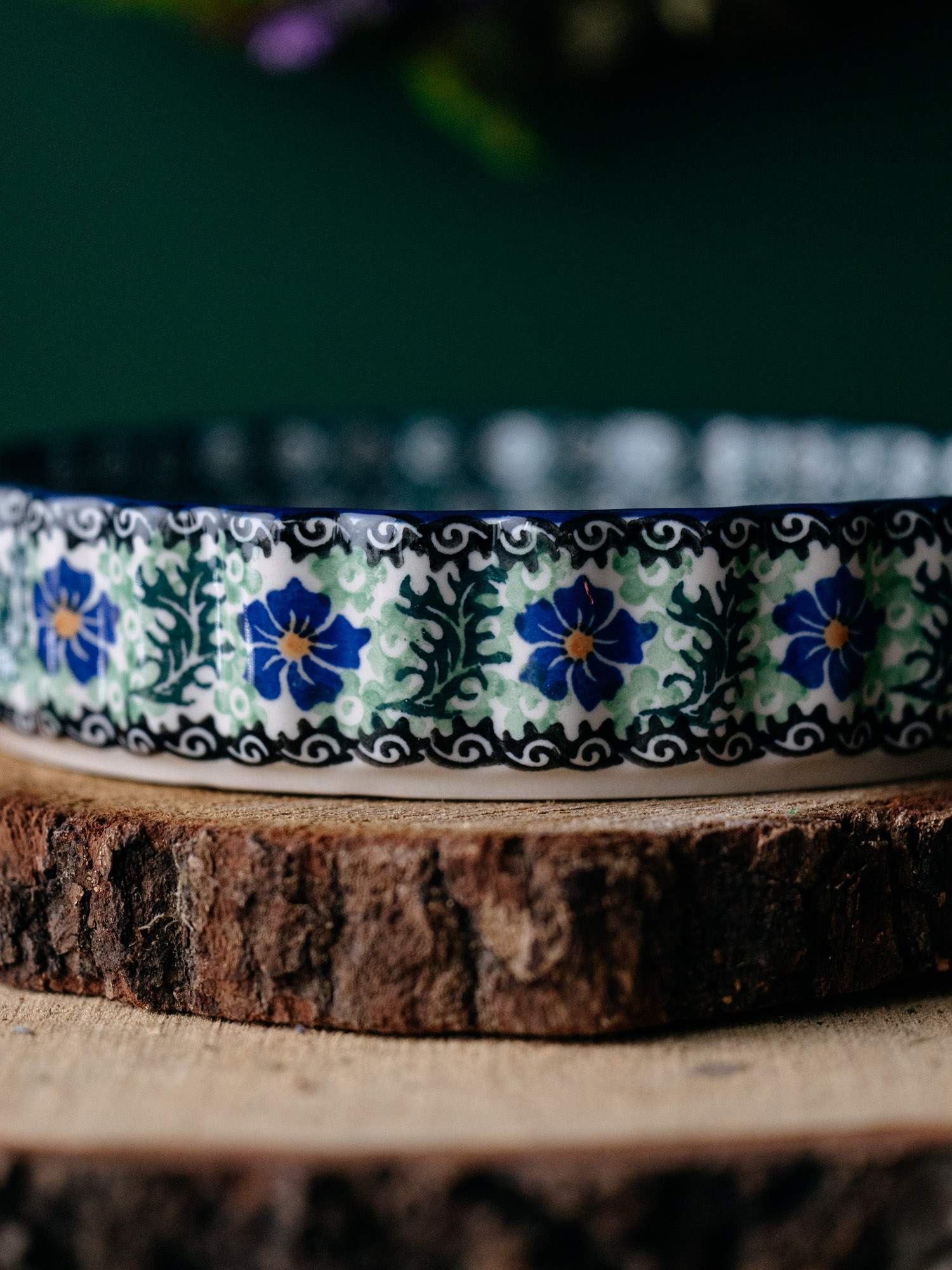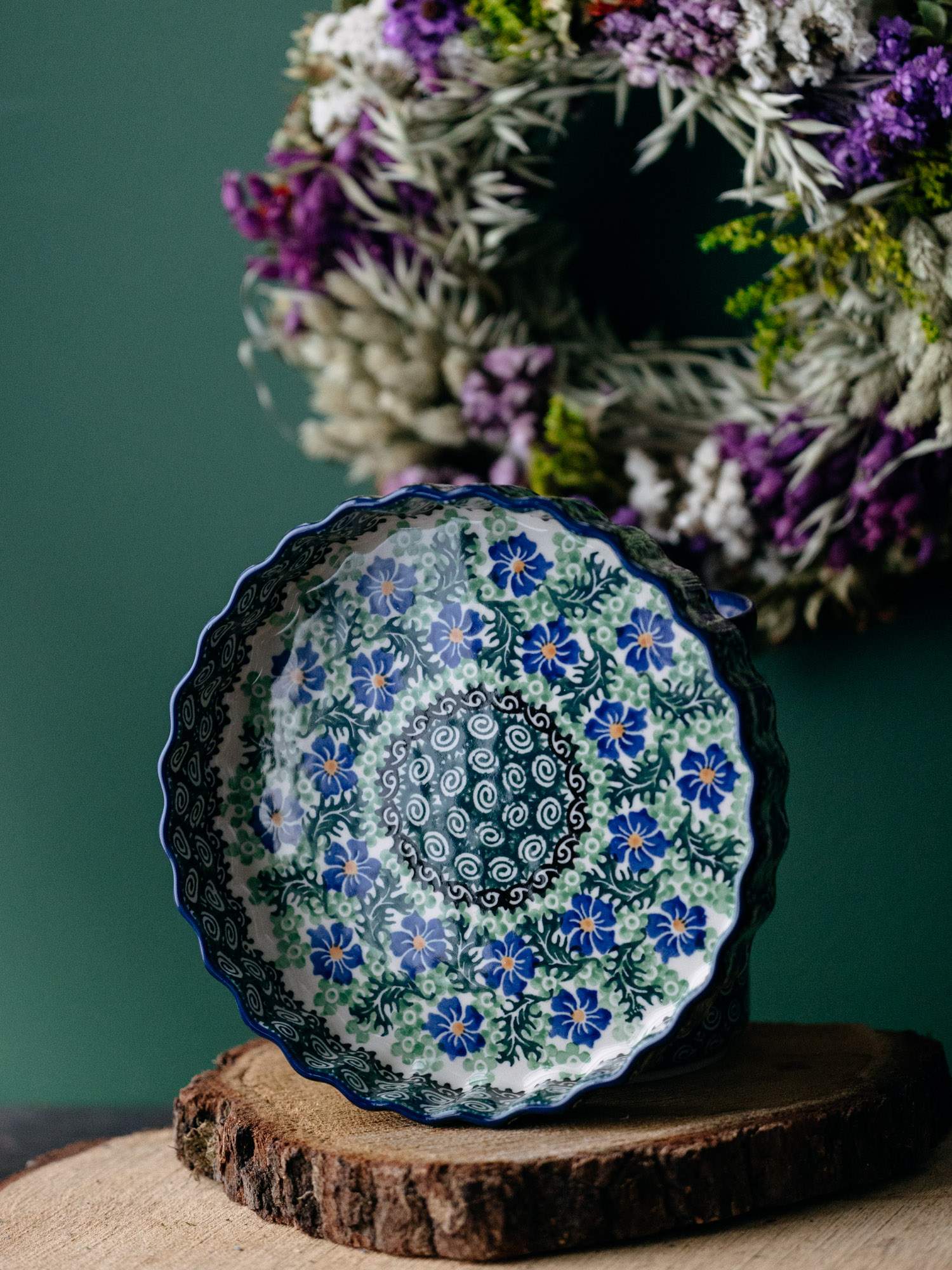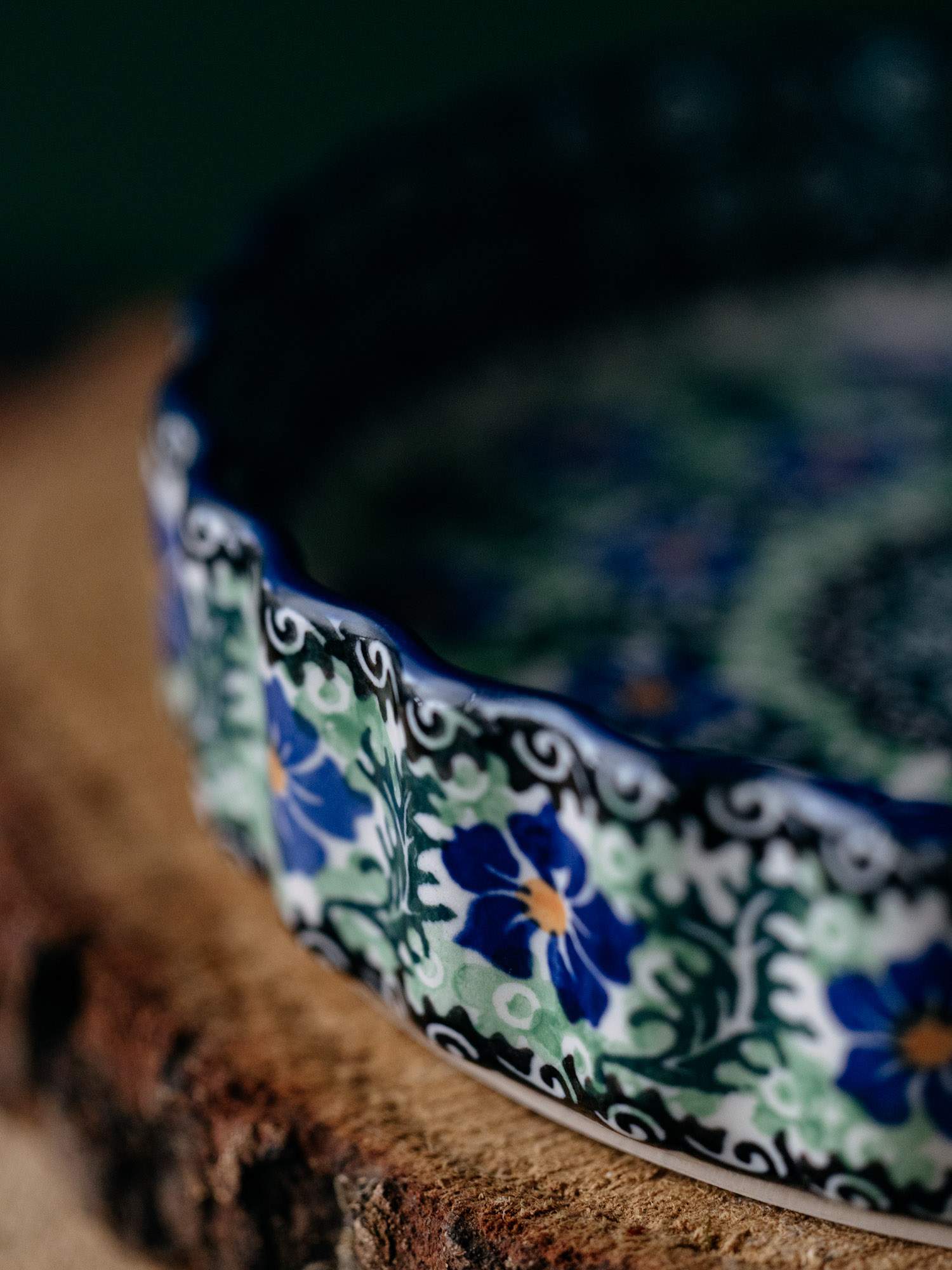 Okrągła forma do pieczenia tarty z falistym wykończeniem. Jasna ceramika została ozdobiona ręcznie, kobaltowo-zielonym wzorem chabrów. Szerokość naczynia zestawiono z niskimi ściankami, co pozwala na dokładne zapieczenie przyrządzanej potrawy. Forma do pieczenia została wykonana w „Ceramice Artystycznej” w Bolesławcu.