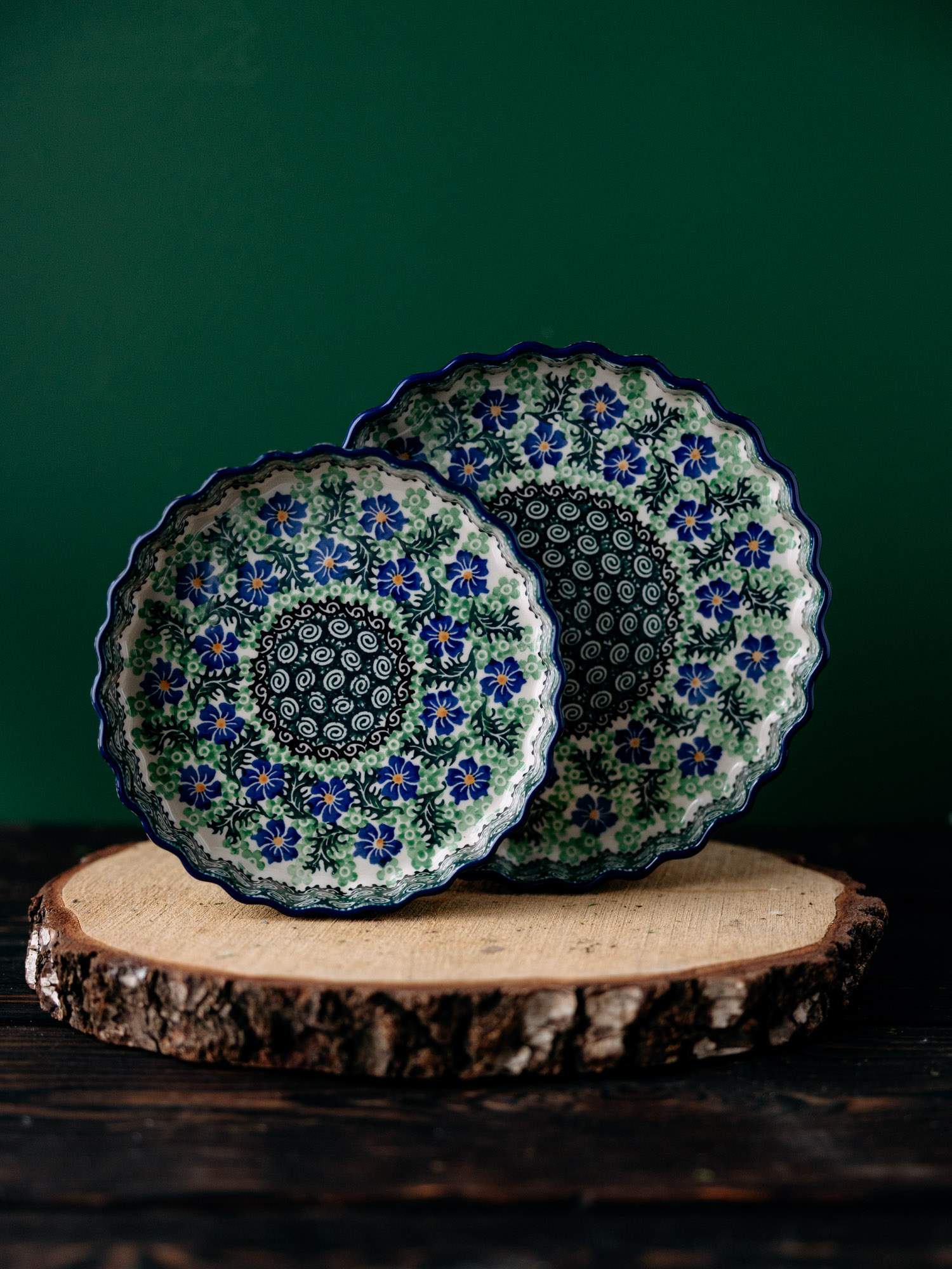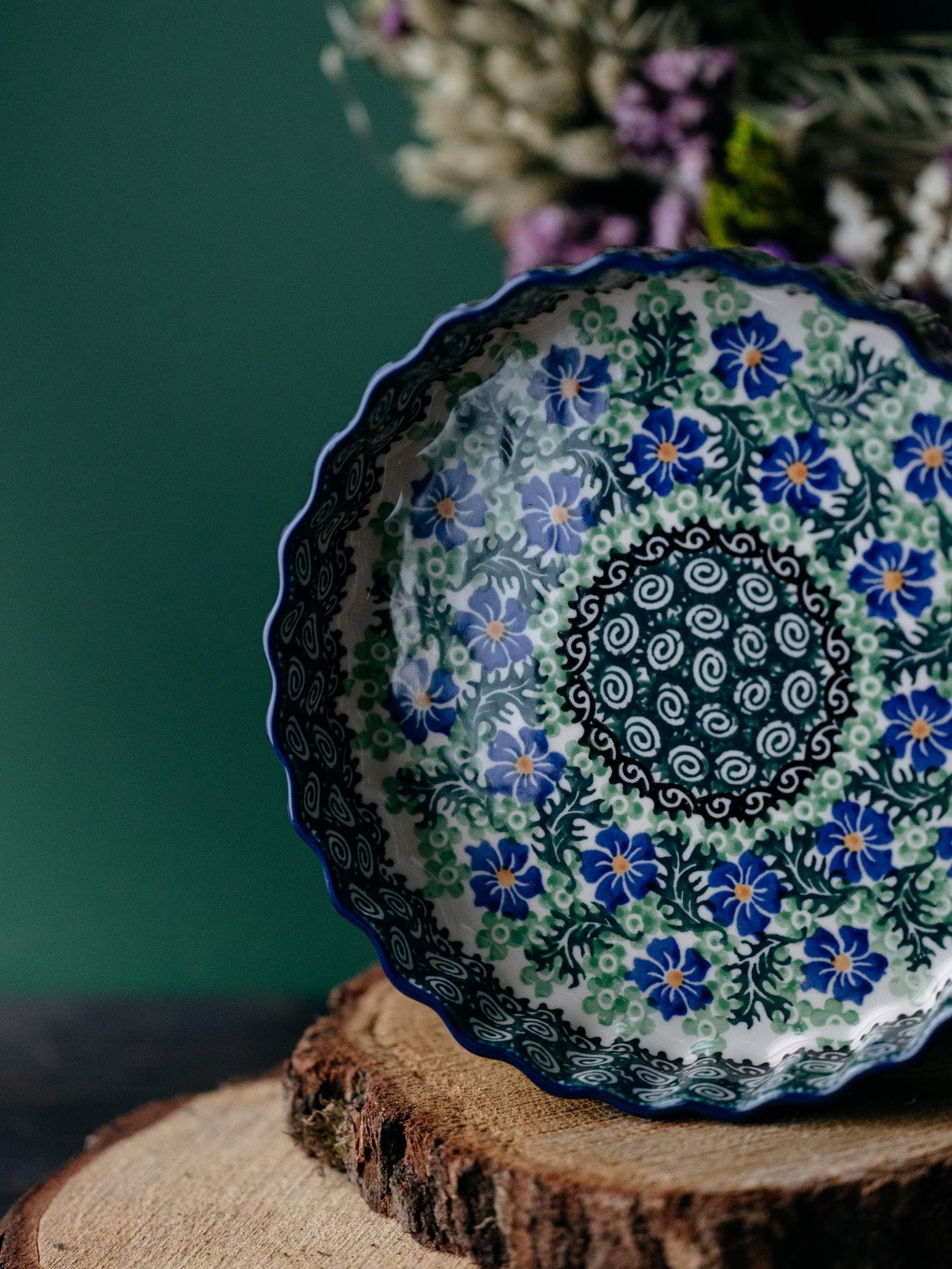 Okrągła forma do pieczenia tarty z falistym wykończeniem, ozdobiona kwiatowym, kobaltowo-zielonym wzorem chabrów.