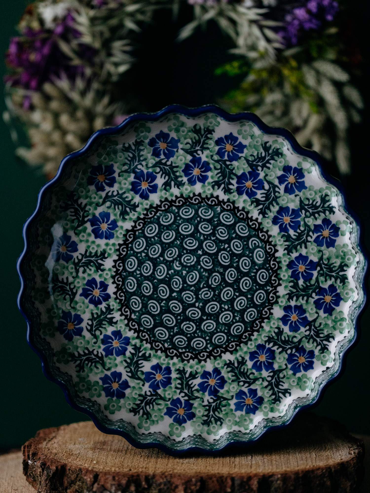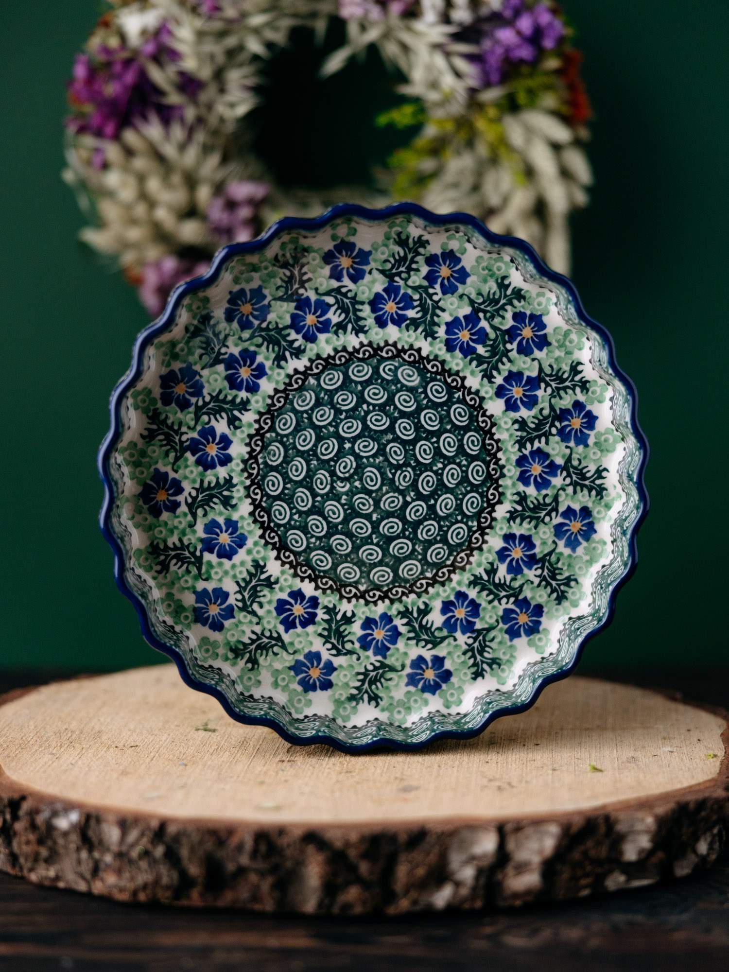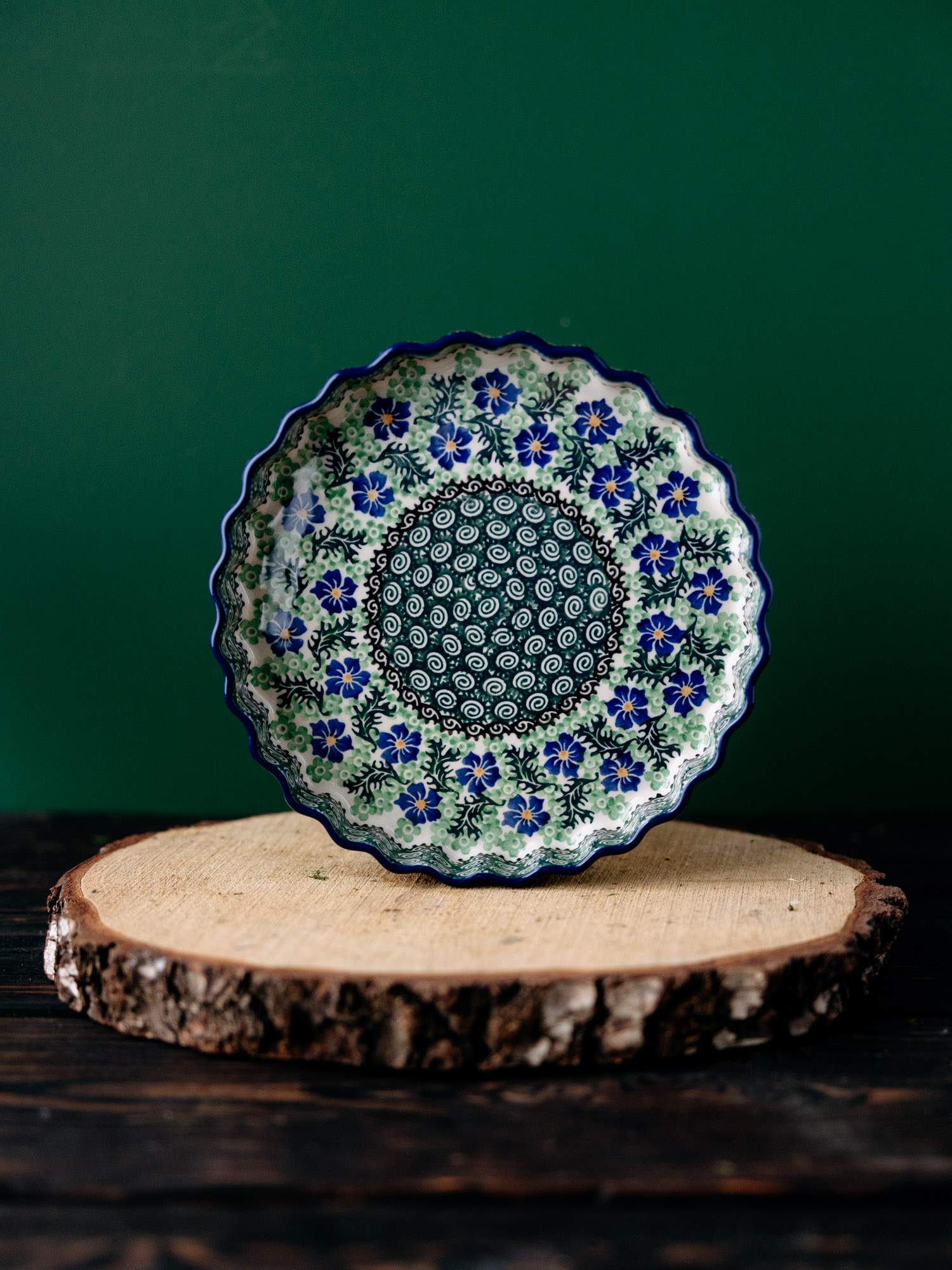 Okrągła forma do pieczenia tarty z falistym wykończeniem, ozdobiona kwiatowym, kobaltowo-zielonym wzorem chabrów.