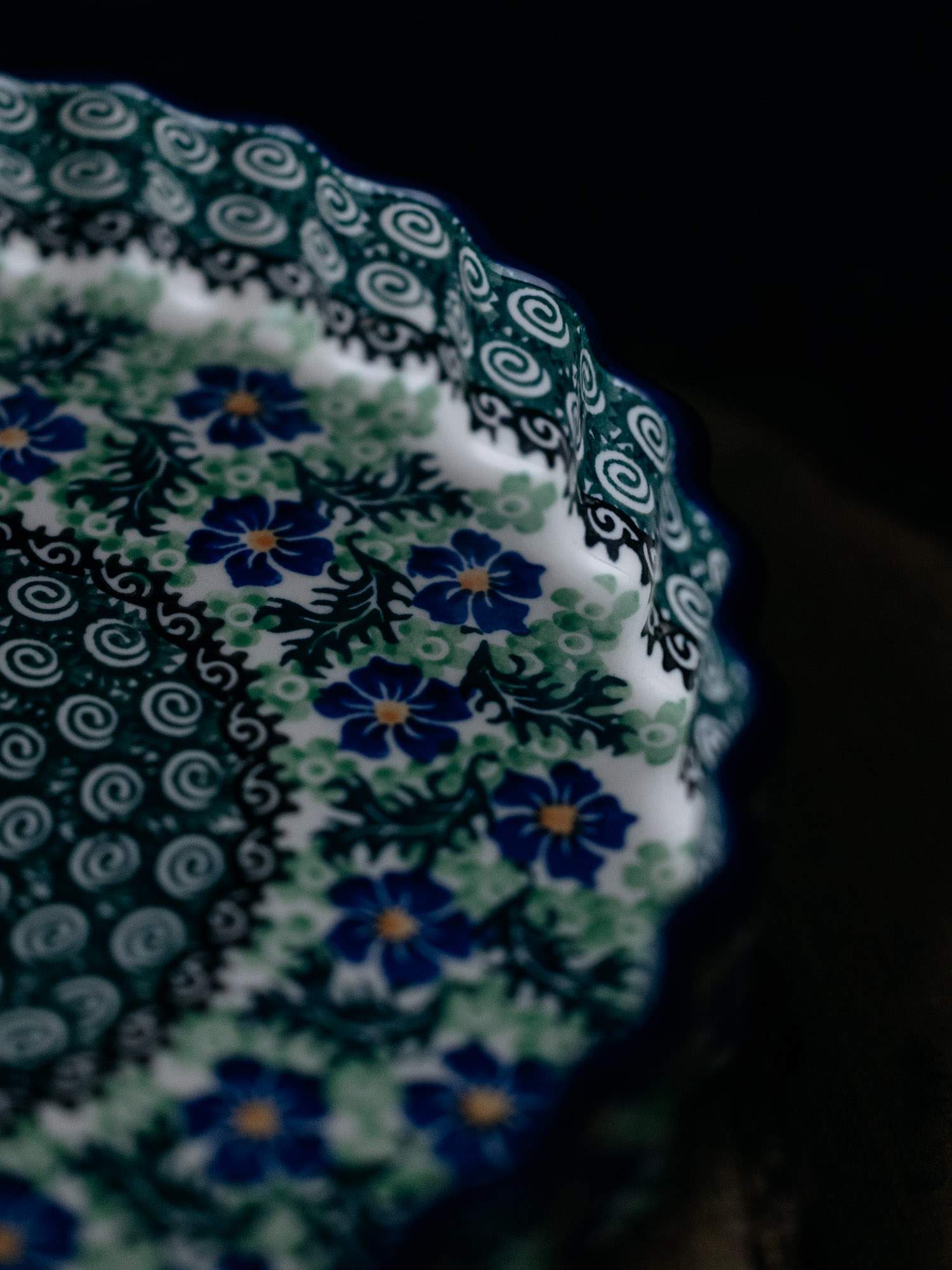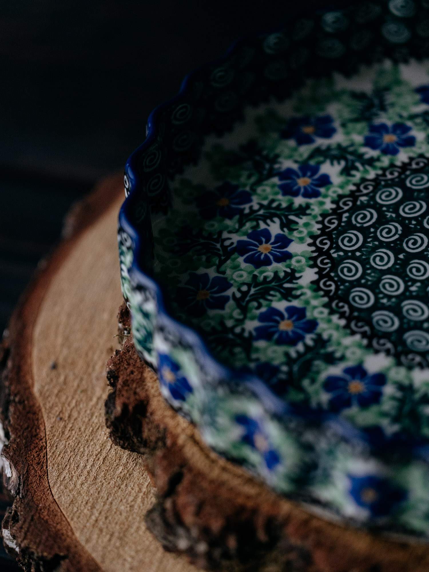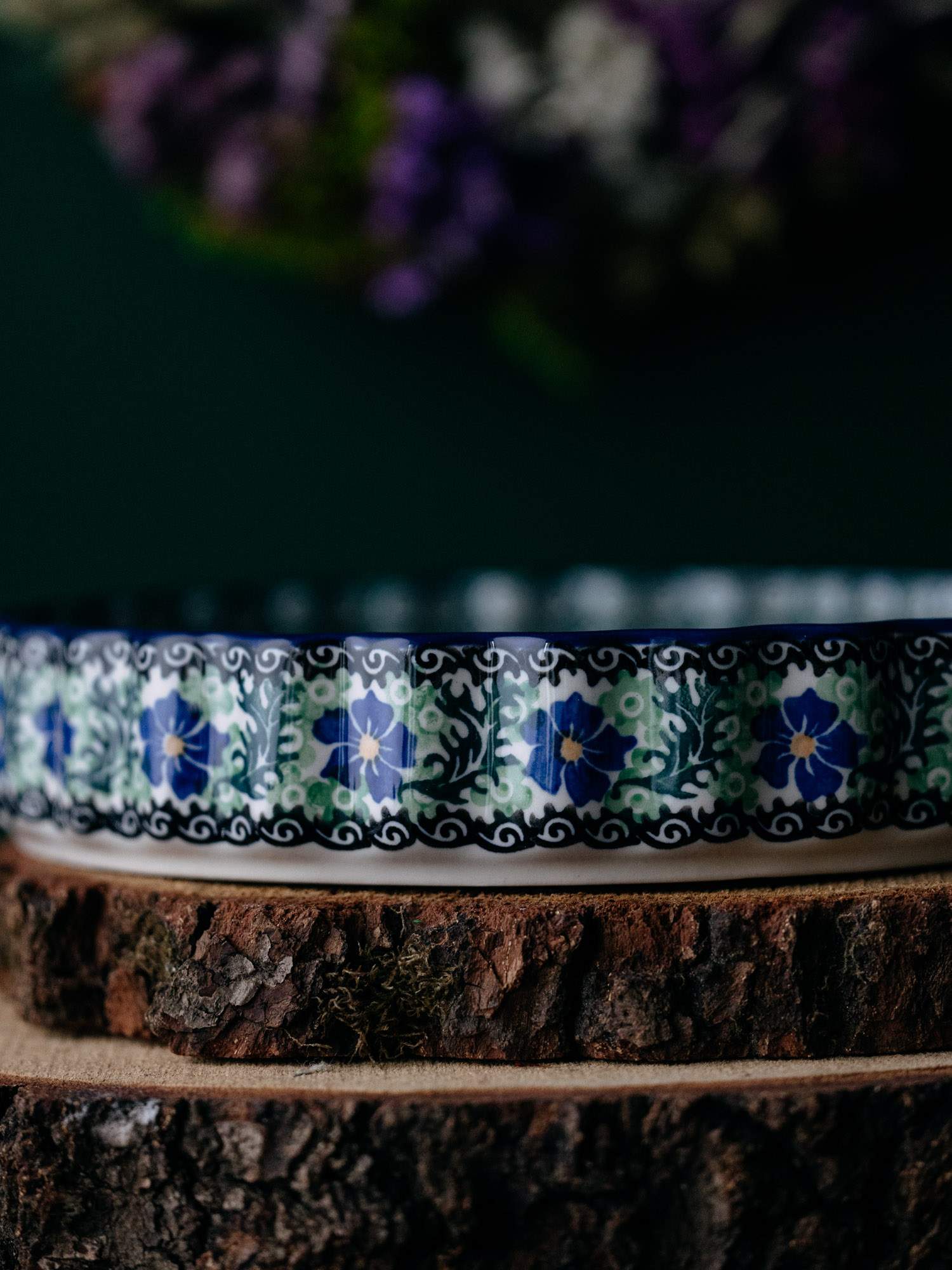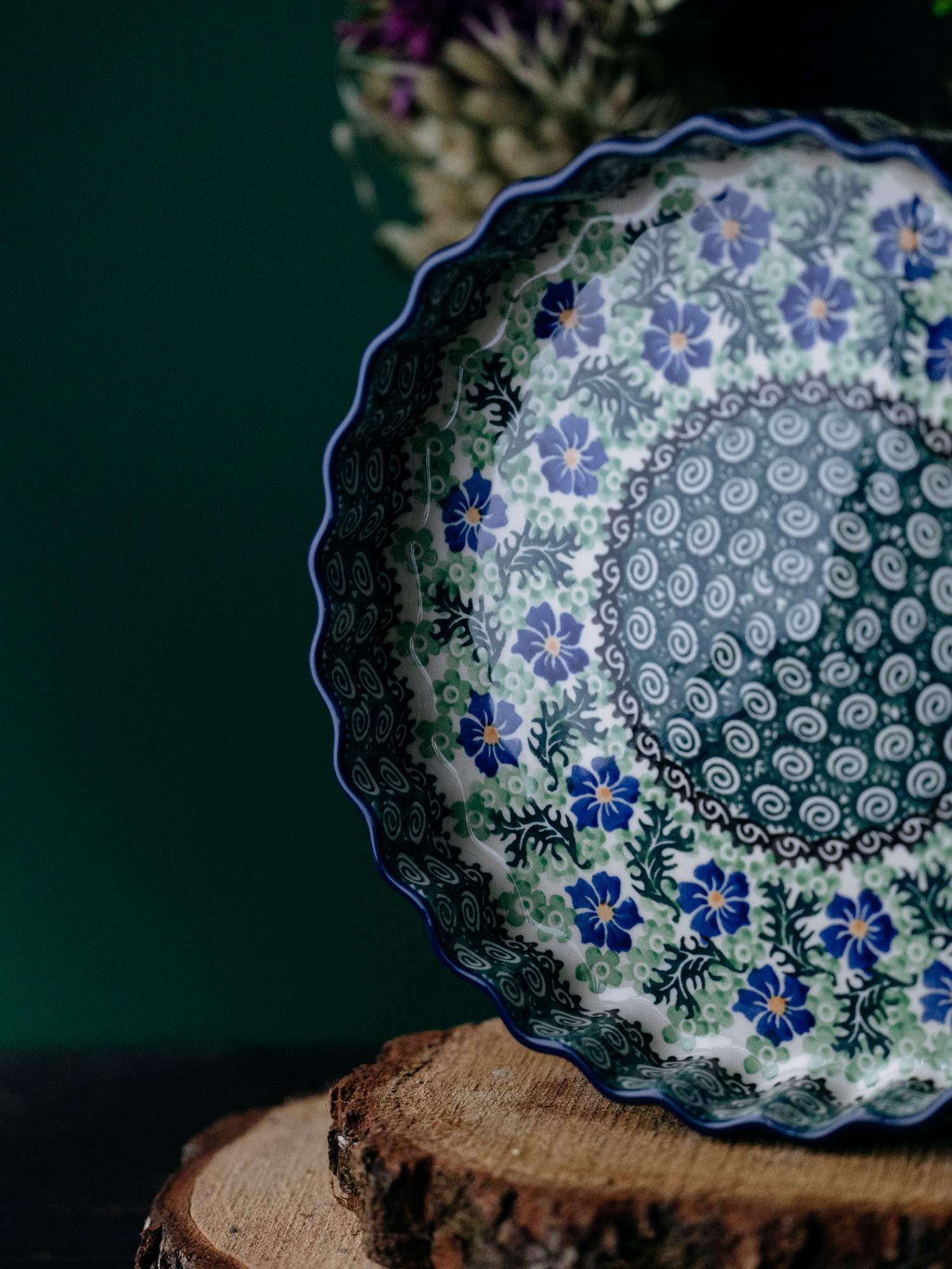 Okrągła forma do pieczenia tarty z falistym wykończeniem, ozdobiona kwiatowym, kobaltowo-zielonym wzorem chabrów.