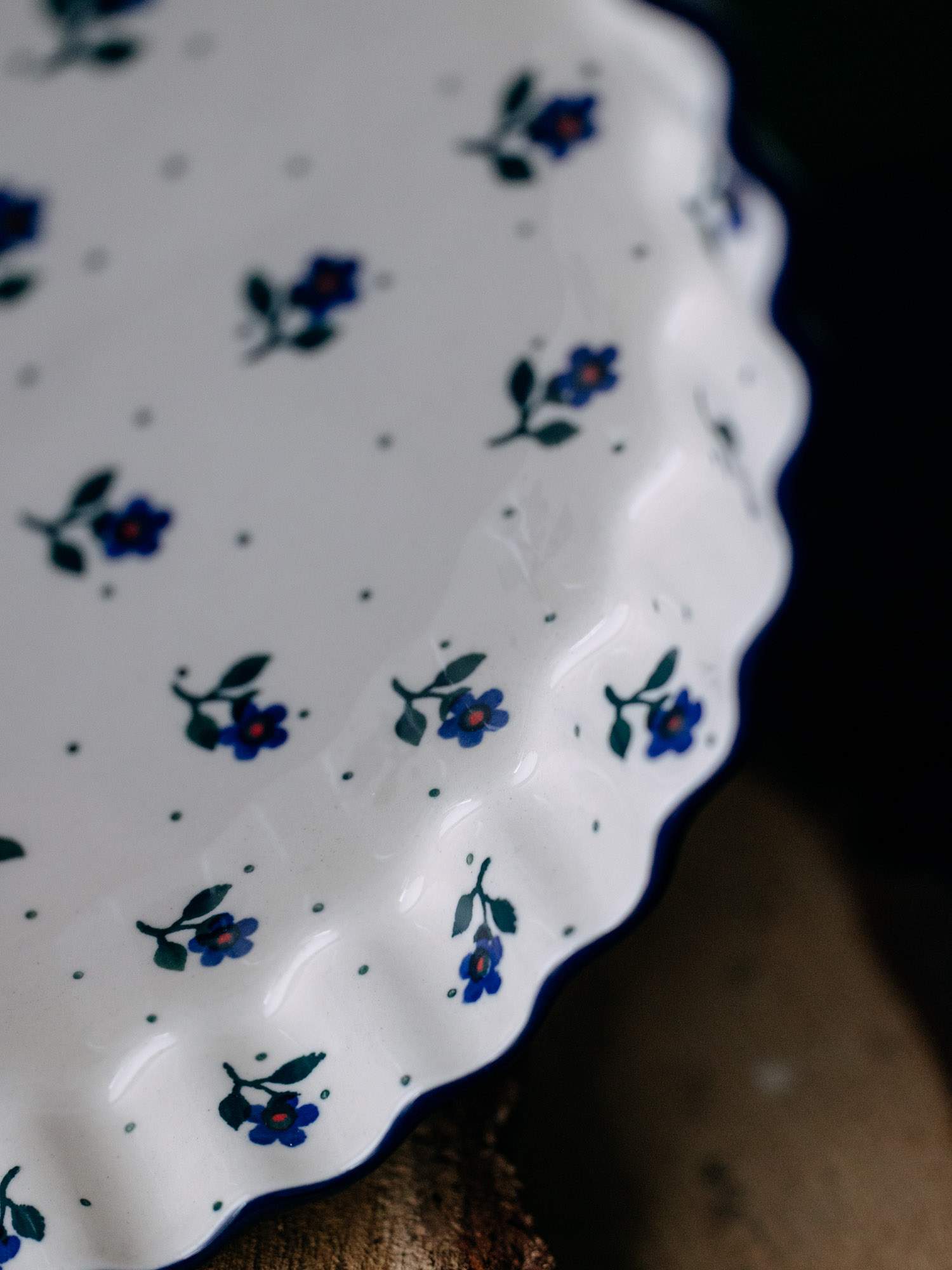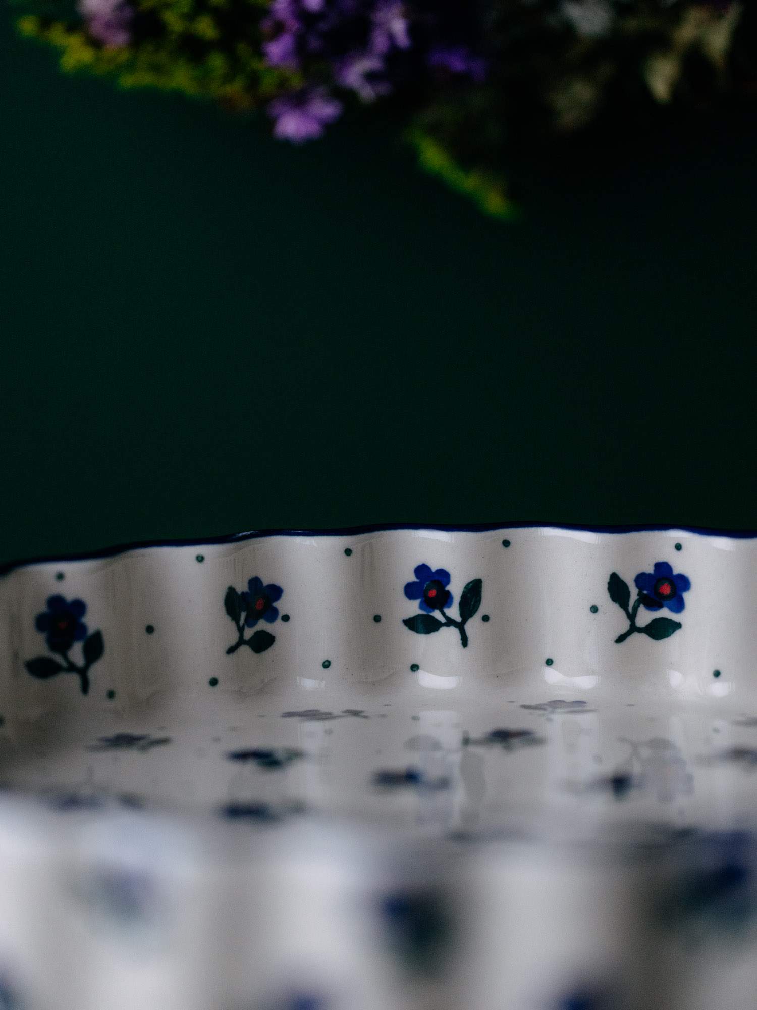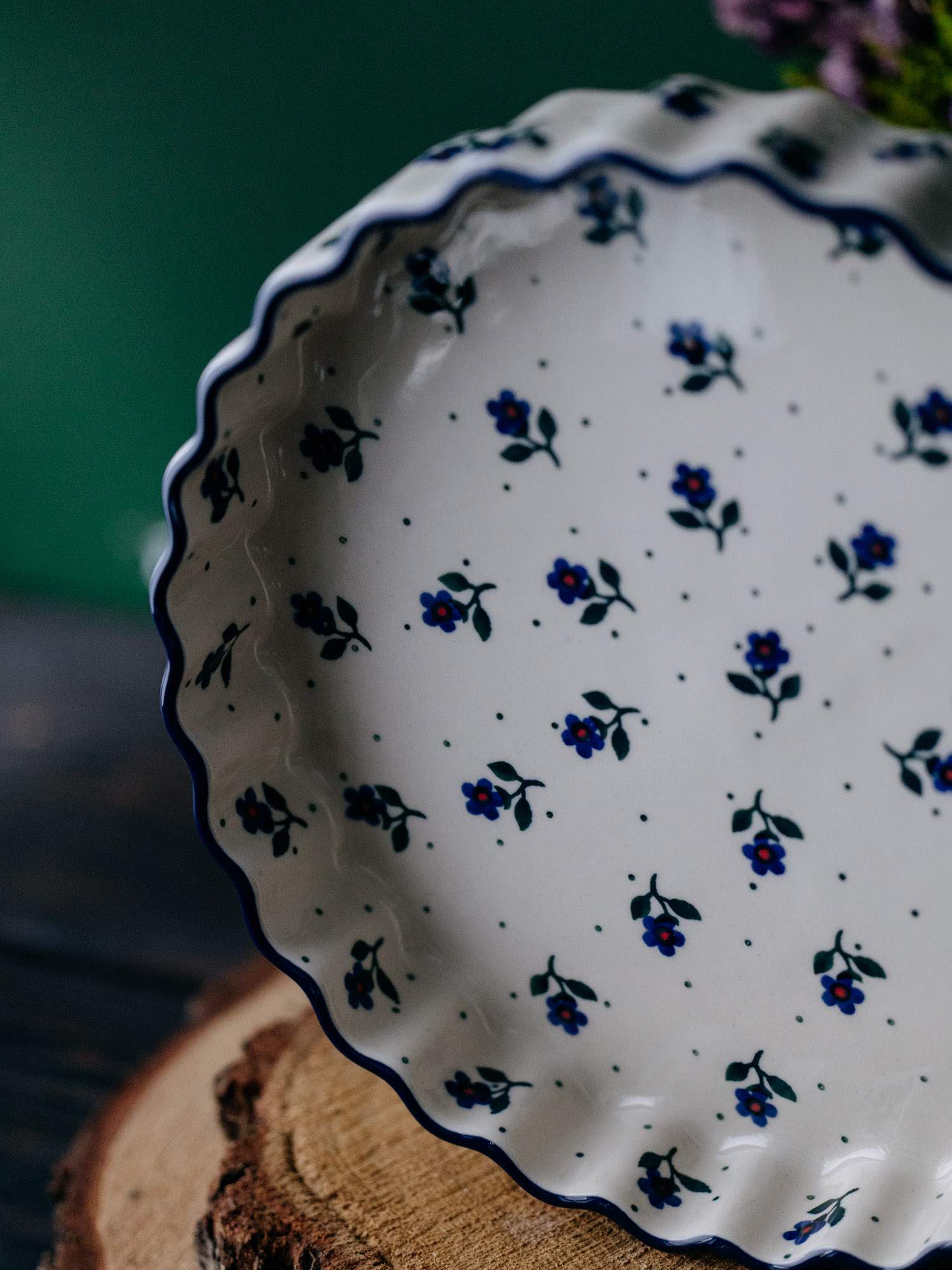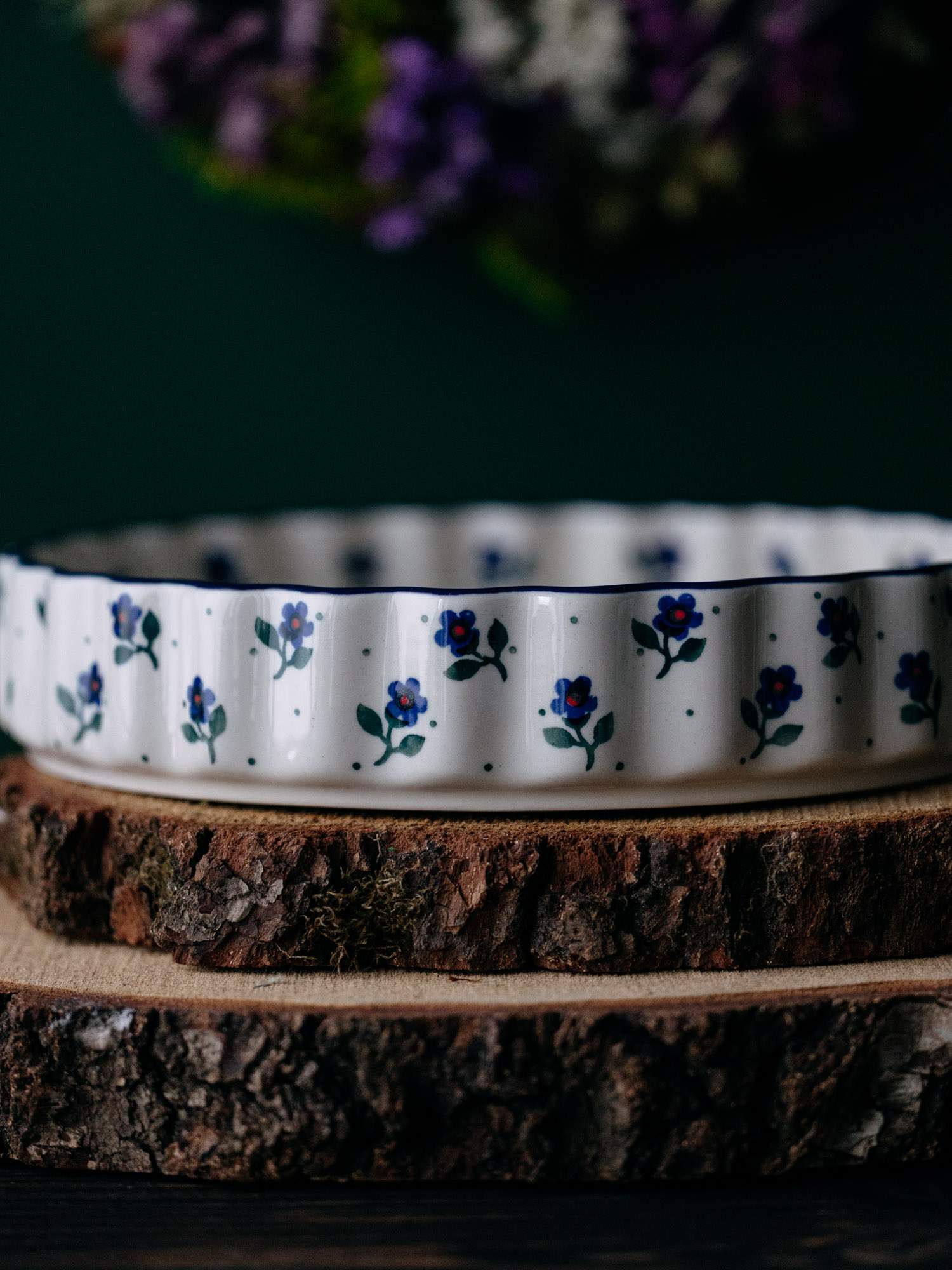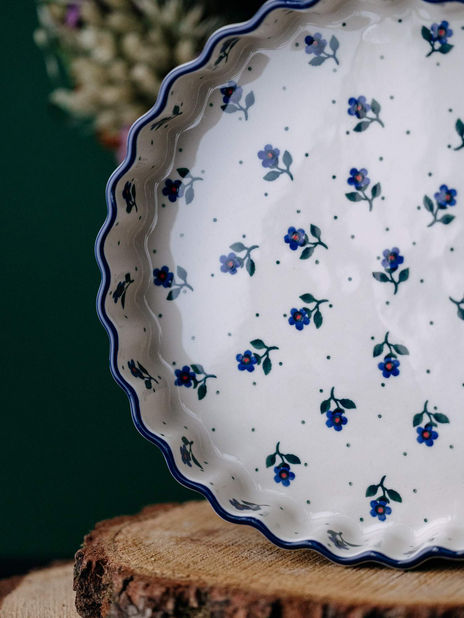 Okrągła forma do pieczenia tarty z falistym wykończeniem. Jasna ceramika została ozdobiona ręcznie, kobaltowo-zielonym wzorem kwiatków na nóżce. Szerokość naczynia zestawiono z niskimi ściankami, co pozwala na dokładne zapieczenie przyrządzanej potrawy. Forma do pieczenia została wykonana w „Ceramice Artystycznej” w Bolesławcu.