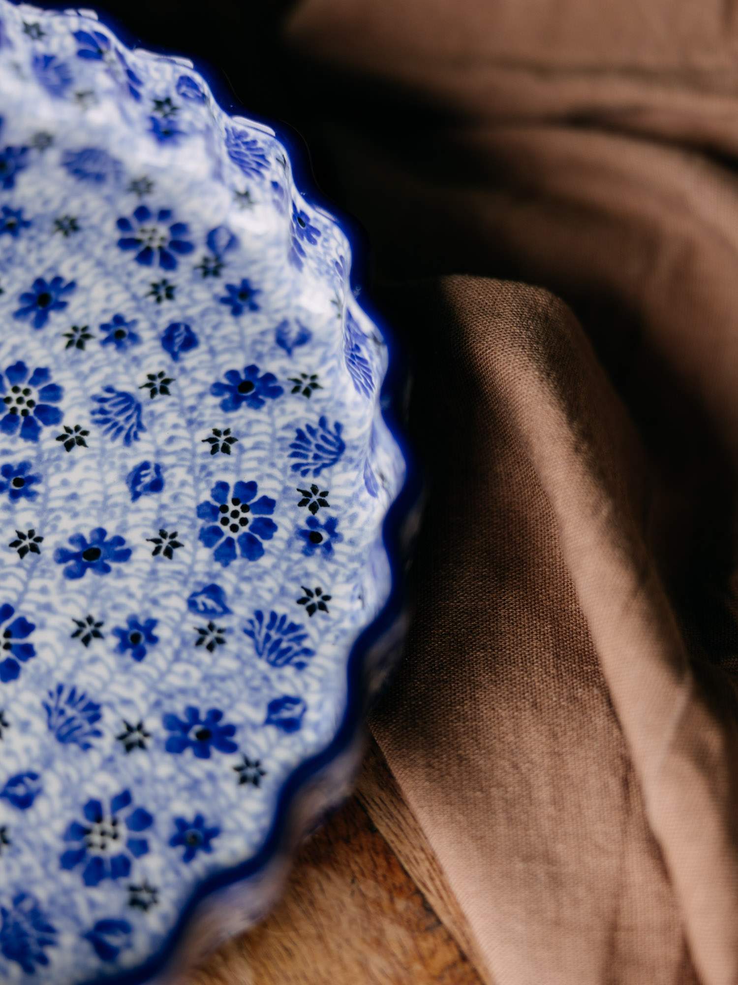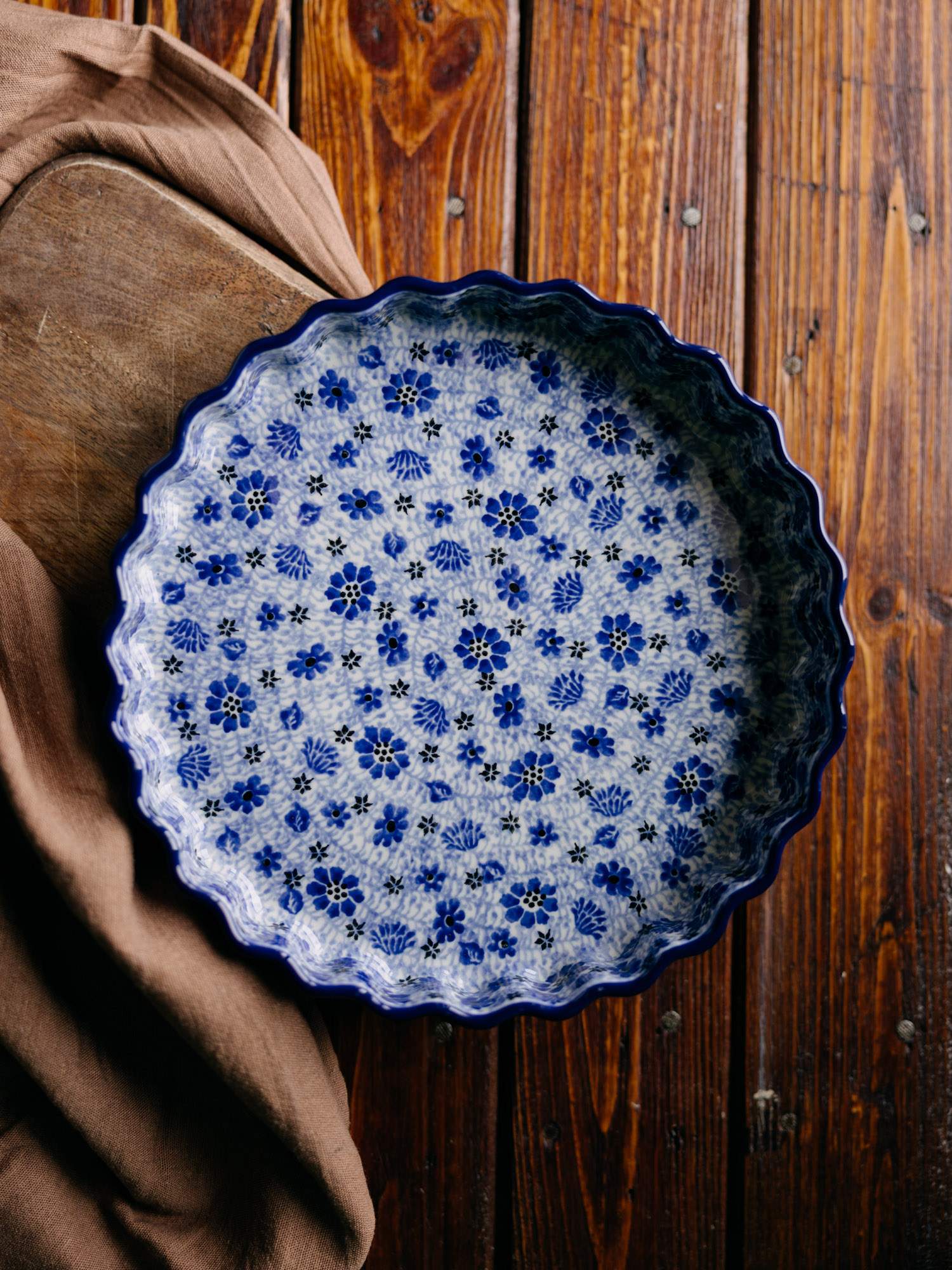 Okrągła forma do pieczenia tarty z falistym wykończeniem, gęsto ozdobiona niebiesko-kobaltowym wzorem kwiatowej łąki.