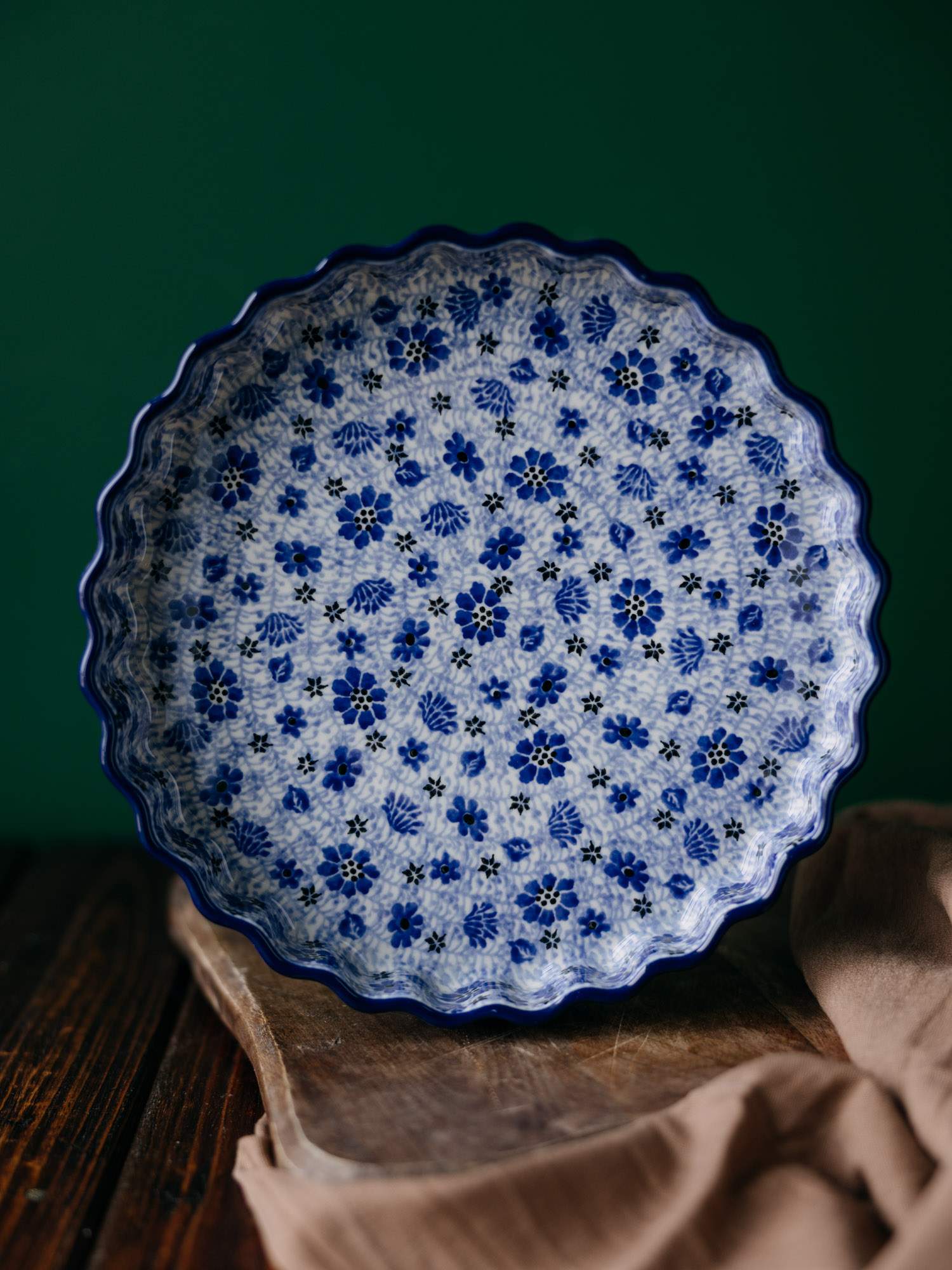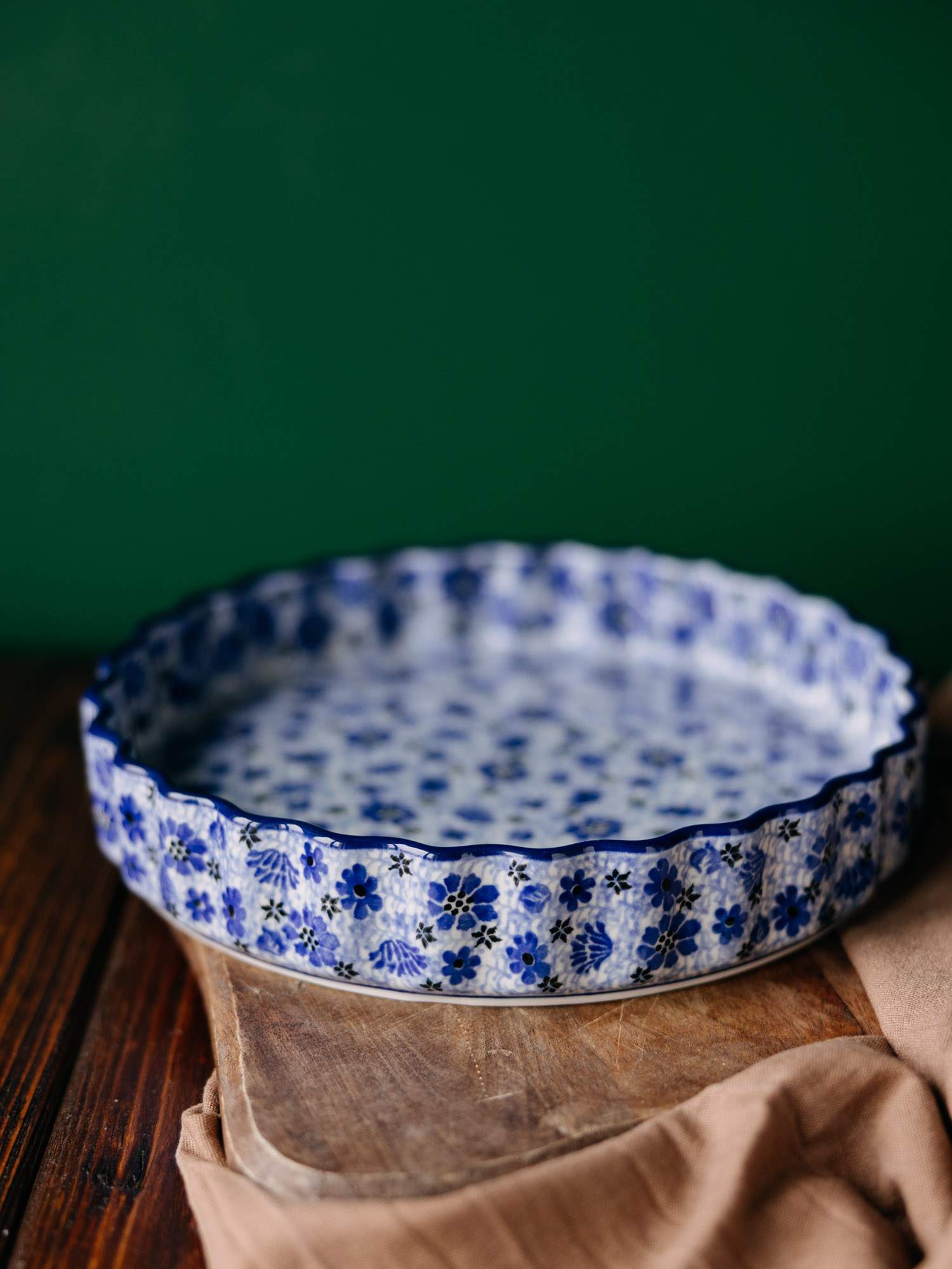 Okrągła forma do pieczenia tarty z falistym wykończeniem. Jasna ceramika została ozdobiona ręcznie, niebiesko-kobaltowym wzorem łąki. Szerokość naczynia zestawiono z niskimi ściankami, co pozwala na dokładne zapieczenie przyrządzanej potrawy. Forma do pieczenia została wykonana w „Ceramice Artystycznej” w Bolesławcu.