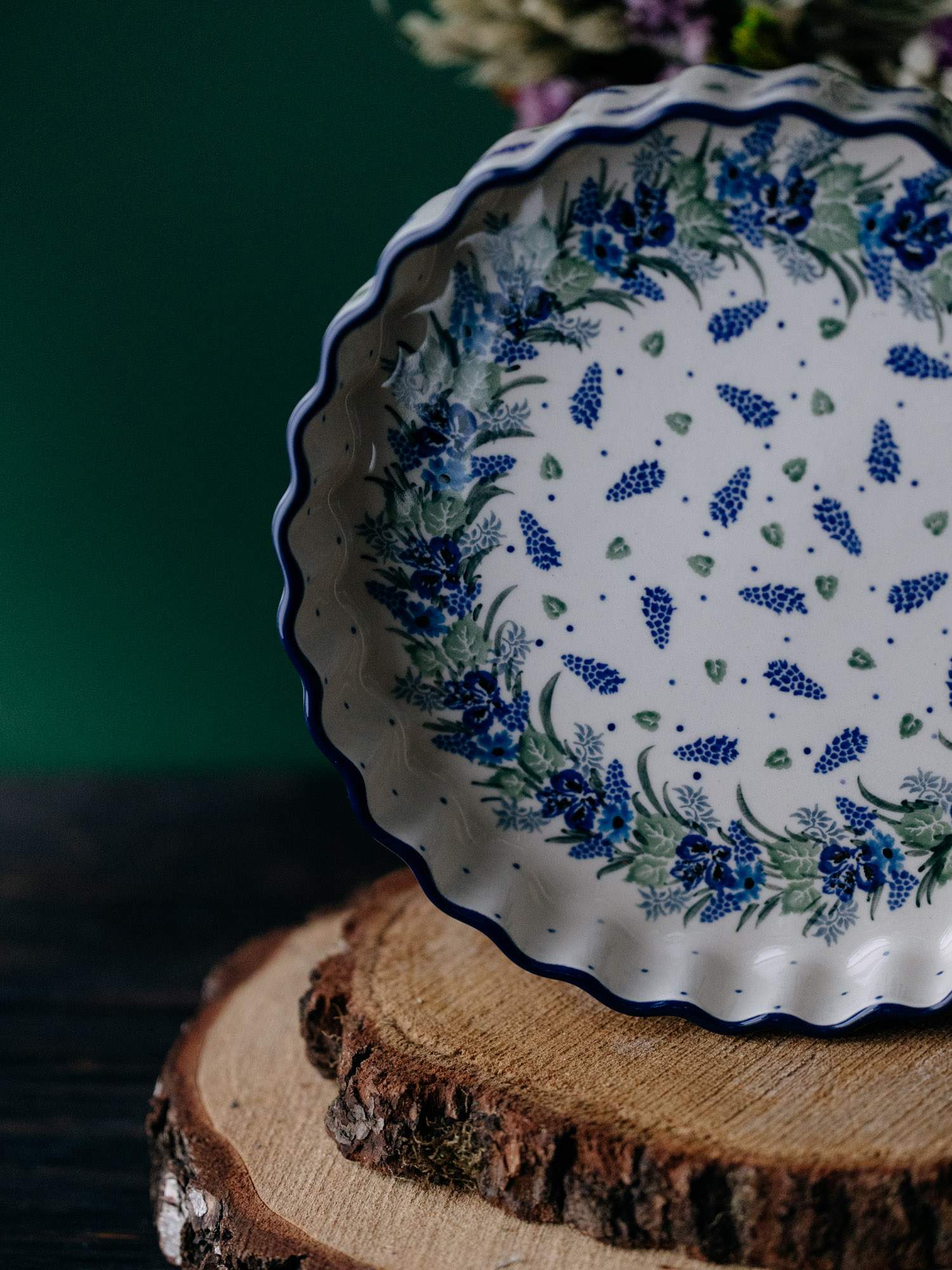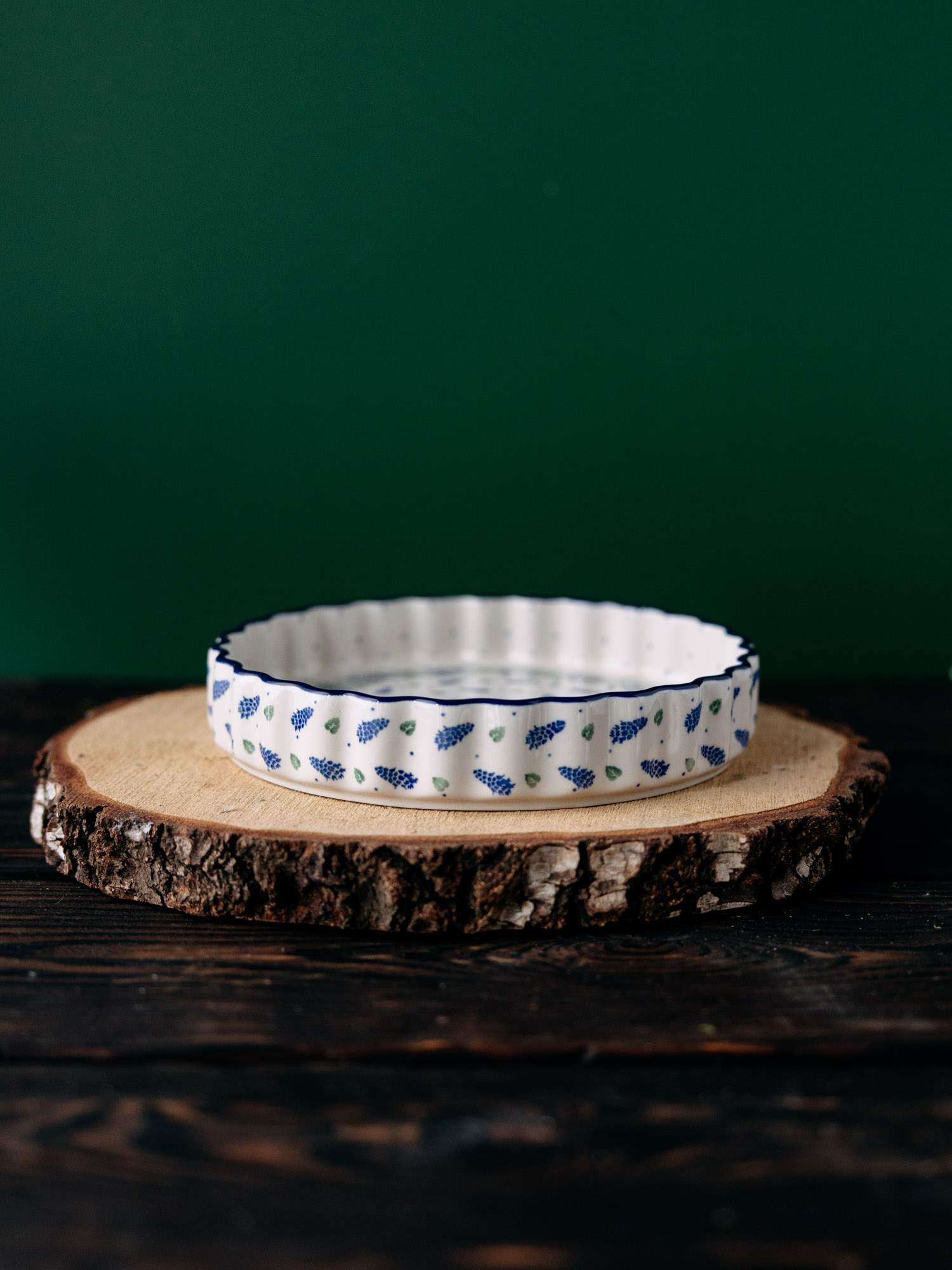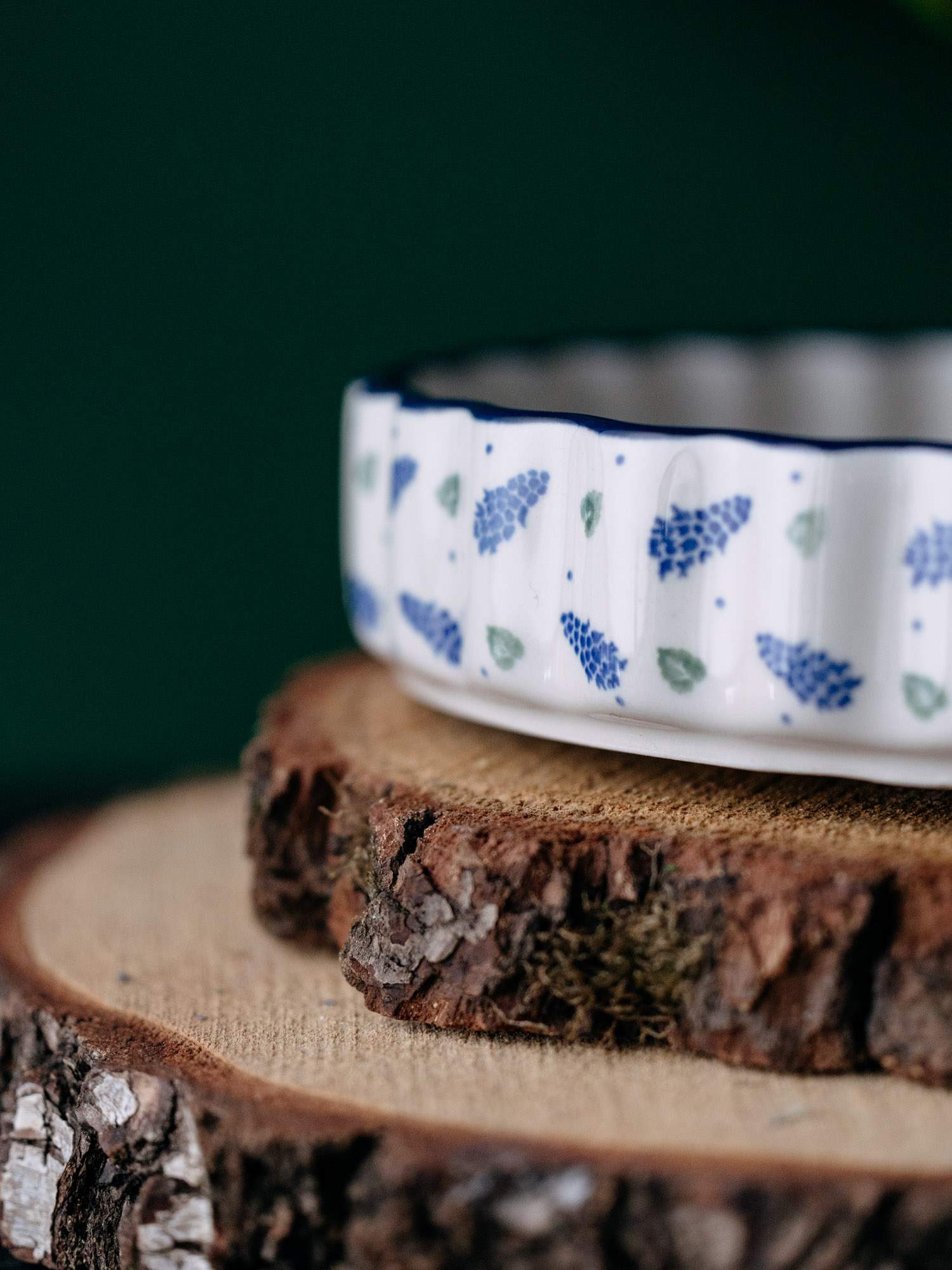 Okrągła forma do pieczenia tarty z falistym wykończeniem. Jasna ceramika została ozdobiona ręcznie, kobaltowo-zielonym wzorem wianka. Szerokość naczynia zestawiono z niskimi ściankami, co pozwala na dokładne zapieczenie przyrządzanej potrawy. Forma do pieczenia została wykonana w „Ceramice Artystycznej” w Bolesławcu.