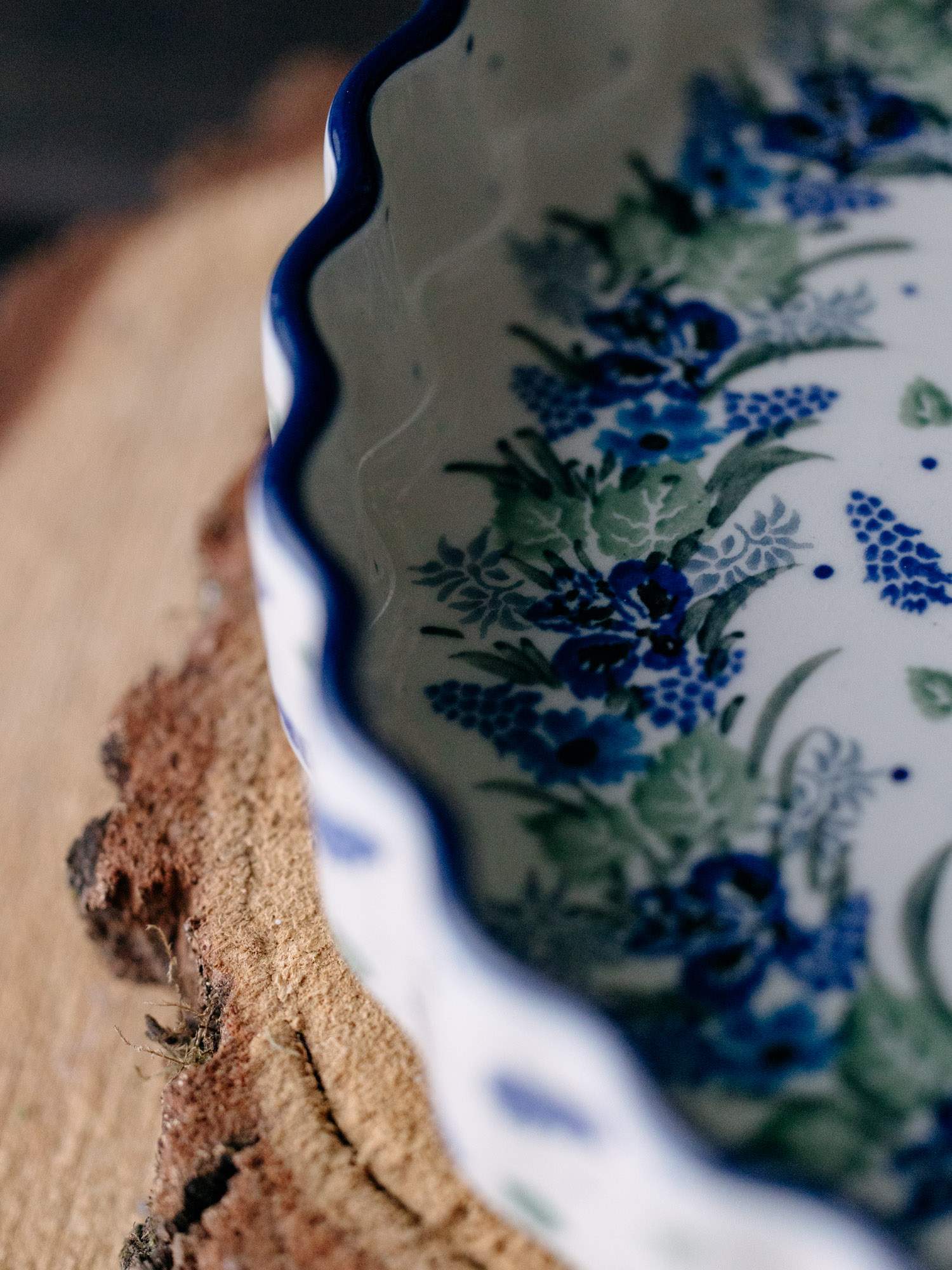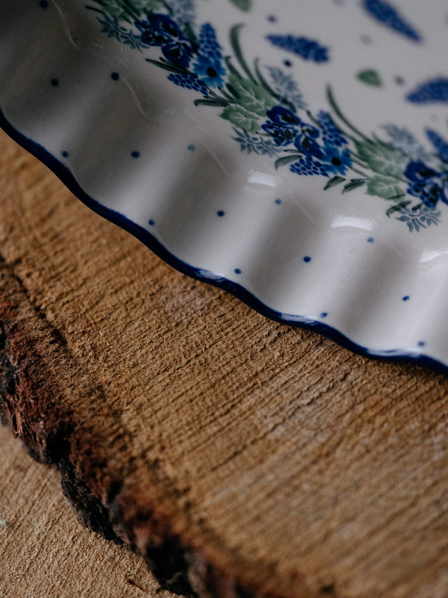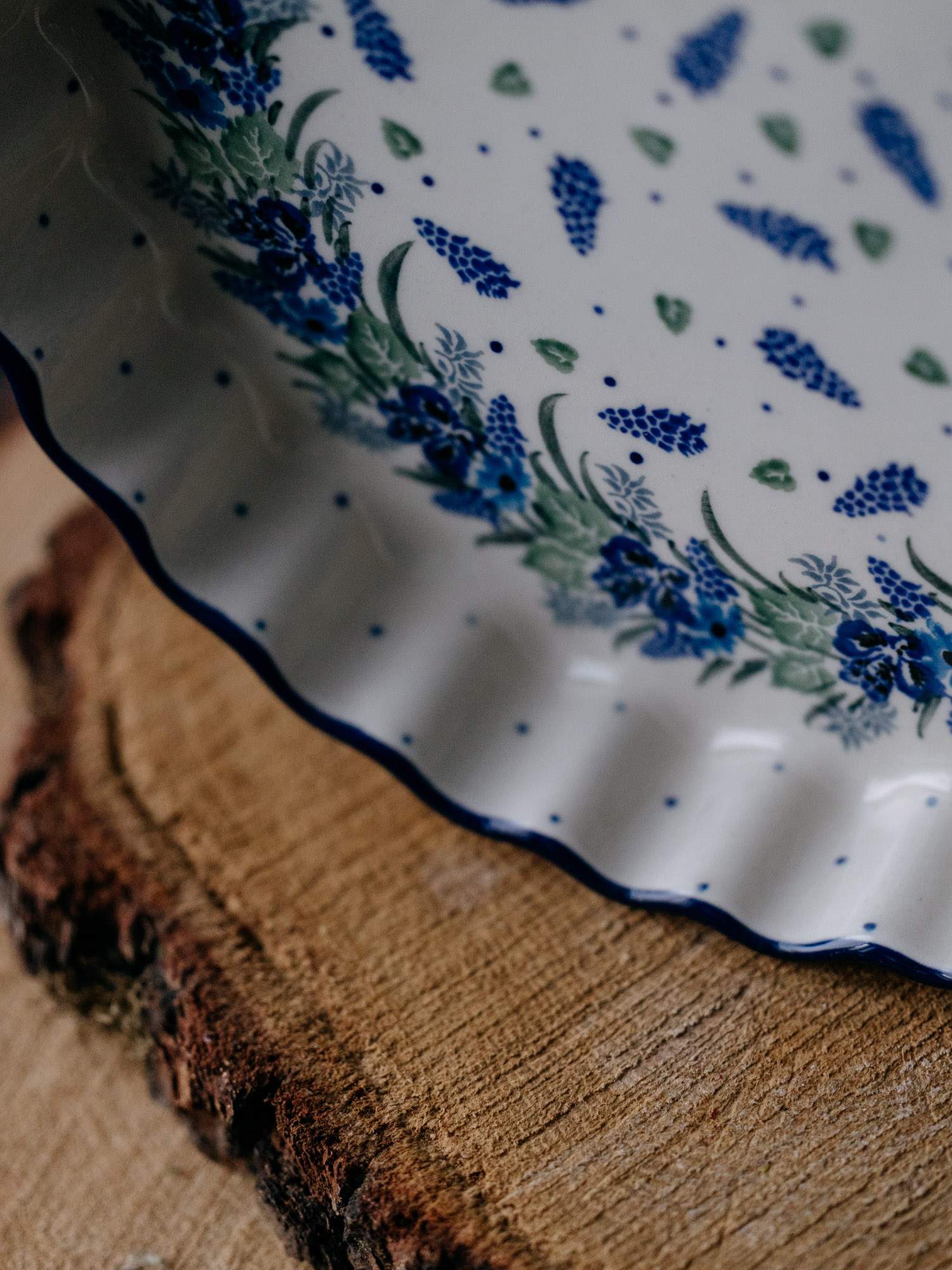 Okrągła forma do pieczenia tarty z falistym wykończeniem. Jasna ceramika została ozdobiona ręcznie, kobaltowo-zielonym wzorem wianka. Szerokość naczynia zestawiono z niskimi ściankami, co pozwala na dokładne zapieczenie przyrządzanej potrawy. Forma do pieczenia została wykonana w „Ceramice Artystycznej” w Bolesławcu.